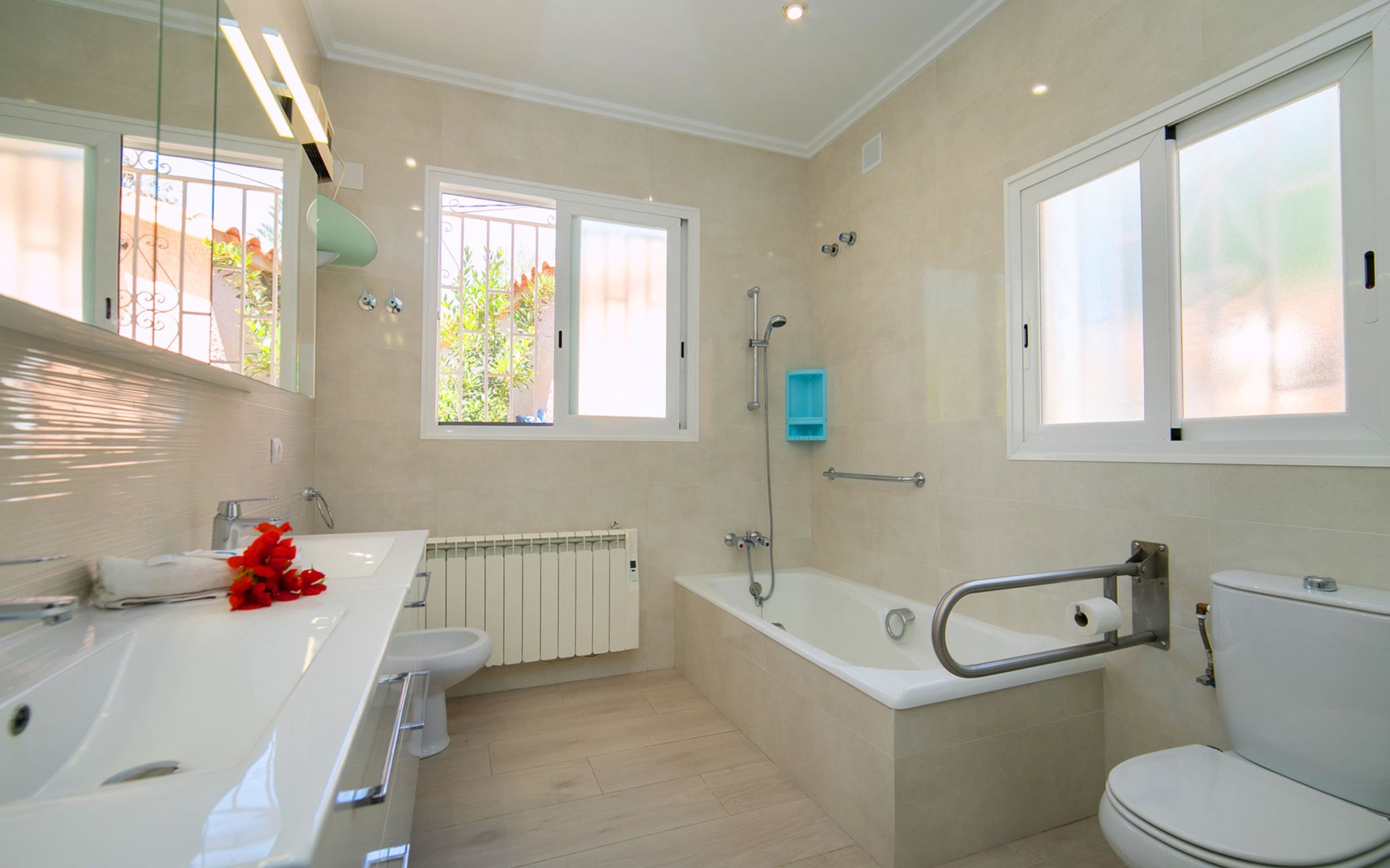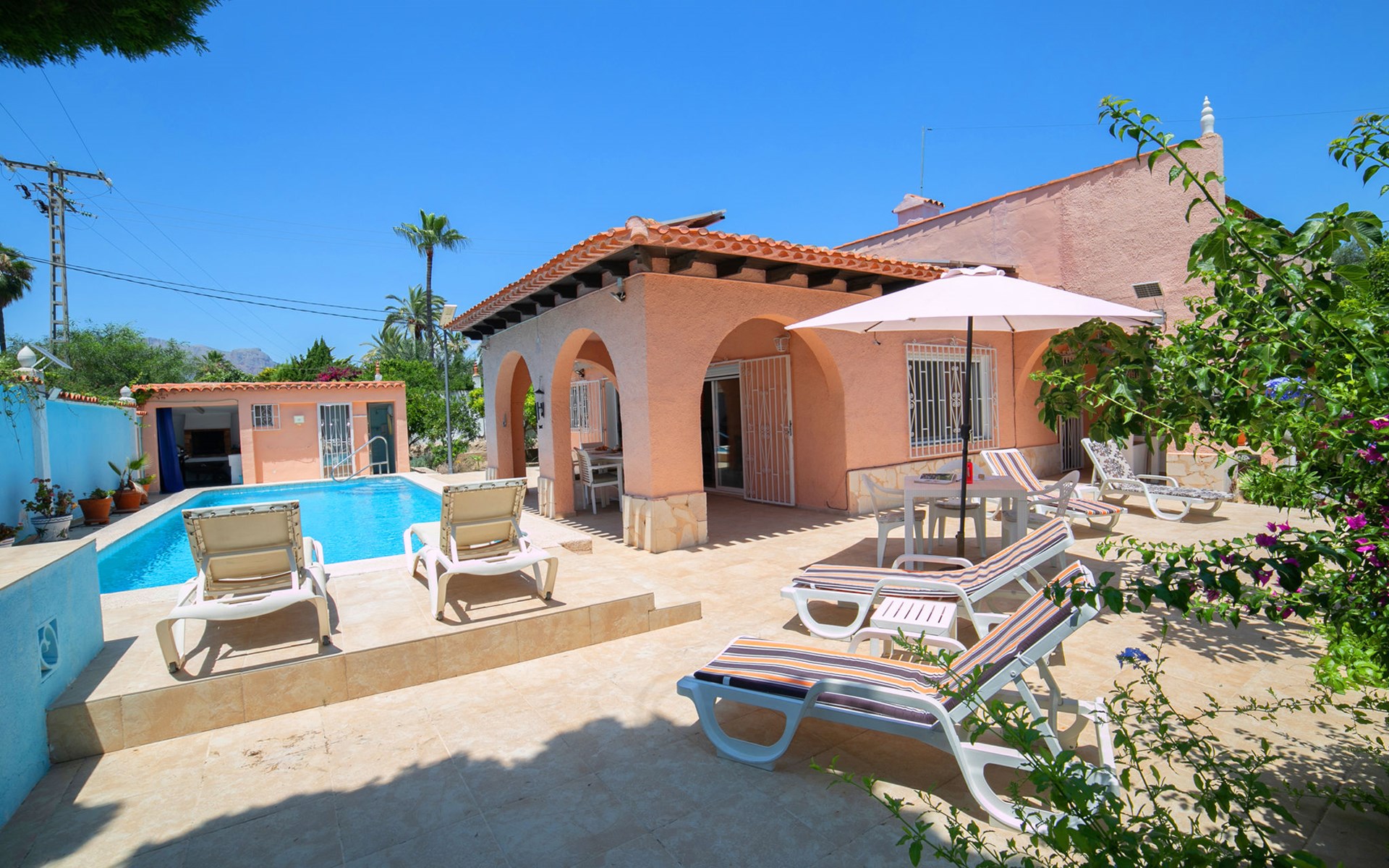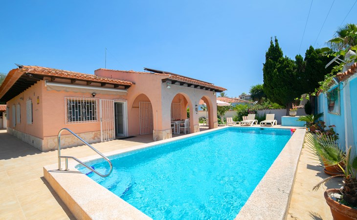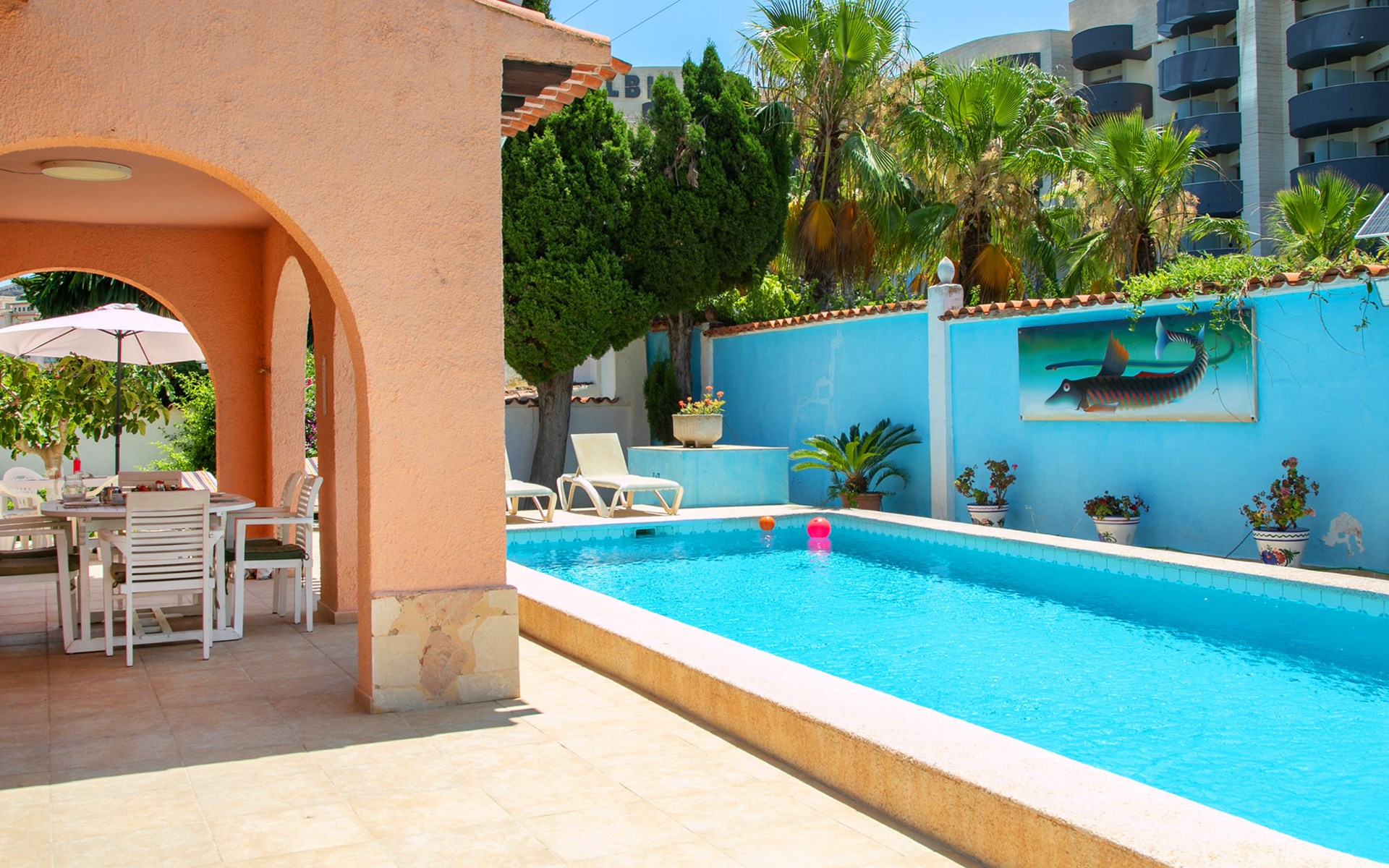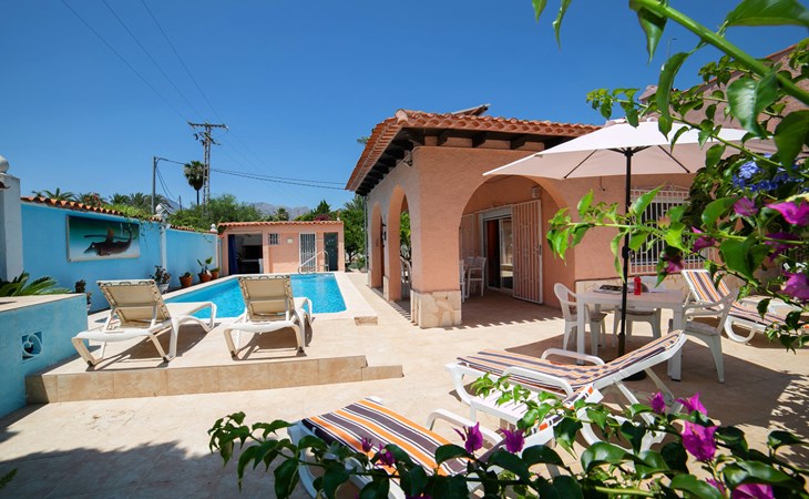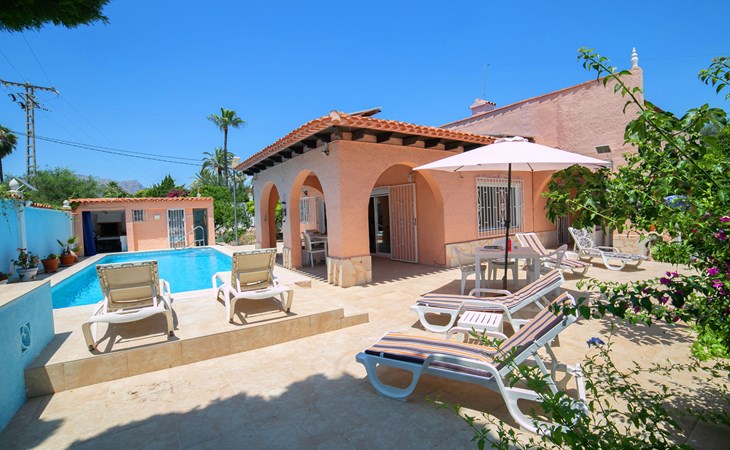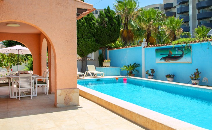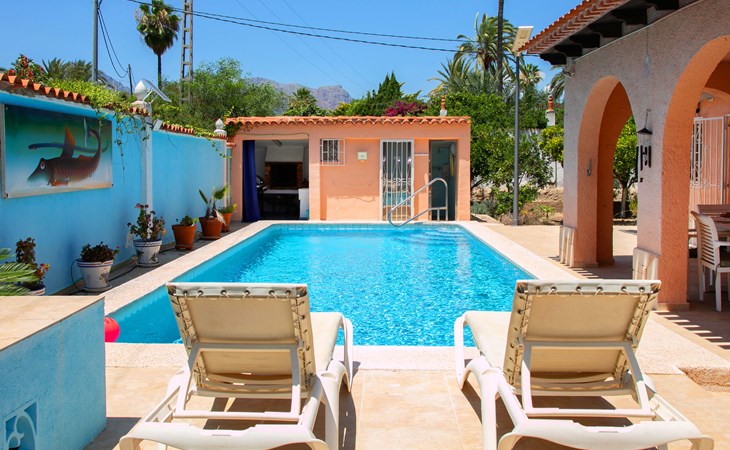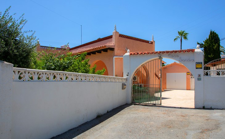 Playa Albir: Sehr grosses, sehr gemütliches, komfortables Haus "Sandra". Im Ort, 600 m vom Zentrum von Albir, sonnige Lage, 800 m vom Meer, 800 m vom Strand, in einer Sackgasse. Zur Alleinbenutzung: Grundstück 800 m2 (eingezäunt), grosser Garten mit Pflanzen, Obstgarten, Schwimmbad eckig (9 x 4 m, 150 - 230 cm tief, saisonale Verfügbarkeit: 01.Jan. - 31.Dez.) mit Innentreppe. Aussendusche, Laube, Pergola, Gartenmöbel, Grill, Parkplatz (für 3 Autos) auf dem Grundstück. Einkaufsgeschäft, Supermarkt 300 m, Einkaufszentrum 400 m, Restaurant, Bar, Café 300 m, Bushaltestelle "Albir" 800 m, Bahnstation "Albir", Sandstrand "Benidorm" 8 km, Kieselstrand "Albir" 800 m. Golfplatz (18 Loch) 8 km, Wanderwege ab Haus 800 m. Nahe gelegene Sehenswürdigkeiten: Benidorm Palace 8 km, Aqualandia 8 km, Mundomar 8 km, Terra Mitica 10 km, Terra Natura 10 km, Alicante 45 km. Bitte beachten: Babyausstattung auf Anfrage. Der Besitzer akzeptiert keine Jugendgruppen. Wichtig für Rollstuhlfahrer: Die Haupteingangstüre ist 82 cm breit, die Türen drinnen 70 cm. Breite des Korridors: mind. 95 cm, Bad 2.4 x 3.6 m. Schwimmbecken: um 30 cm erhöht.
