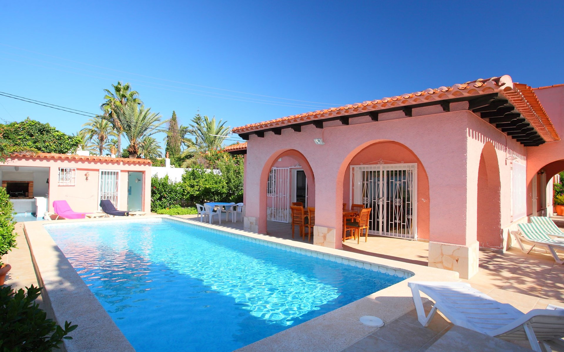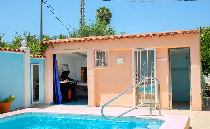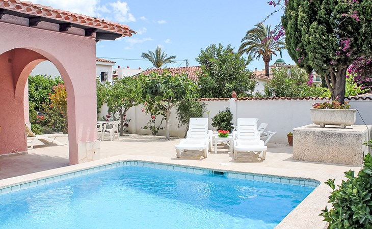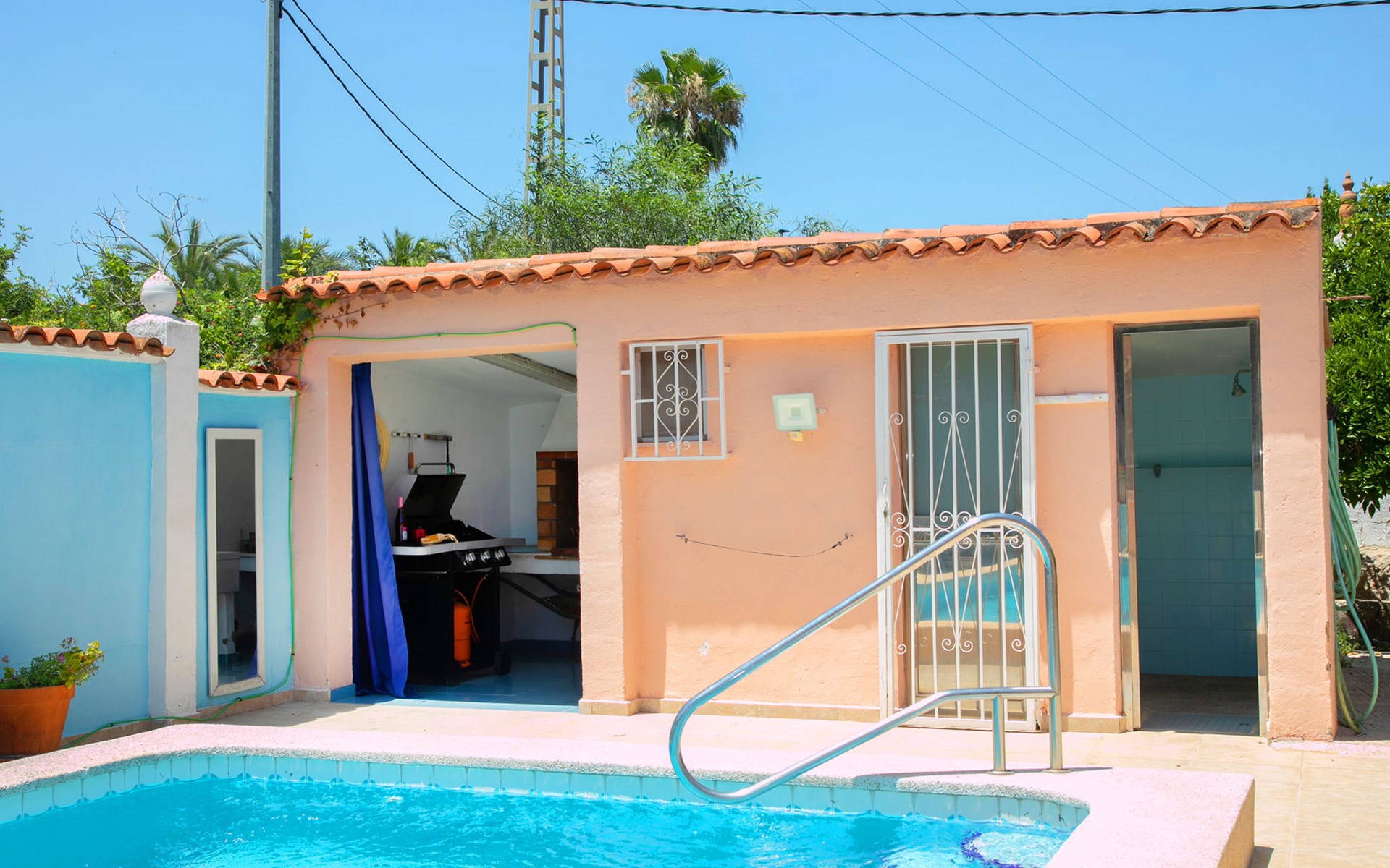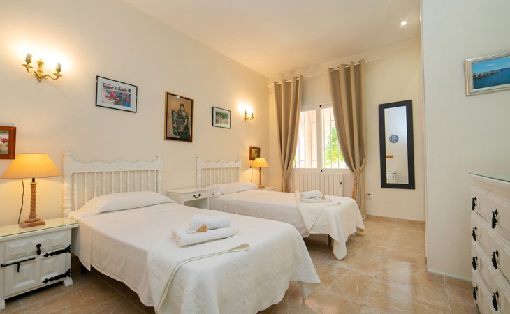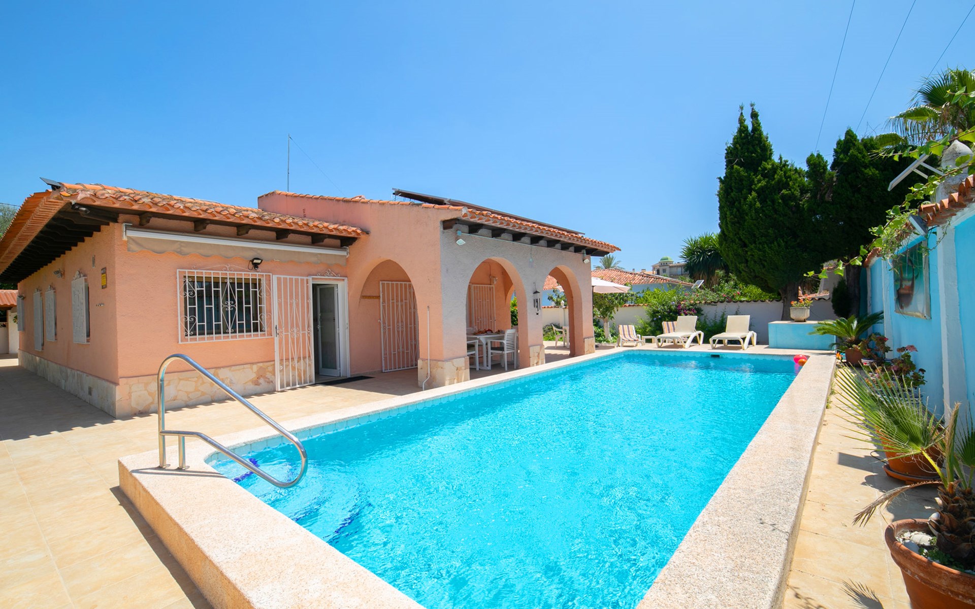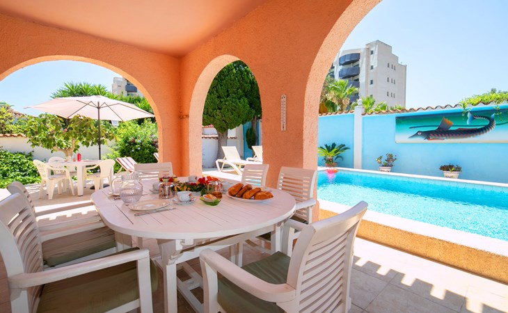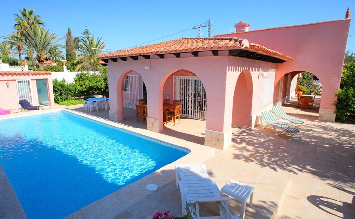 Playa Albir: Sehr grosses, sehr gemütliches, komfortables Haus "Sandra". Im Ort, 600 m vom Zentrum von Albir, sonnige Lage, 800 m vom Meer, 800 m vom Strand, in einer Sackgasse. Zur Alleinbenutzung: Grundstück 800 m2 (eingezäunt), grosser Garten mit Pflanzen, Obstgarten, Schwimmbad eckig (9 x 4 m, 150 - 230 cm tief, saisonale Verfügbarkeit: 01.Jan. - 31.Dez.) mit Innentreppe. Aussendusche, Laube, Pergola, Gartenmöbel, Grill, Parkplatz (für 3 Autos) auf dem Grundstück. Einkaufsgeschäft, Supermarkt 300 m, Einkaufszentrum 400 m, Restaurant, Bar, Café 300 m, Bushaltestelle "Albir" 800 m, Bahnstation "Albir", Sandstrand "Benidorm" 8 km, Kieselstrand "Albir" 800 m. Golfplatz (18 Loch) 8 km, Wanderwege ab Haus 800 m. Nahe gelegene Sehenswürdigkeiten: Benidorm Palace 8 km, Aqualandia 8 km, Mundomar 8 km, Terra Mitica 10 km, Terra Natura 10 km, Alicante 45 km. Bitte beachten: Babyausstattung auf Anfrage. Der Besitzer akzeptiert keine Jugendgruppen. Wichtig für Rollstuhlfahrer: Die Haupteingangstüre ist 82 cm breit, die Türen drinnen 70 cm. Breite des Korridors: mind. 95 cm, Bad 2.4 x 3.6 m. Schwimmbecken: um 30 cm erhöht.