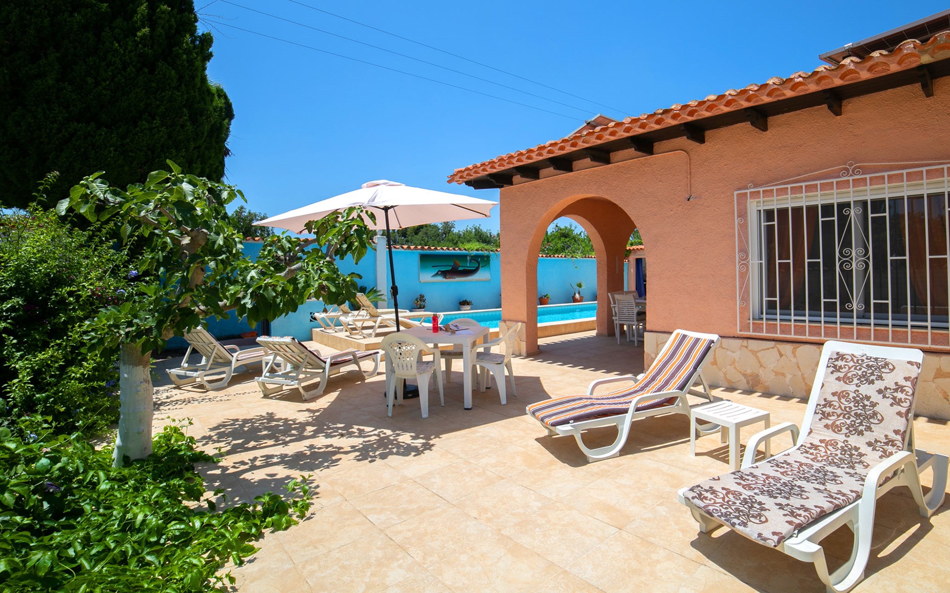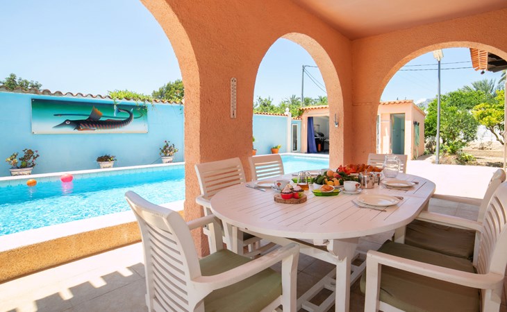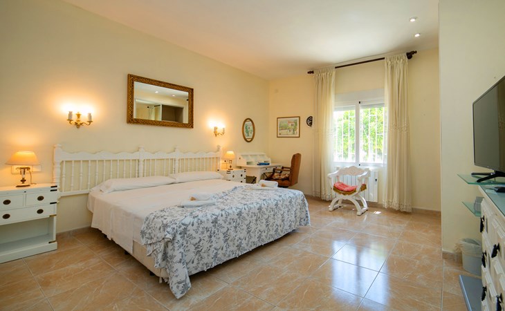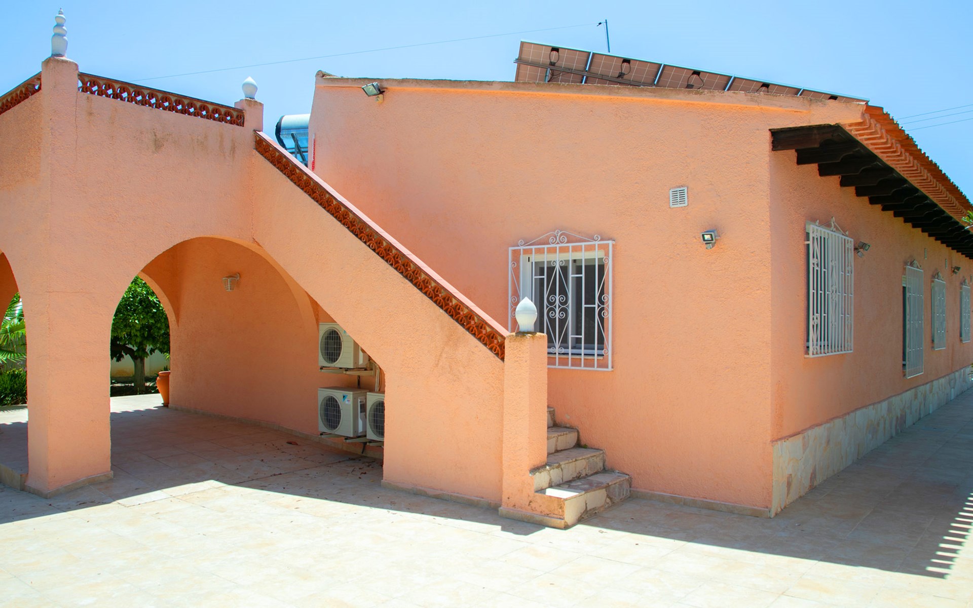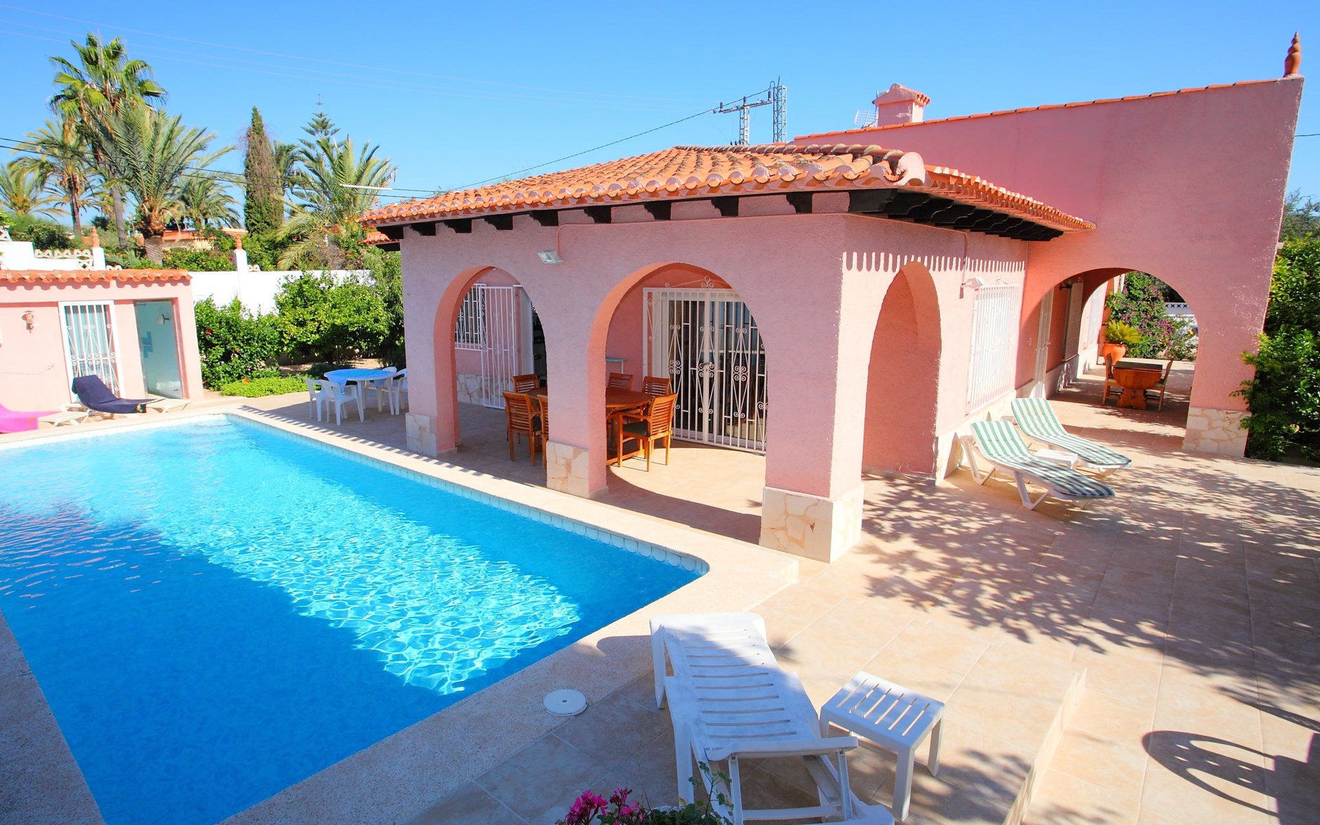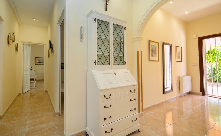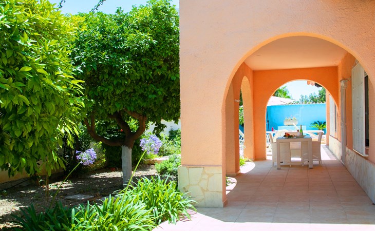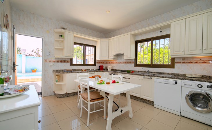 Playa Albir: Sehr grosses, sehr gemütliches, komfortables Haus "Sandra". Im Ort, 600 m vom Zentrum von Albir, sonnige Lage, 800 m vom Meer, 800 m vom Strand, in einer Sackgasse. Zur Alleinbenutzung: Grundstück 800 m2 (eingezäunt), grosser Garten mit Pflanzen, Obstgarten, Schwimmbad eckig (9 x 4 m, 150 - 230 cm tief, saisonale Verfügbarkeit: 01.Jan. - 31.Dez.) mit Innentreppe. Aussendusche, Laube, Pergola, Gartenmöbel, Grill, Parkplatz (für 3 Autos) auf dem Grundstück. Einkaufsgeschäft, Supermarkt 300 m, Einkaufszentrum 400 m, Restaurant, Bar, Café 300 m, Bushaltestelle "Albir" 800 m, Bahnstation "Albir", Sandstrand "Benidorm" 8 km, Kieselstrand "Albir" 800 m. Golfplatz (18 Loch) 8 km, Wanderwege ab Haus 800 m. Nahe gelegene Sehenswürdigkeiten: Benidorm Palace 8 km, Aqualandia 8 km, Mundomar 8 km, Terra Mitica 10 km, Terra Natura 10 km, Alicante 45 km. Bitte beachten: Babyausstattung auf Anfrage. Der Besitzer akzeptiert keine Jugendgruppen. Wichtig für Rollstuhlfahrer: Die Haupteingangstüre ist 82 cm breit, die Türen drinnen 70 cm. Breite des Korridors: mind. 95 cm, Bad 2.4 x 3.6 m. Schwimmbecken: um 30 cm erhöht.