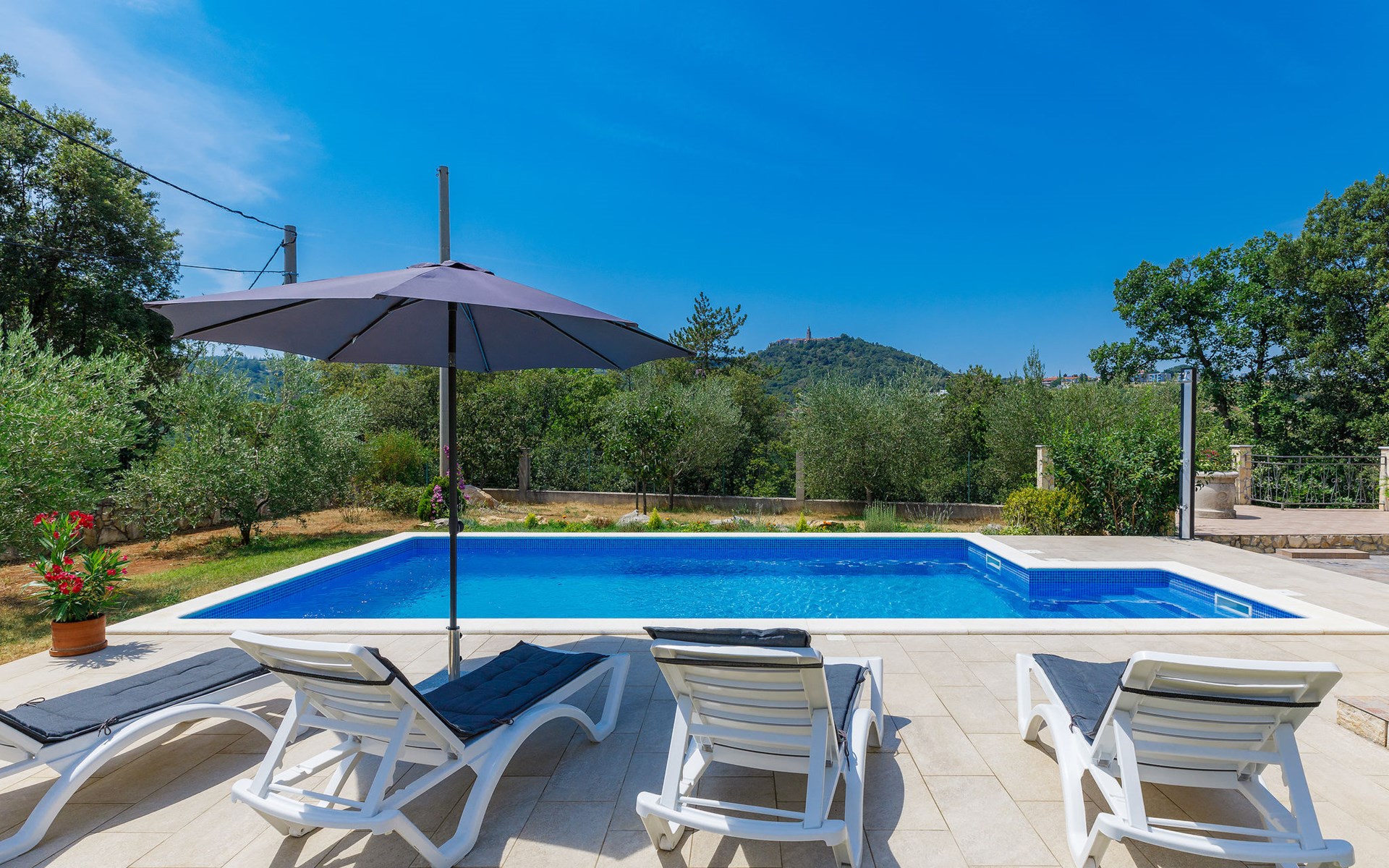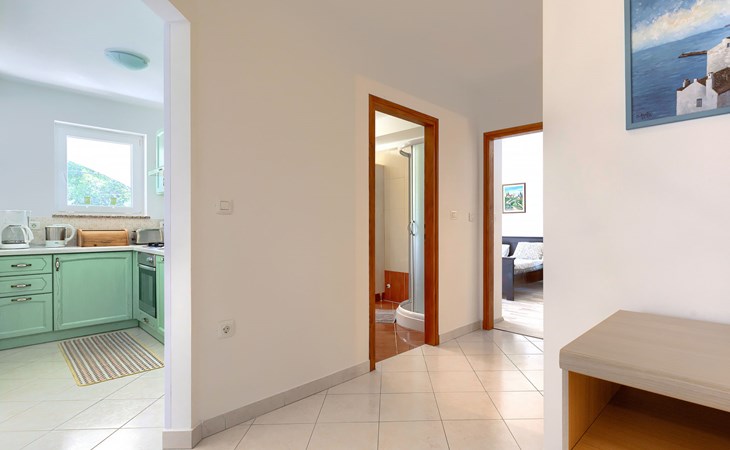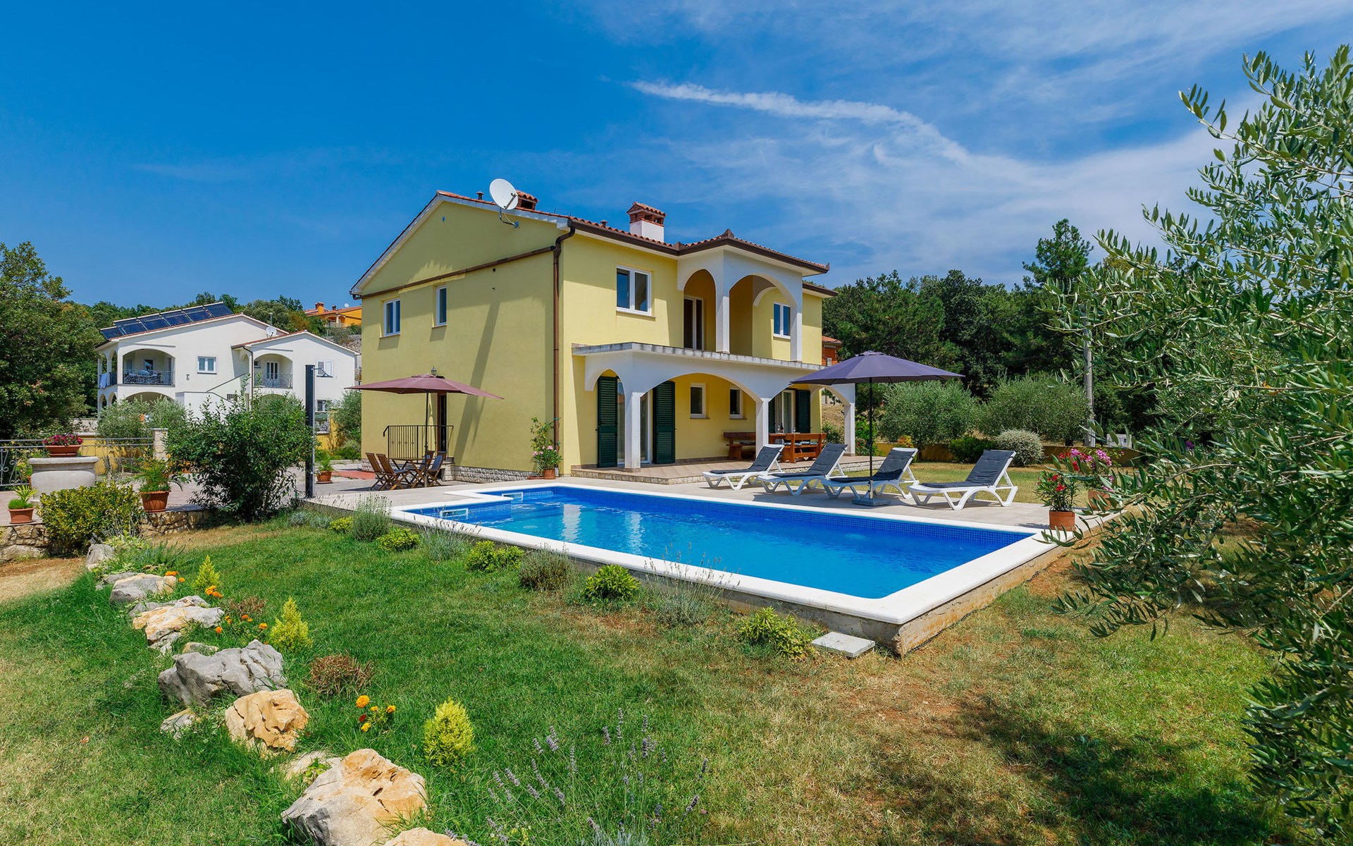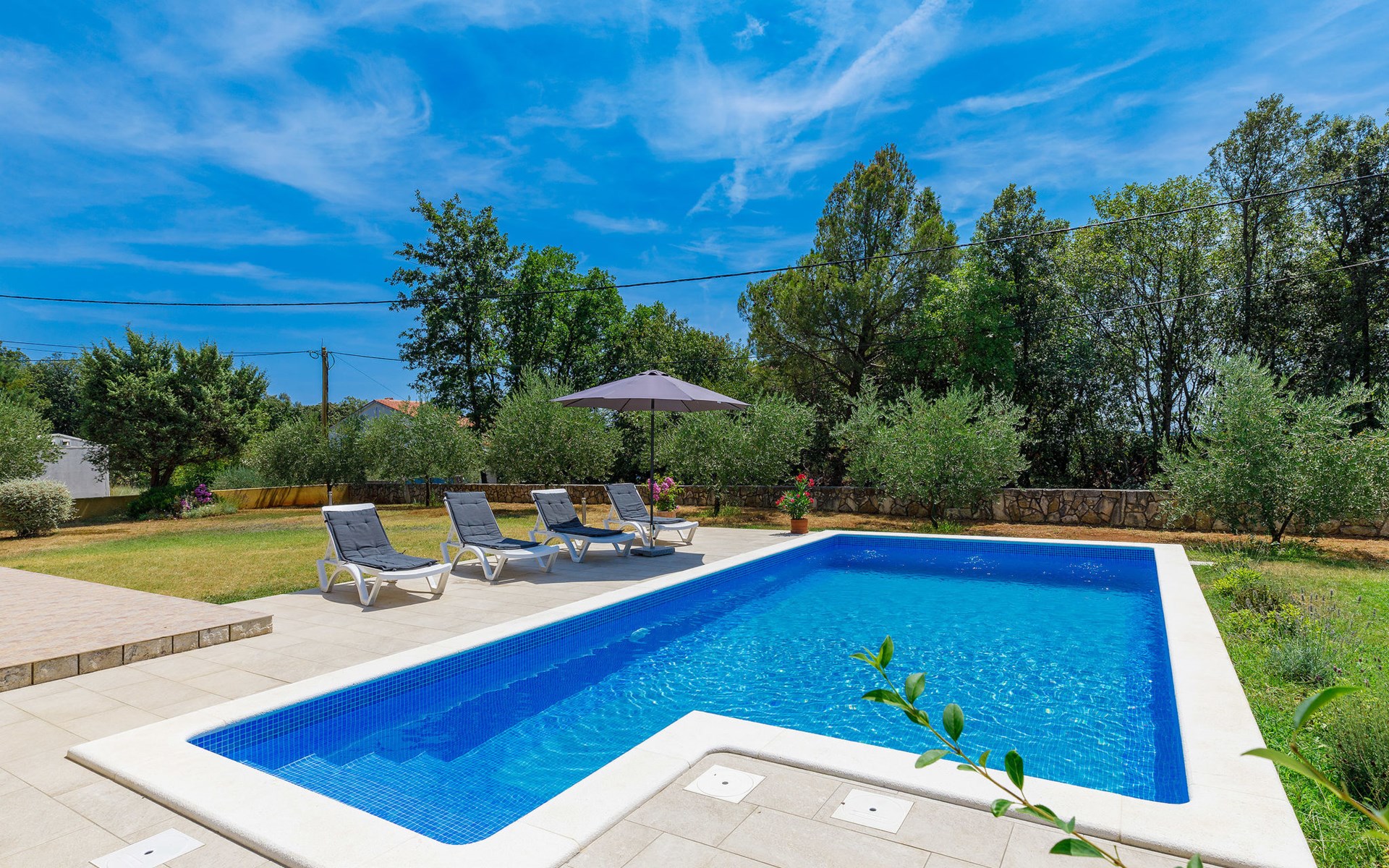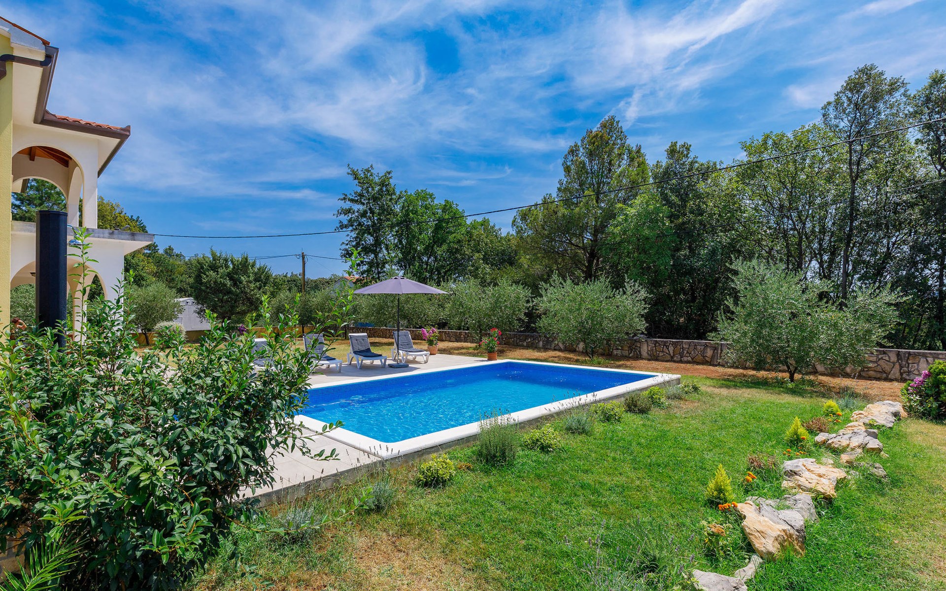 Einfamilienhaus "Carla". Im Ortsteil Smolići, 1.5 km vom Zentrum von Labin, 3 km vom Zentrum von Rabac, 3 km vom Meer, 3 km vom Strand. Zur Alleinbenutzung: Grundstück 1'200 m2 (eingezäunt) mit Rasen, Schwimmbad eckig (7 x 4 m, 140 cm tief, saisonale Verfügbarkeit: 29.Apr. - 26.Nov.) mit Innentreppe. Im Hause: Internetzugang, Waschmaschine. Parkplatz (für 2 Autos) auf dem Grundstück. Einkaufsgeschäft 1.5 km, Supermarkt 2 km, Restaurant 500 m, Bushaltestelle 2.2 km, Kieselstrand 3 km, Felsstrand 3 km. Bitte beachten: Das 1. Stockwerk ist geschlossen und nicht bewohnt.