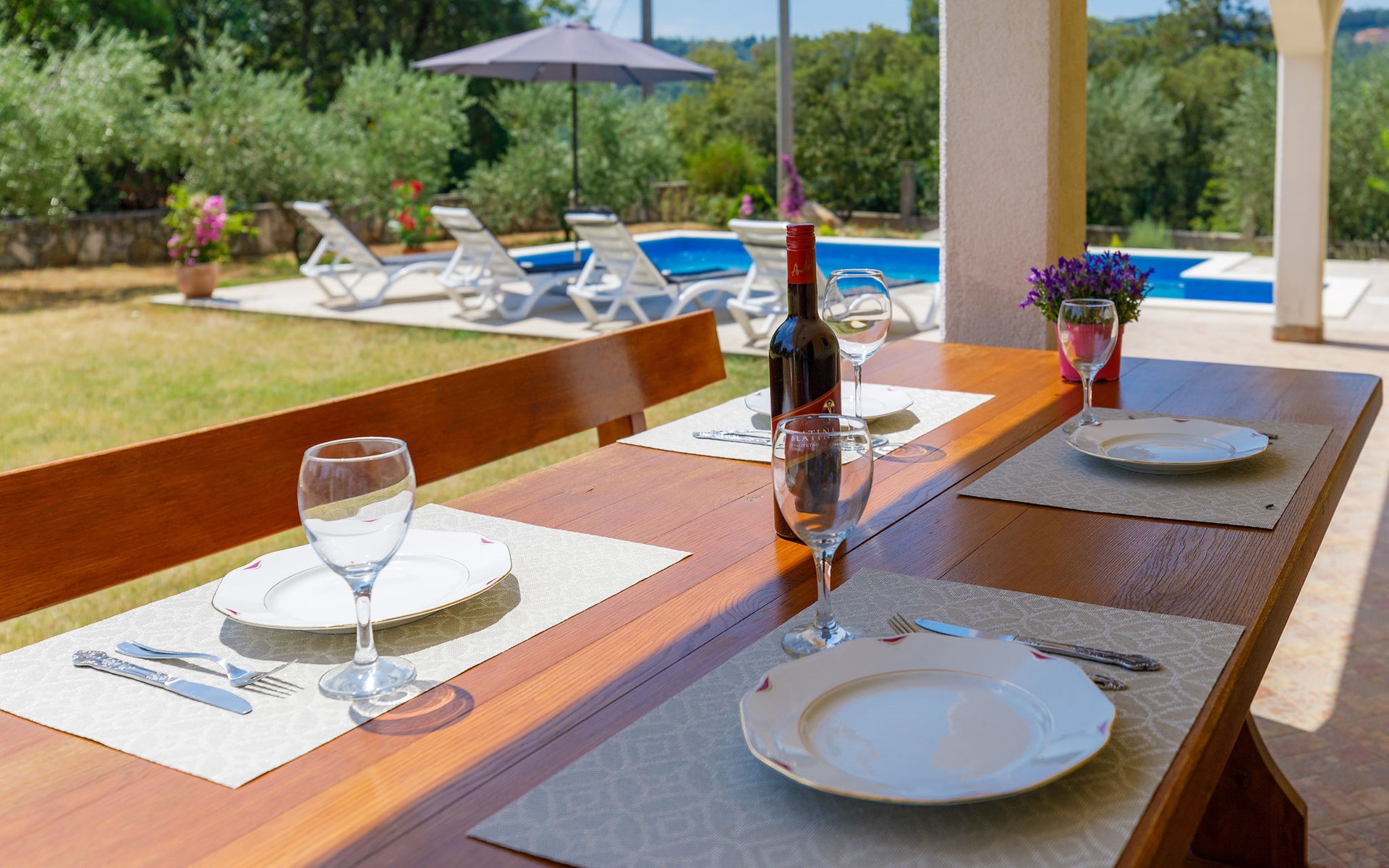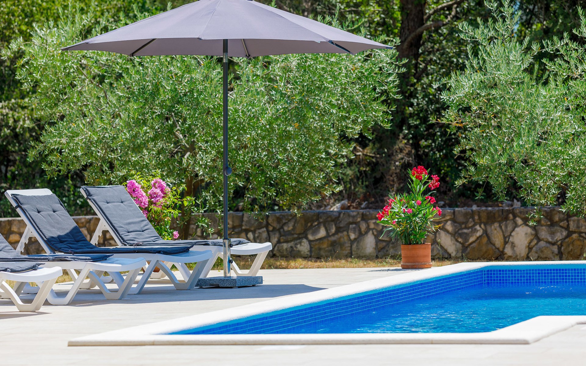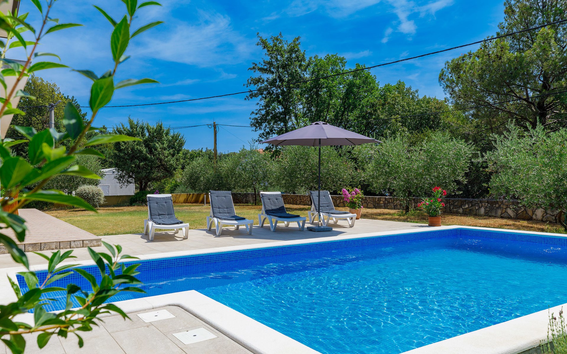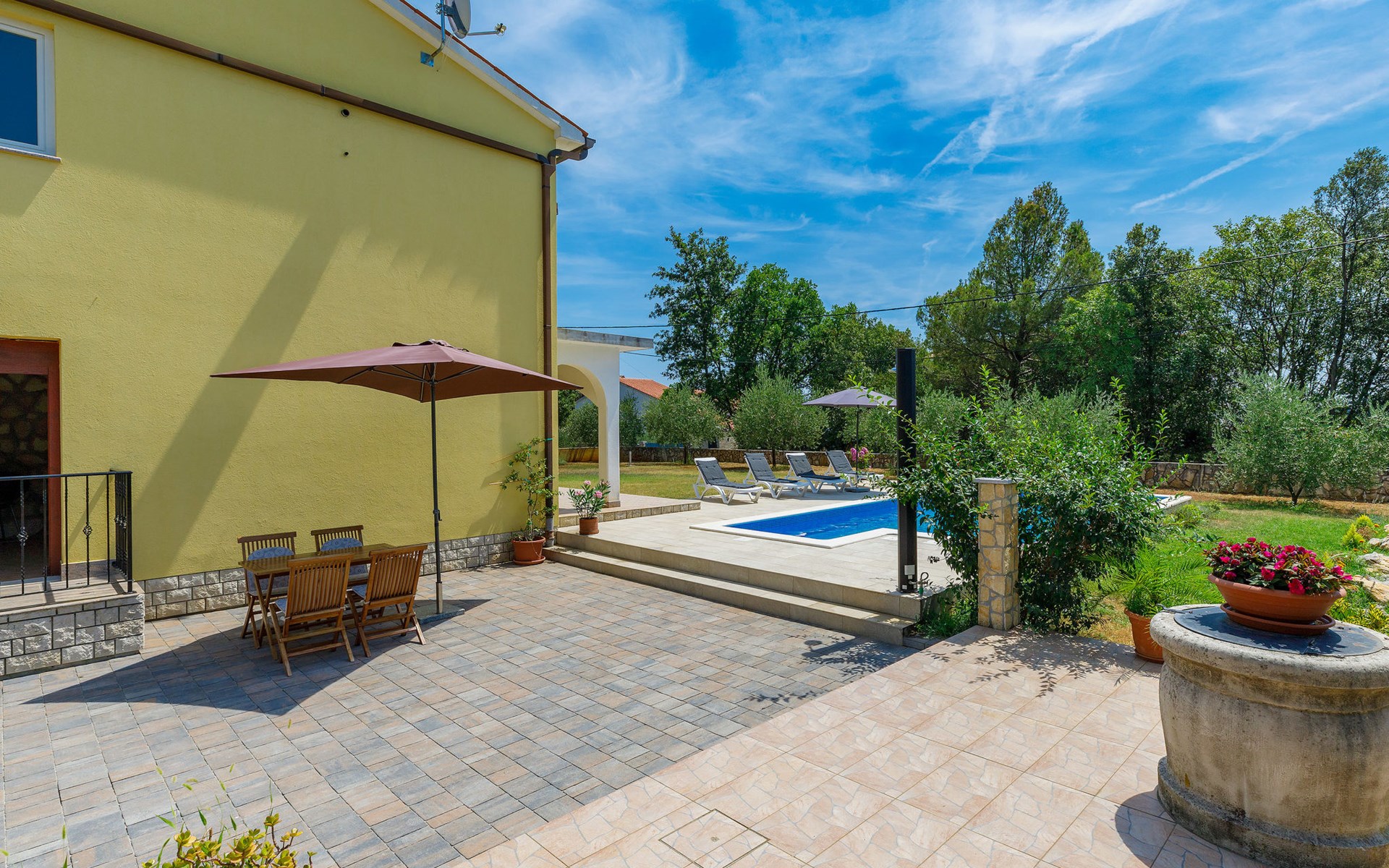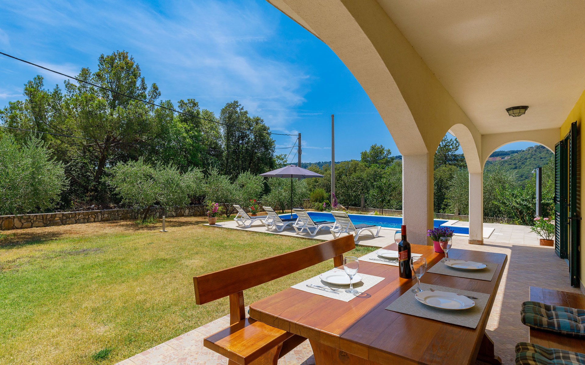 Einfamilienhaus "Carla". Im Ortsteil Smolići, 1.5 km vom Zentrum von Labin, 3 km vom Zentrum von Rabac, 3 km vom Meer, 3 km vom Strand. Zur Alleinbenutzung: Grundstück 1'200 m2 (eingezäunt) mit Rasen, Schwimmbad eckig (7 x 4 m, 140 cm tief, saisonale Verfügbarkeit: 29.Apr. - 26.Nov.) mit Innentreppe. Im Hause: Internetzugang, Waschmaschine. Parkplatz (für 2 Autos) auf dem Grundstück. Einkaufsgeschäft 1.5 km, Supermarkt 2 km, Restaurant 500 m, Bushaltestelle 2.2 km, Kieselstrand 3 km, Felsstrand 3 km. Bitte beachten: Das 1. Stockwerk ist geschlossen und nicht bewohnt.
