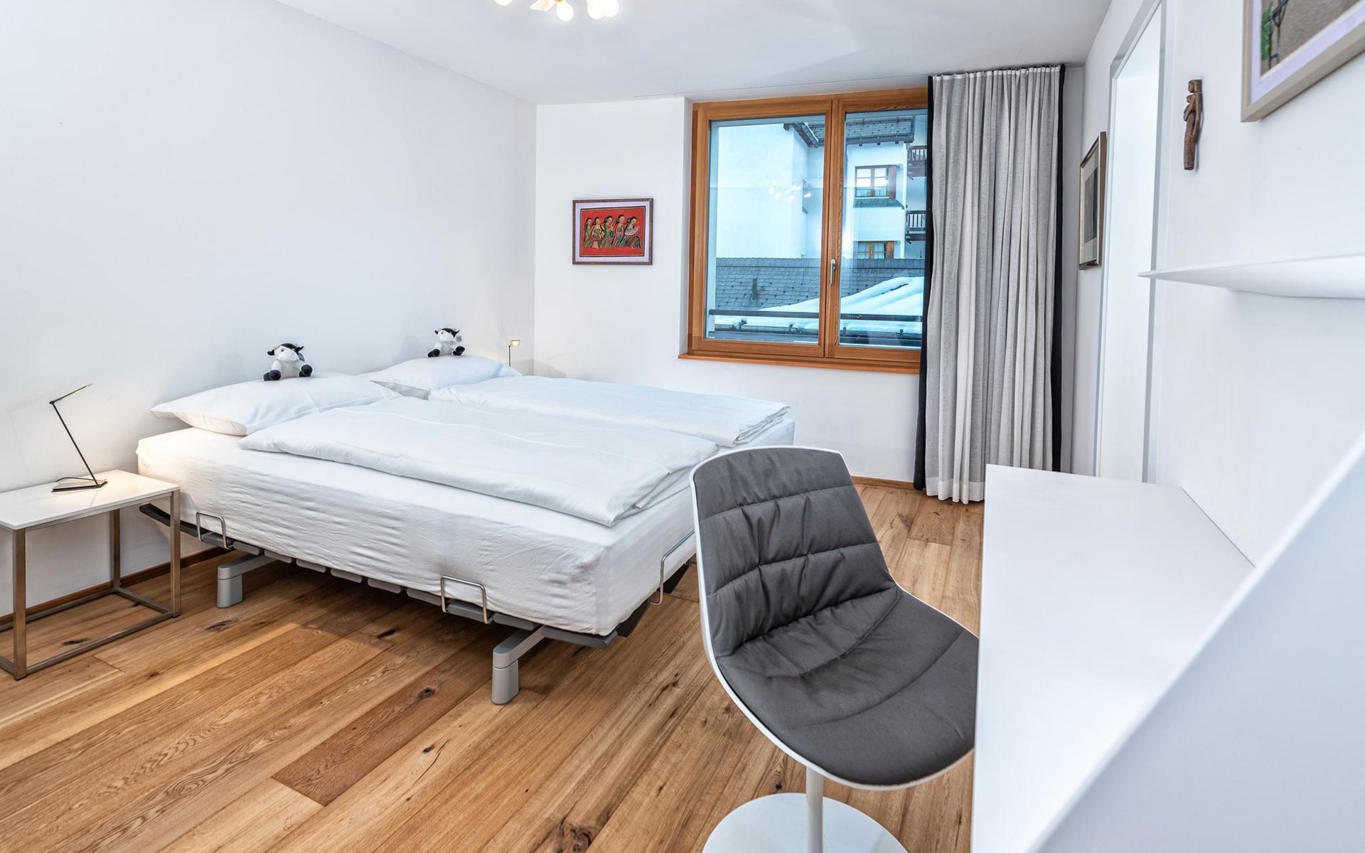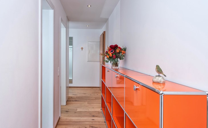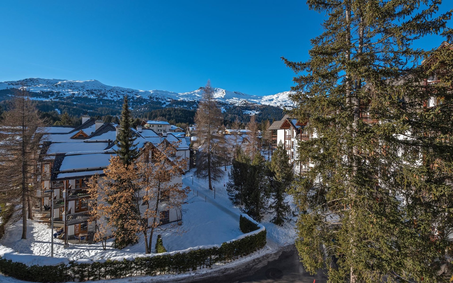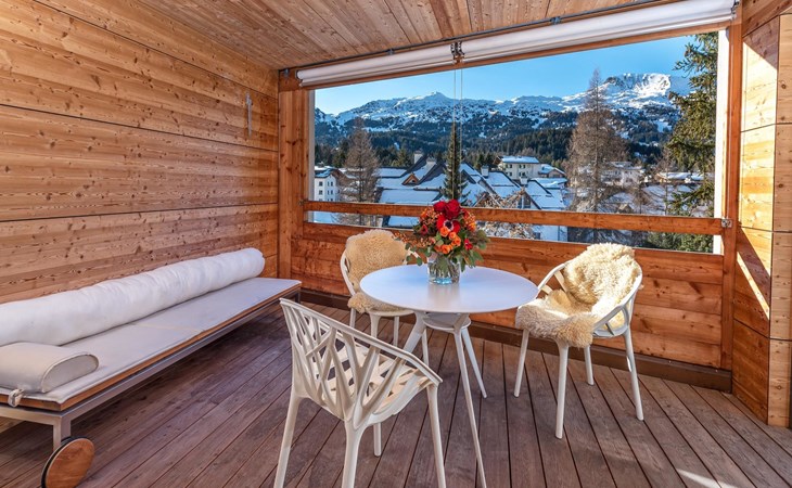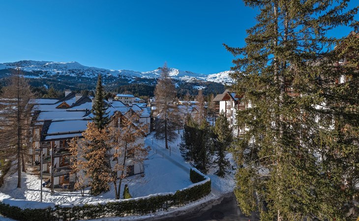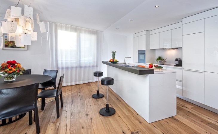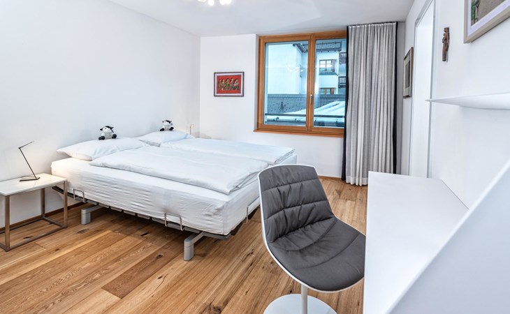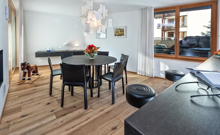 Geräumige ca. 129 m², ein durchgehend massiver Eichen-Parkettboden, eine weisse Architekten-Küche mit Bartheke, ein offener, verglaster Kamin, Tageslicht-Badezimmer mit Ausblick auf das Rothorn und die sonnige und ruhige Westlage im 2. Obergeschoss, verleihen der Wohnung einen beeindruckenden Charme. Ein Schlafzimmer mit Doppelbett und en-suite Bad sowie ein weiteres Schlafzimmer mit Doppelbett und separatem Bad sorgen für Ihren Schlafkomfort. Vom Wohn-/Esszimmer gelangen Sie durch eine Schiebetür in die Loggia. Hier geniesst man wettergeschützt einen atemberaubenden Ausblick in der Nachmittagssonne Richtung Scalottas. Zwei nebeneinander liegende reservierte Garagenplätze können dazu gebucht werden, ein Lift führt von der Tiefgarage direkt in den 2. Stock.