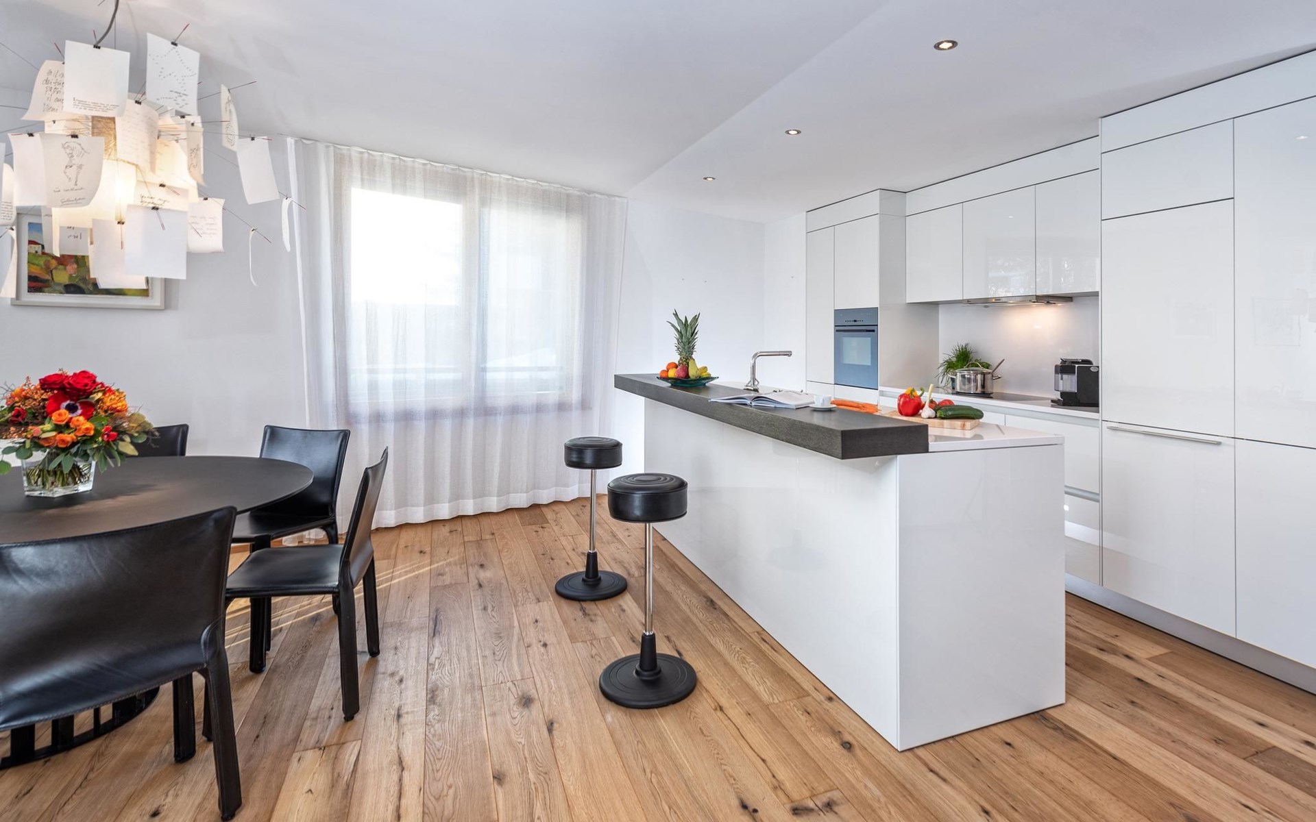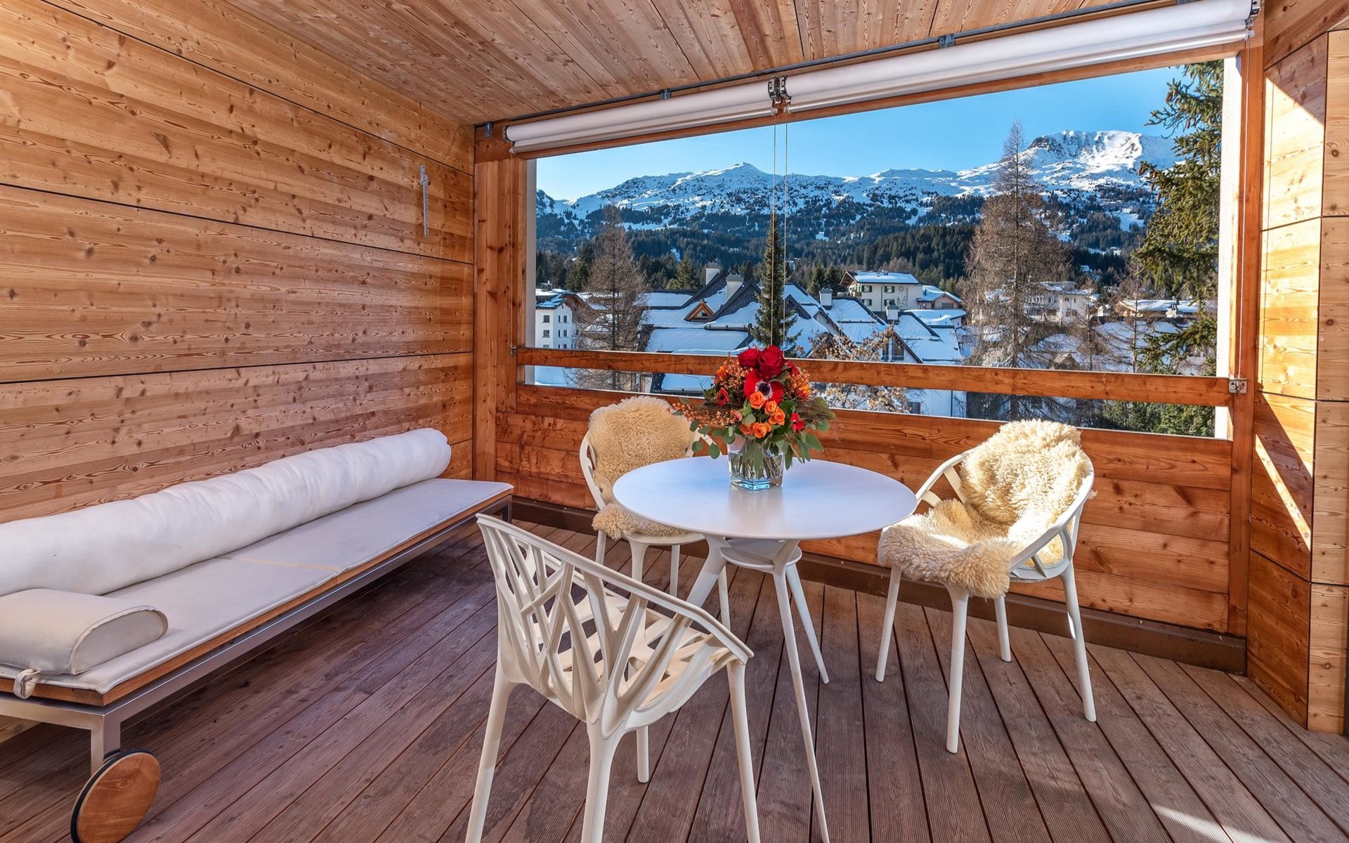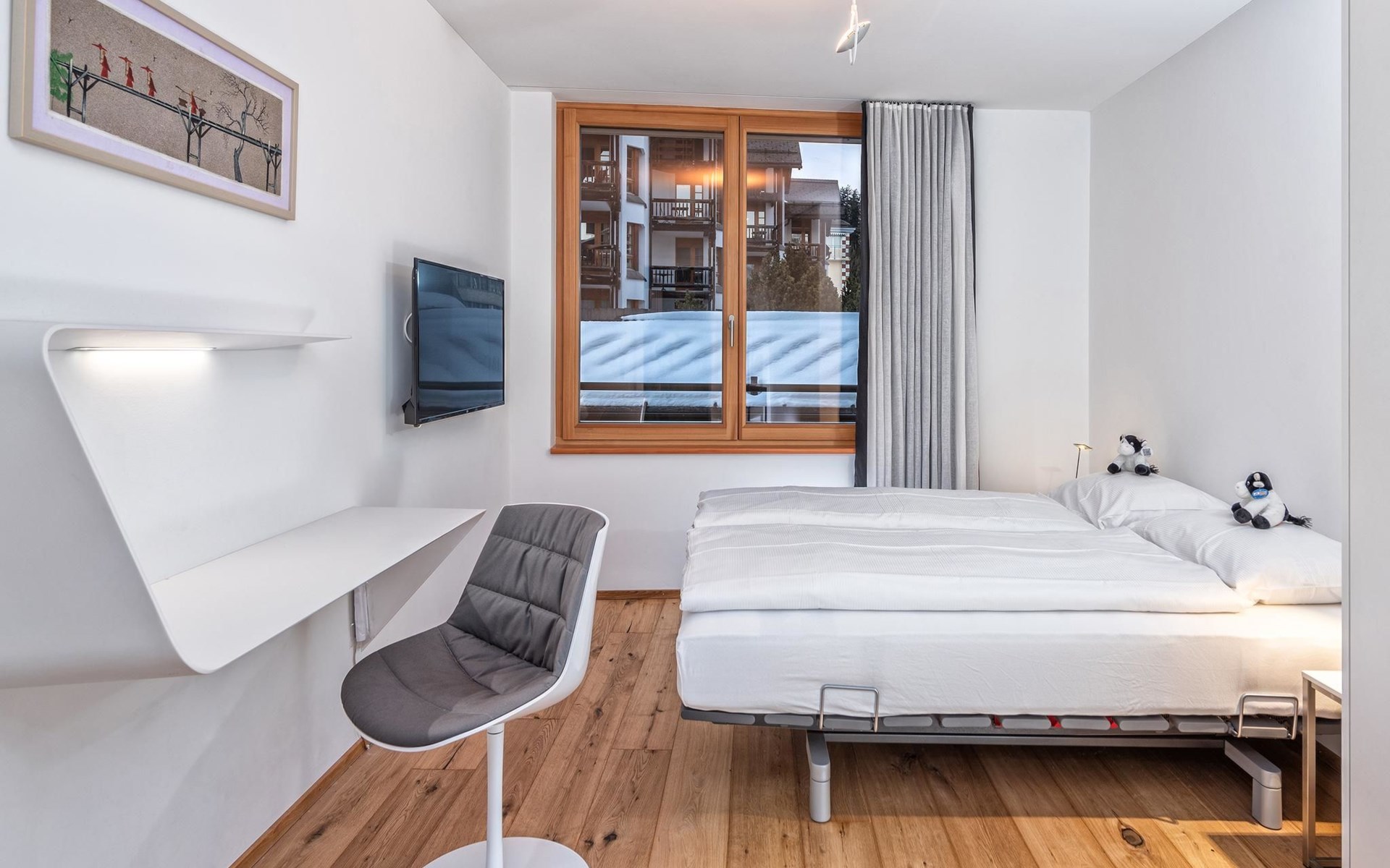 Geräumige ca. 129 m², ein durchgehend massiver Eichen-Parkettboden, eine weisse Architekten-Küche mit Bartheke, ein offener, verglaster Kamin, Tageslicht-Badezimmer mit Ausblick auf das Rothorn und die sonnige und ruhige Westlage im 2. Obergeschoss, verleihen der Wohnung einen beeindruckenden Charme. Ein Schlafzimmer mit Doppelbett und en-suite Bad sowie ein weiteres Schlafzimmer mit Doppelbett und separatem Bad sorgen für Ihren Schlafkomfort. Vom Wohn-/Esszimmer gelangen Sie durch eine Schiebetür in die Loggia. Hier geniesst man wettergeschützt einen atemberaubenden Ausblick in der Nachmittagssonne Richtung Scalottas. Zwei nebeneinander liegende reservierte Garagenplätze können dazu gebucht werden, ein Lift führt von der Tiefgarage direkt in den 2. Stock.