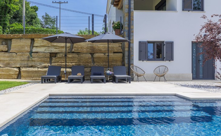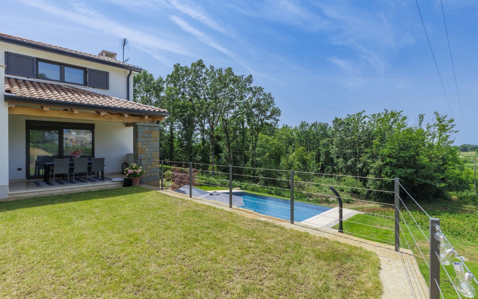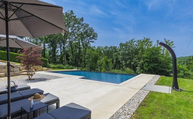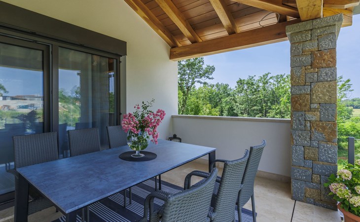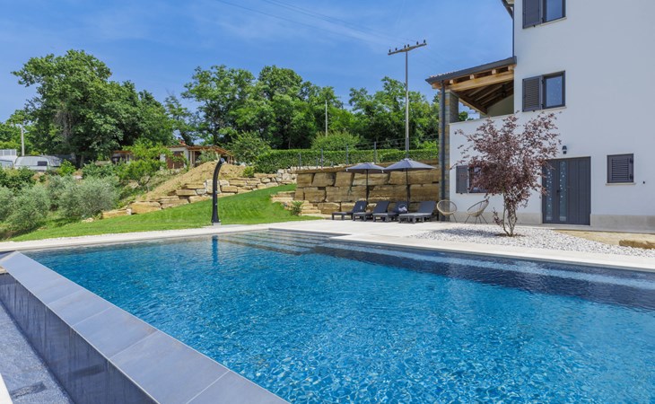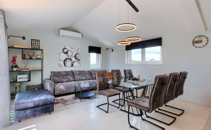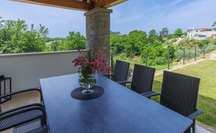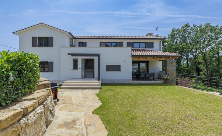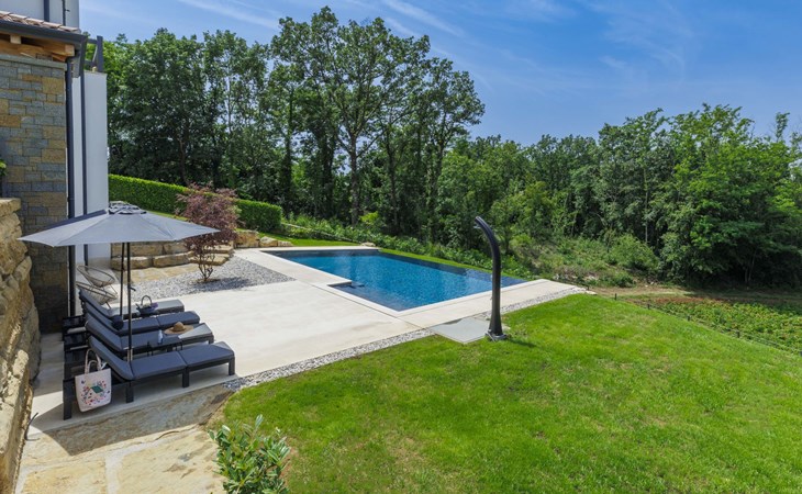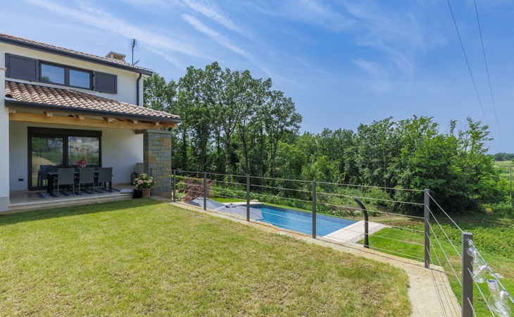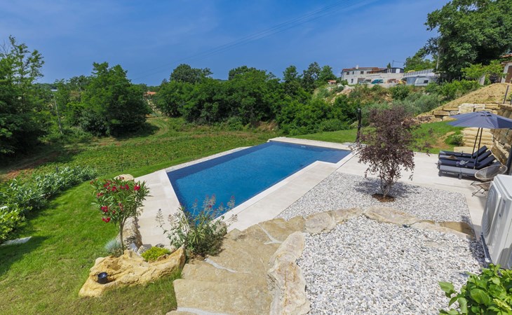 Karojba 4 km von Motovun: Sehr schönes Doppelhaus "Rokvilla", auf 2 Stockwerken. Im Weiler Krizmani, 4 km vom Zentrum von Karojbe, sonnige Lage, 20 km vom Meer. Zur Alleinbenutzung: Grundstück 800 m2, Garten mit Rasen, Schwimmbad eckig (51 m2, 138 cm tief, saisonale Verfügbarkeit: 01.Mai. - 15.Okt.) mit Innentreppe und Salzelektrolyse-Reinigungssystem. Aussendusche, Tischtennis, Terrasse (10 m2), Gartenmöbel, Grill, Poolpflege durch den Besitzer/Gärtner. Im Hause: Internetzugang, Waschmaschine. Parkplatz (für 2 Autos) beim Haus auf dem Grundstück. Einkaufsgeschäft 3 km, Restaurant 4 km, Bushaltestelle 6.3 km, Kieselstrand 25 km, Felsstrand 20 km. Bitte beachten: geeignet für Familien. Der Besitzer akzeptiert keine Jugendgruppen.