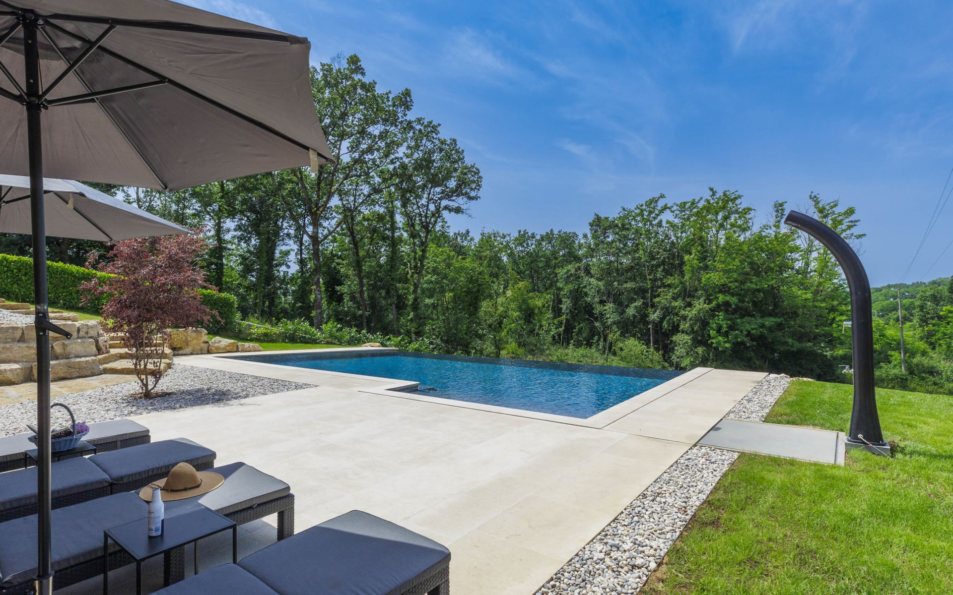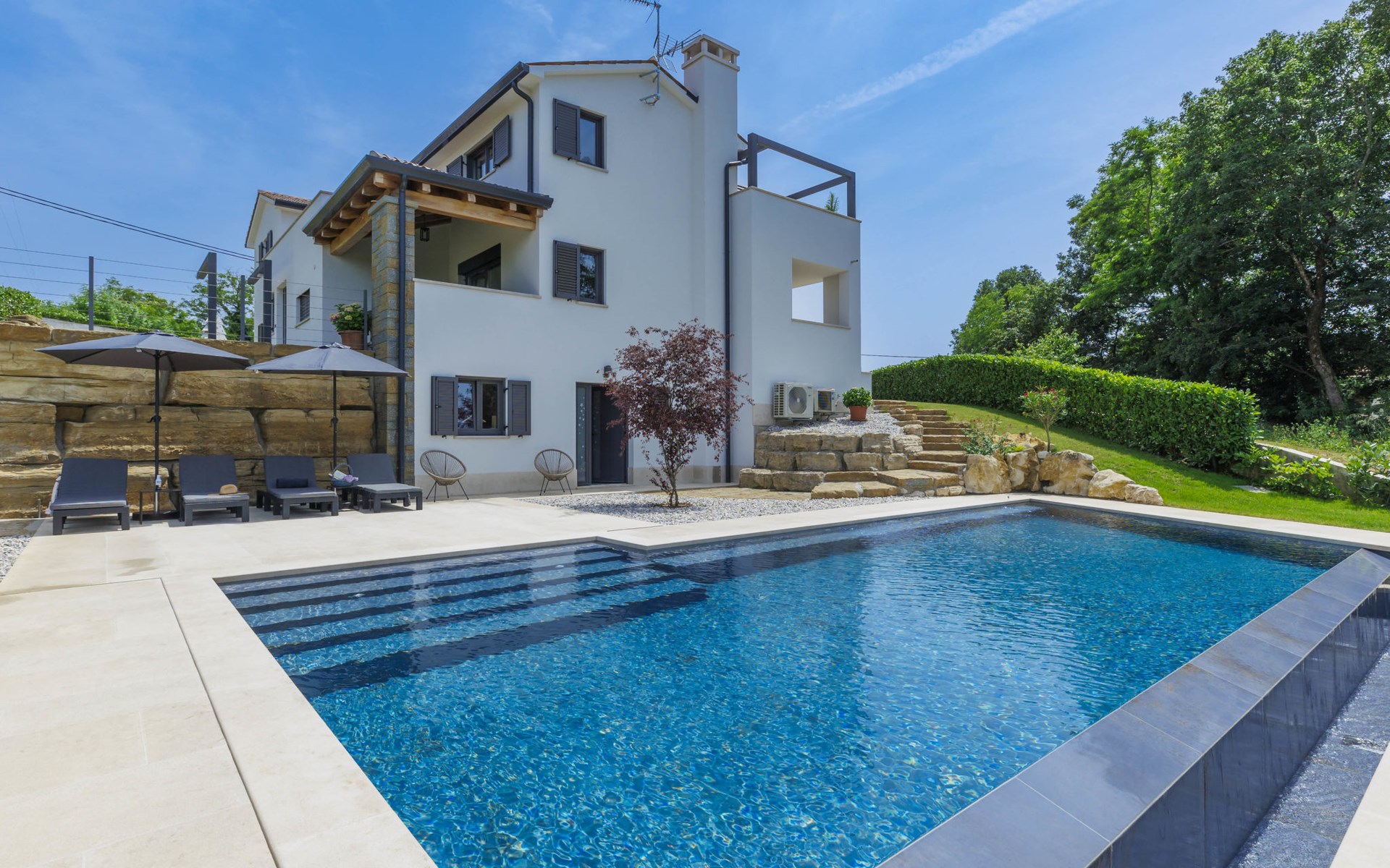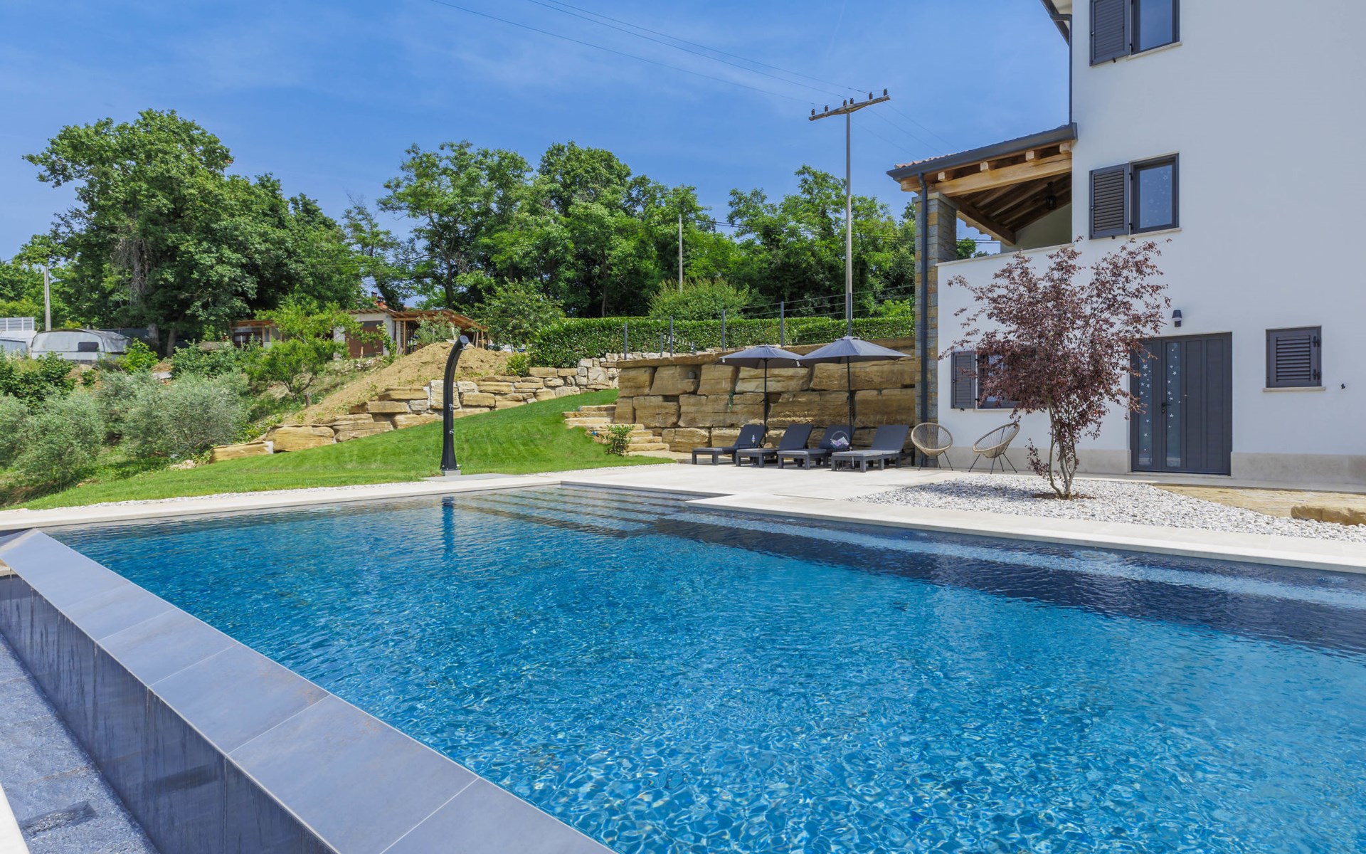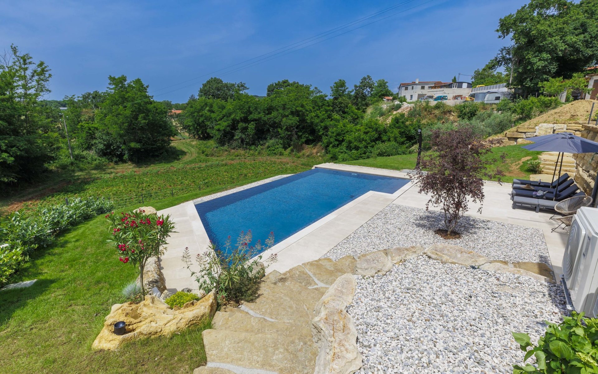 Karojba 4 km von Motovun: Sehr schönes Doppelhaus "Rokvilla", auf 2 Stockwerken. Im Weiler Krizmani, 4 km vom Zentrum von Karojbe, sonnige Lage, 20 km vom Meer. Zur Alleinbenutzung: Grundstück 800 m2, Garten mit Rasen, Schwimmbad eckig (51 m2, 138 cm tief, saisonale Verfügbarkeit: 01.Mai. - 15.Okt.) mit Innentreppe und Salzelektrolyse-Reinigungssystem. Aussendusche, Tischtennis, Terrasse (10 m2), Gartenmöbel, Grill, Poolpflege durch den Besitzer/Gärtner. Im Hause: Internetzugang, Waschmaschine. Parkplatz (für 2 Autos) beim Haus auf dem Grundstück. Einkaufsgeschäft 3 km, Restaurant 4 km, Bushaltestelle 6.3 km, Kieselstrand 25 km, Felsstrand 20 km. Bitte beachten: geeignet für Familien. Der Besitzer akzeptiert keine Jugendgruppen.