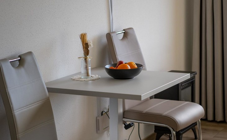 Das renovierte Studio ist ideal für 1 bis 2 Personen und bietet einen kombinierten Wohn- und Schlafbereich mit einem Doppelbett (zwei getrennte Matratzen, 180x200 cm). Eine kleine, komplett ausgestattete Küche mit Combi-Grill (Backofen und Mikrowelle) sowie ein Badezimmer mit Dusche und WC sorgen für einen angenehmen Aufenthalt.