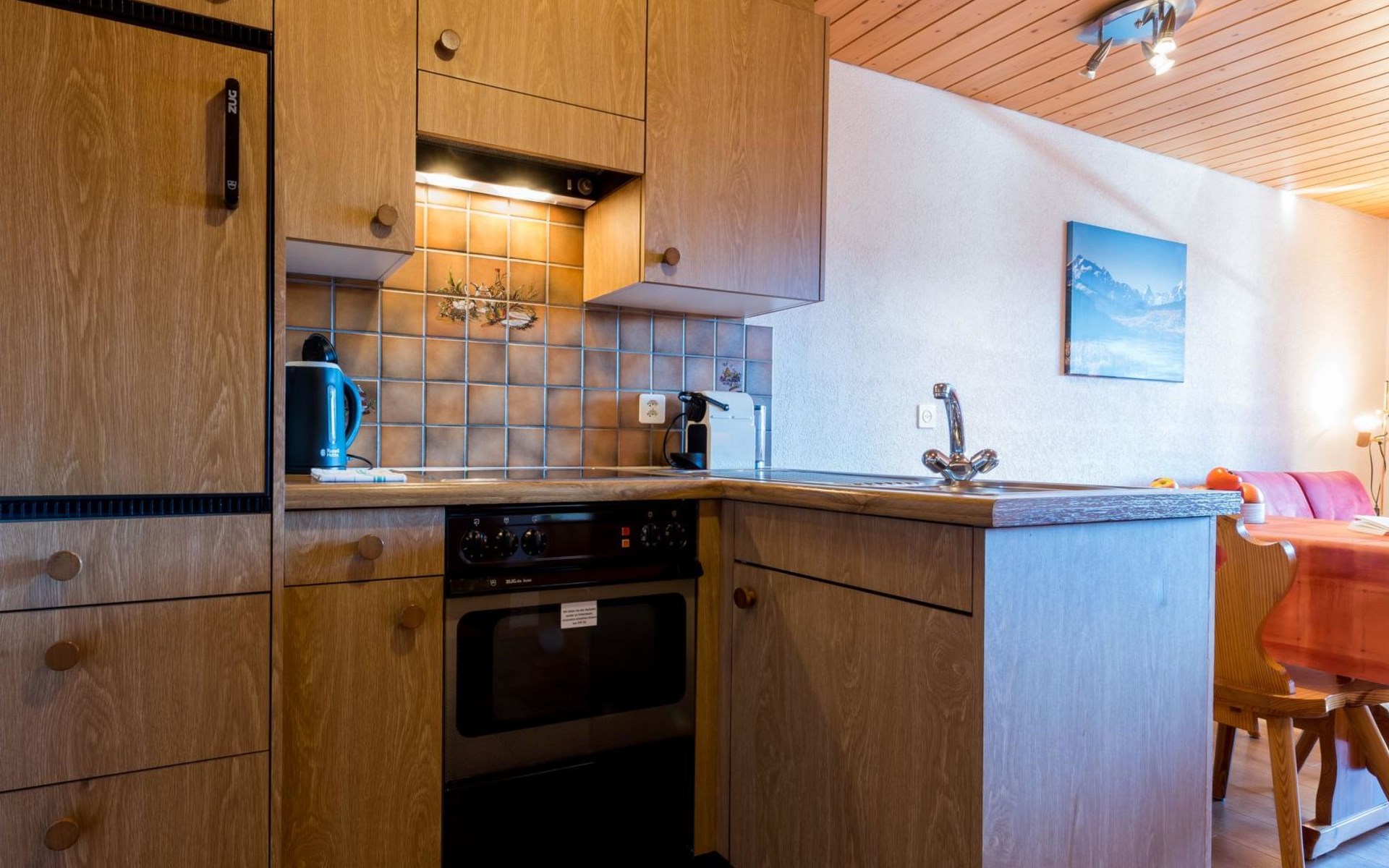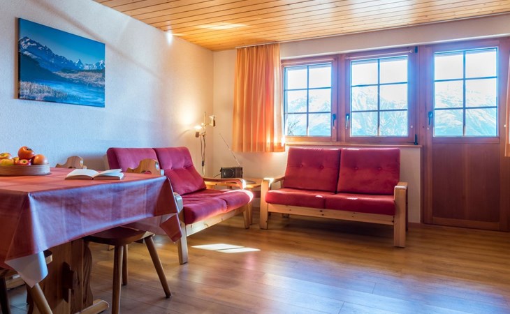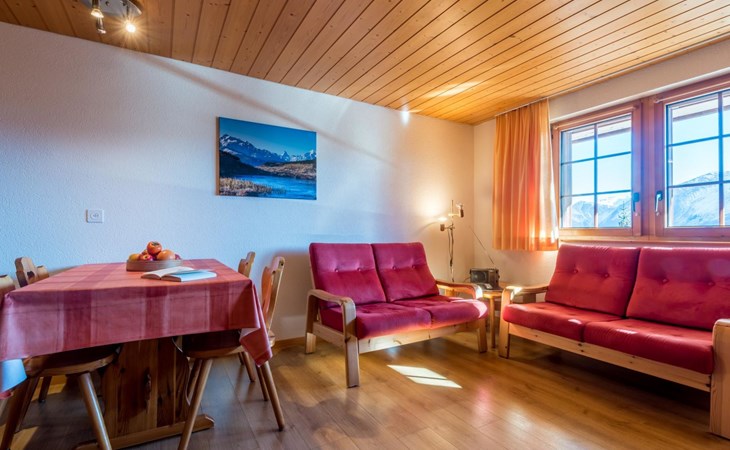Die 2 1/2-Zimmer-Wohnung ist für 1 bis 4 Personen geeignet und verfügt über einen separaten Schlafraum sowie einen Wohnraum mit Küche und zwei Klappbetten. Ein Südbalkon bietet freien Blick auf die Walliser Viertausender. Zur Ausstattung gehören Wlan, Farbfernseher mit SAT-Anlage, Lift sowie gemeinschaftlich nutzbare Waschmaschine und Trockner. Im Winter steht ein abschliessbarer Skiraum mit moderner Schuhtrocknungsanlage und Desinfektion zur Verfügung. Im Sommer lädt eine Liegewiese mit Grillplatz zum Verweilen ein. Die Wohnung ist gepflegt, sehr sauber und rauchfrei.