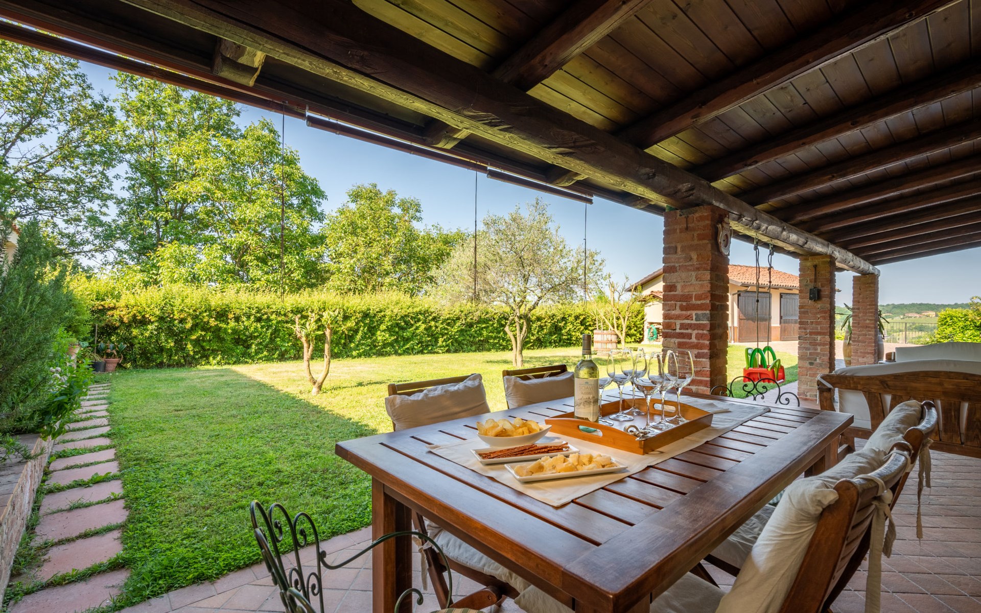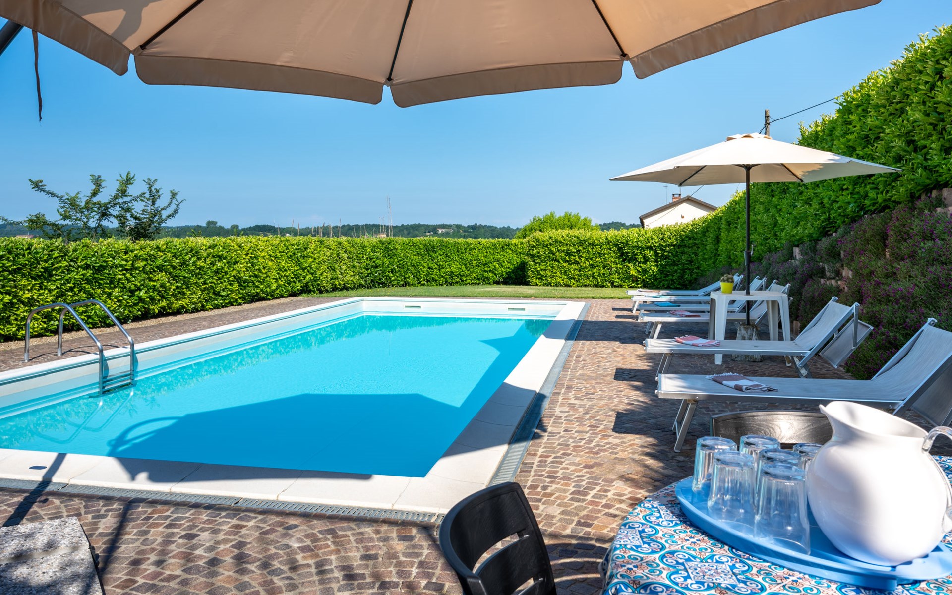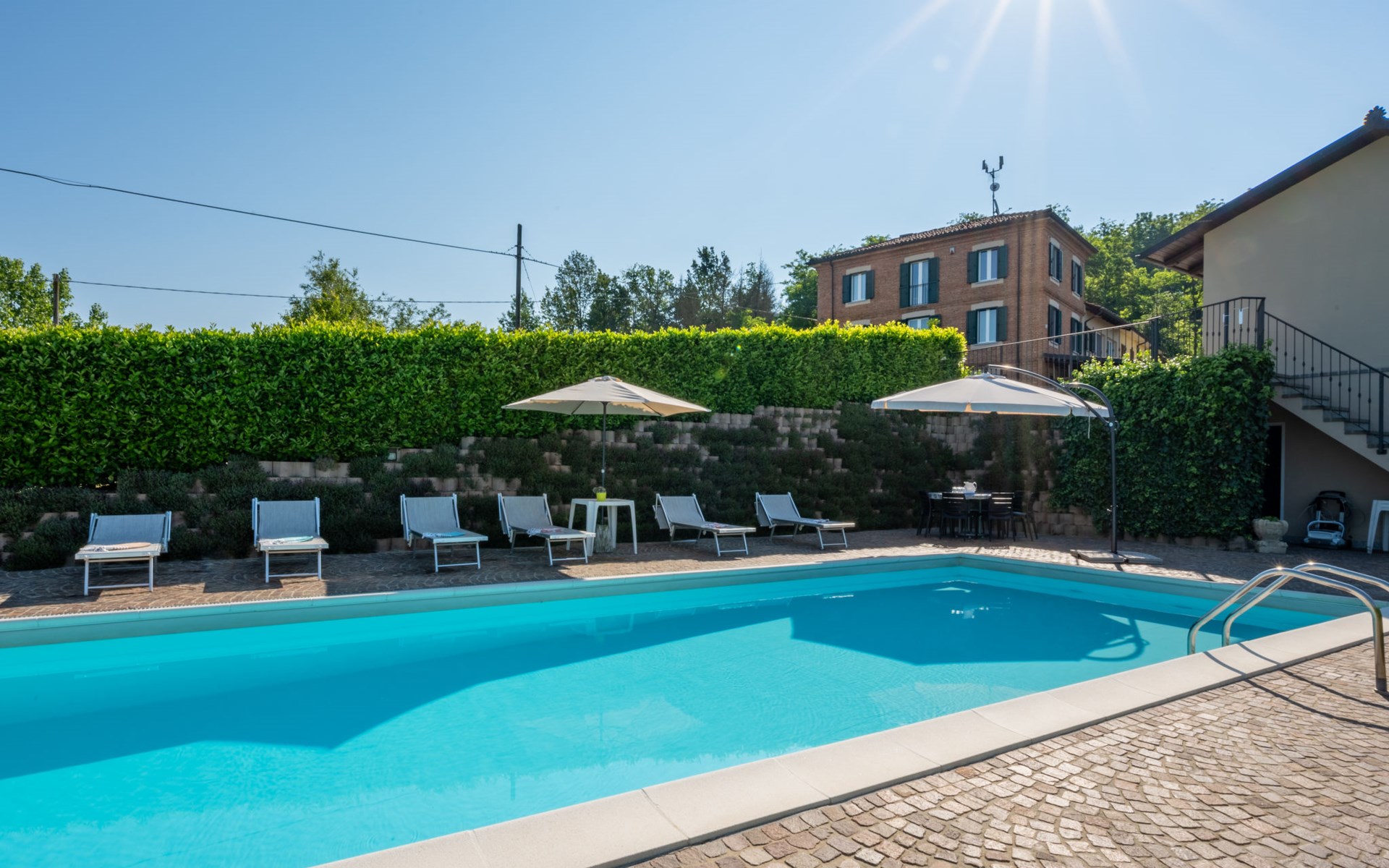 Sehr komfortables Landhaus "Marmorito", einseitig angebaut, umgeben von Wiesen und Feldern. 3 km vom Zentrum von Portacomaro, 9 km vom Zentrum von Asti, 40 km vom Zentrum von Alba, im Villenviertel. Zur Alleinbenutzung: Grundstück 3'000 m2 (eingezäunt), gepflegter Garten mit Rasen und Pflanzen, Schwimmbad (12 x 5 m, 100 - 200 cm tief, saisonale Verfügbarkeit: 05.Apr. - 30.Okt.). Dusche/WC im Poolbereich, Aussendusche, Poolpflege durch den Besitzer/Gärtner. Im Hause: Fitnessraum, Tischfussball. Parkplatz beim Haus auf dem Grundstück. Einkaufsgeschäft 3 km, Supermarkt 6 km, Bushaltestelle 1.7 km, Bahnstation "Asti" 9 km. Golfplatz (18 Loch) 18 km. Bitte beachten: Fahrzeug empfohlen. Ein Teil des Hauses ist geschlossen und nicht bewohnt.