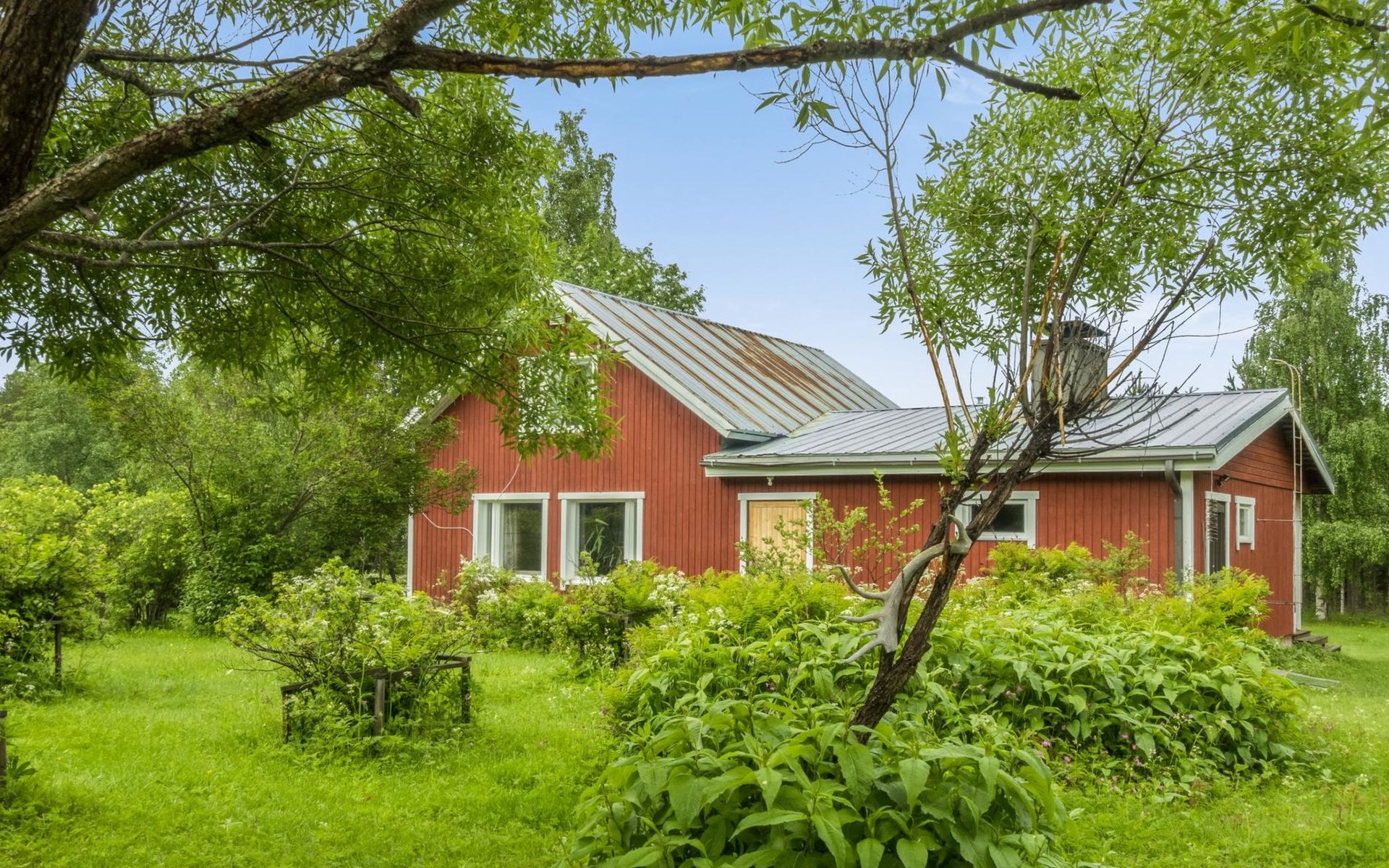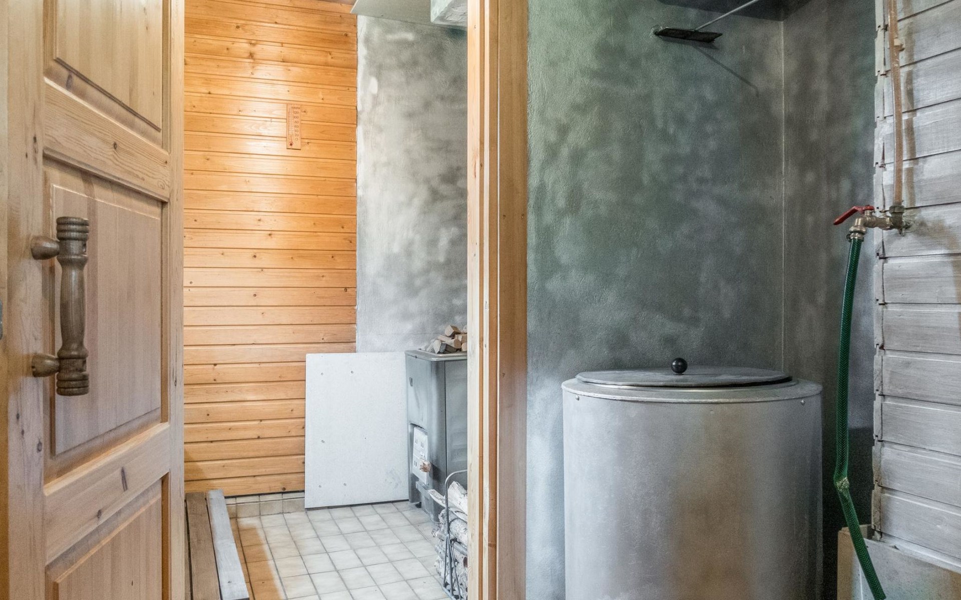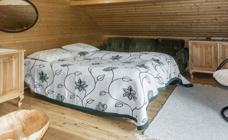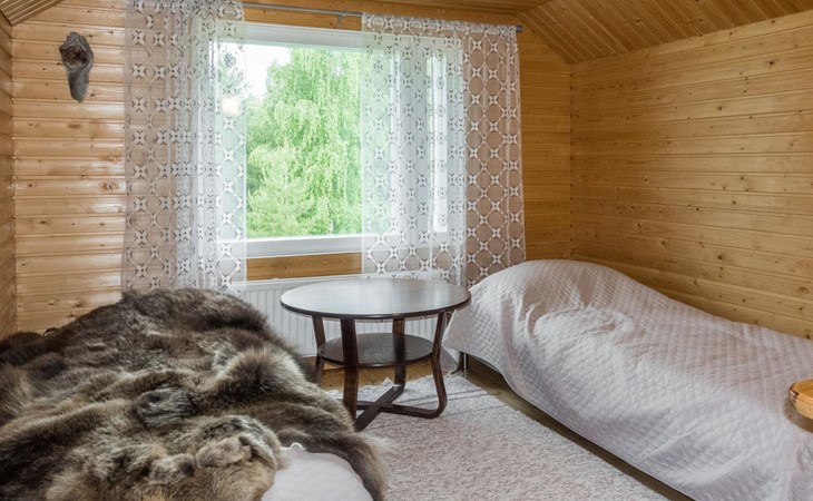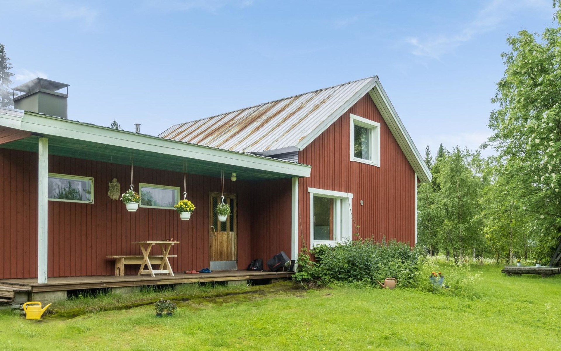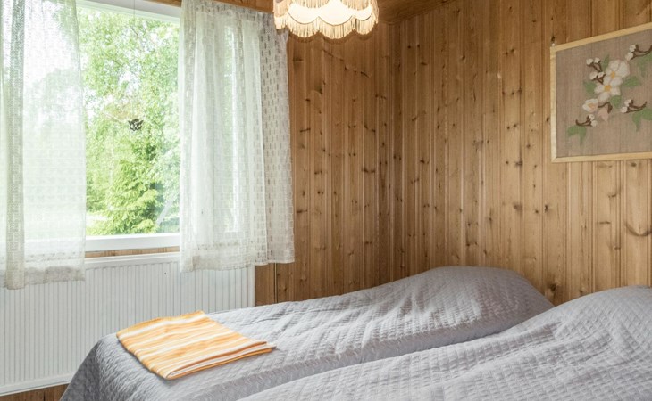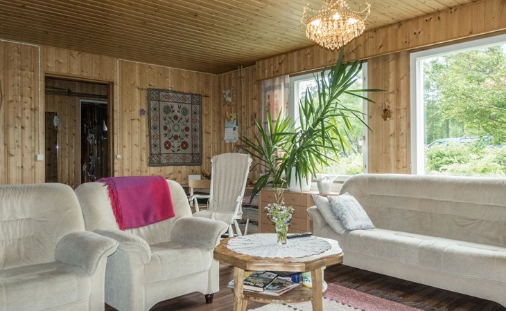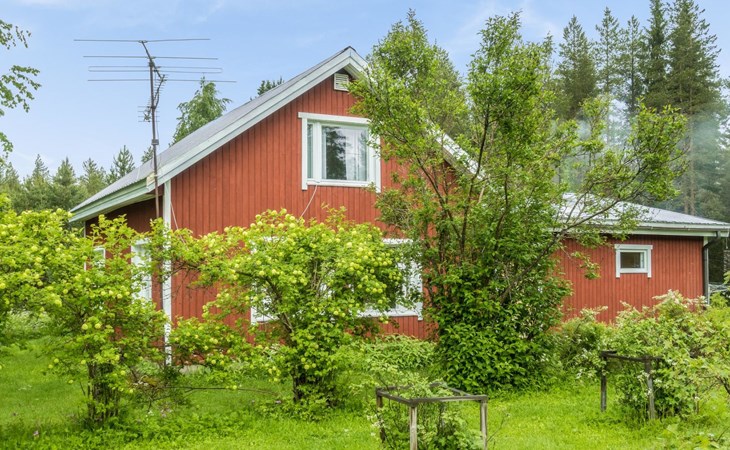 Wood-built house, originally built in 1949, expanded and renovated later. On the ground floor, living room, bedroom with 2 beds, sauna, washroom, dressing room and separate WC. On the upper floor, bedroom with double bed and another bedroom with 2 separate beds. Covered terrace.