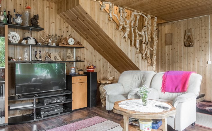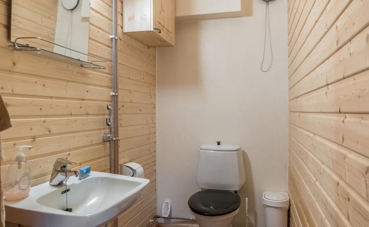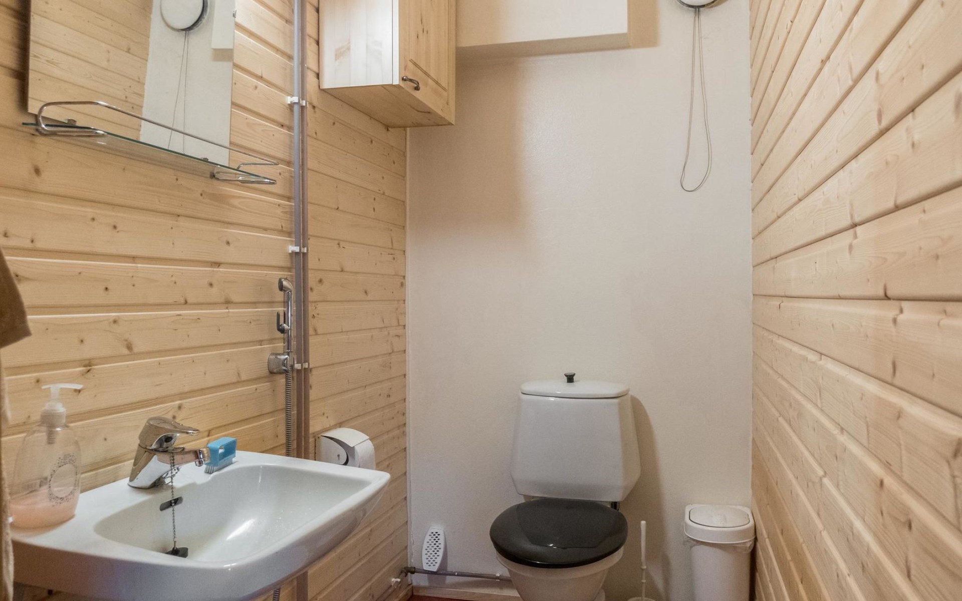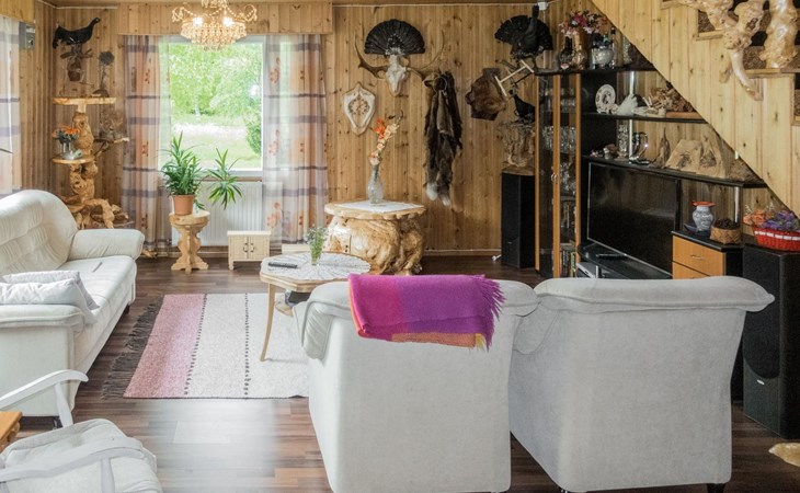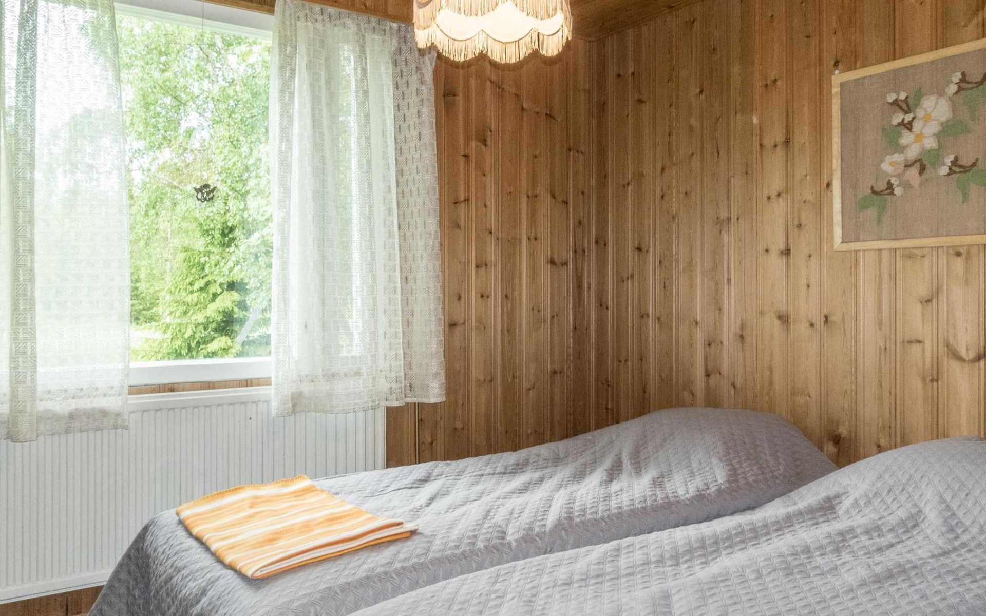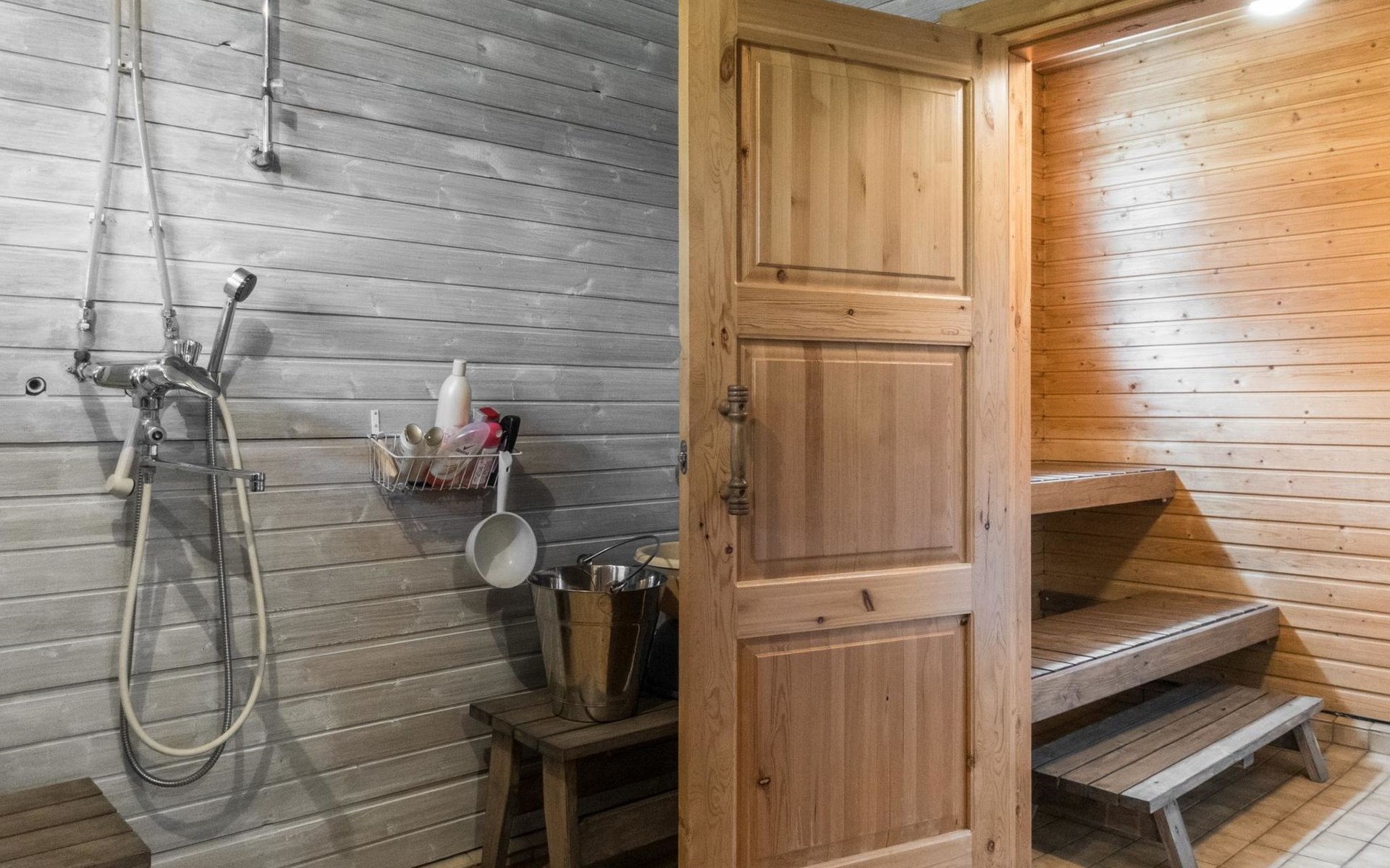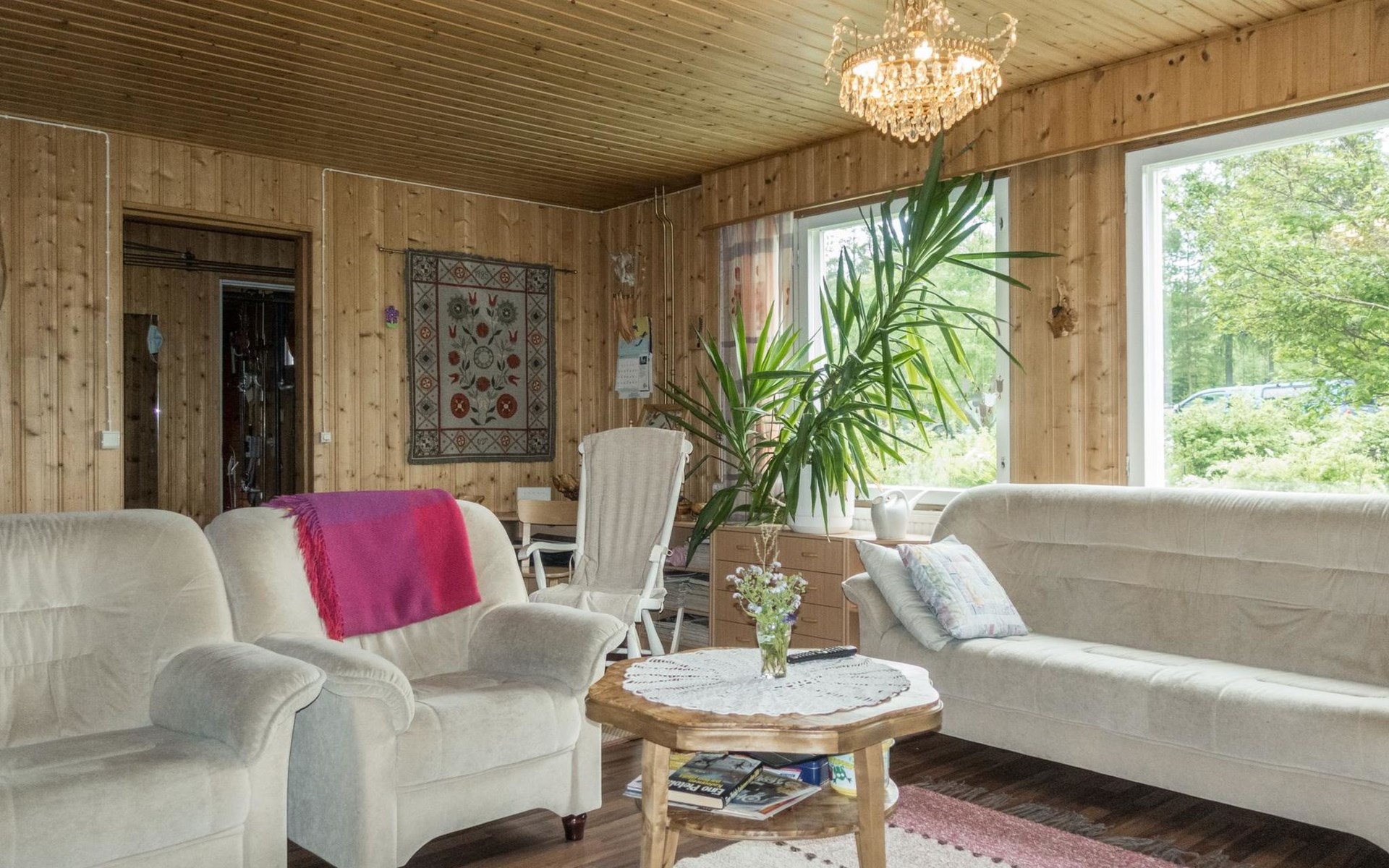 Wood-built house, originally built in 1949, expanded and renovated later. On the ground floor, living room, bedroom with 2 beds, sauna, washroom, dressing room and separate WC. On the upper floor, bedroom with double bed and another bedroom with 2 separate beds. Covered terrace.