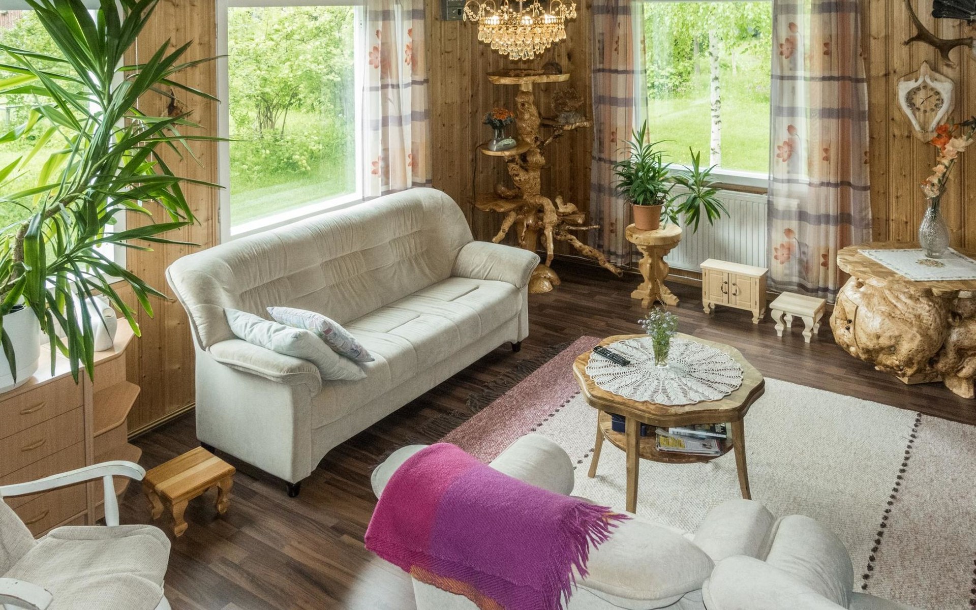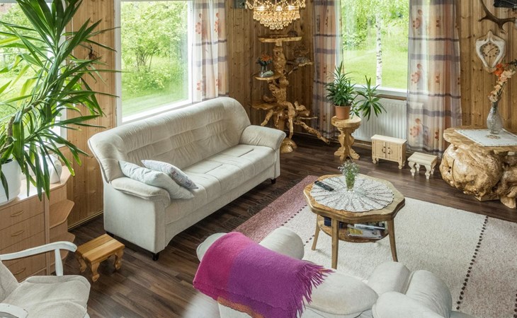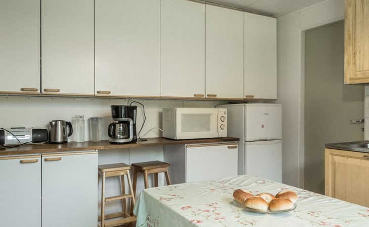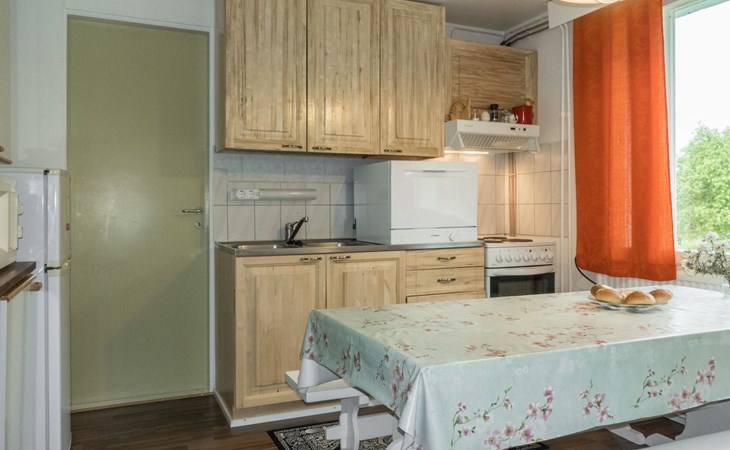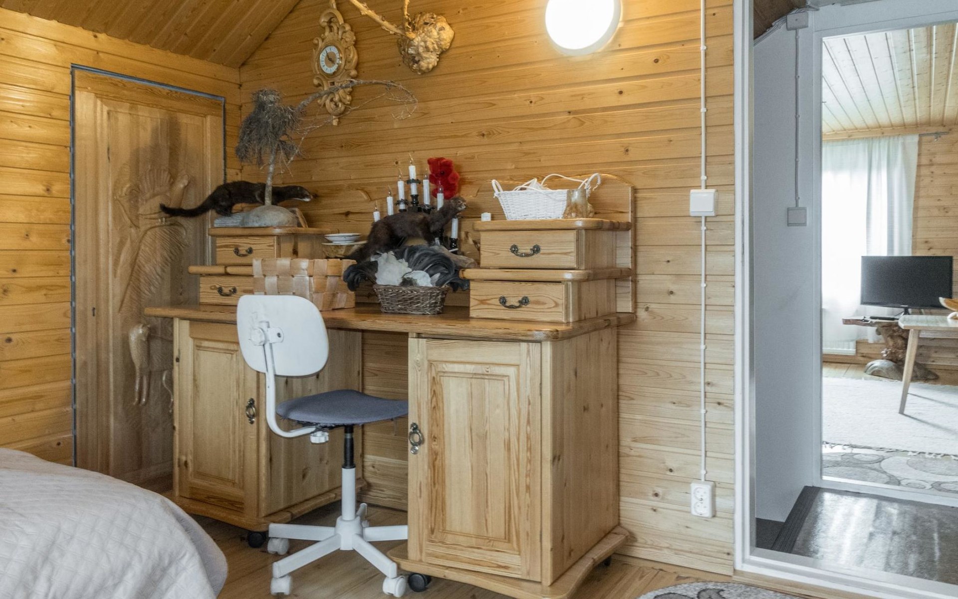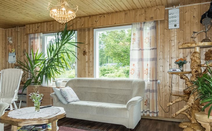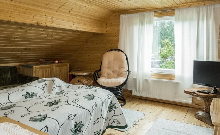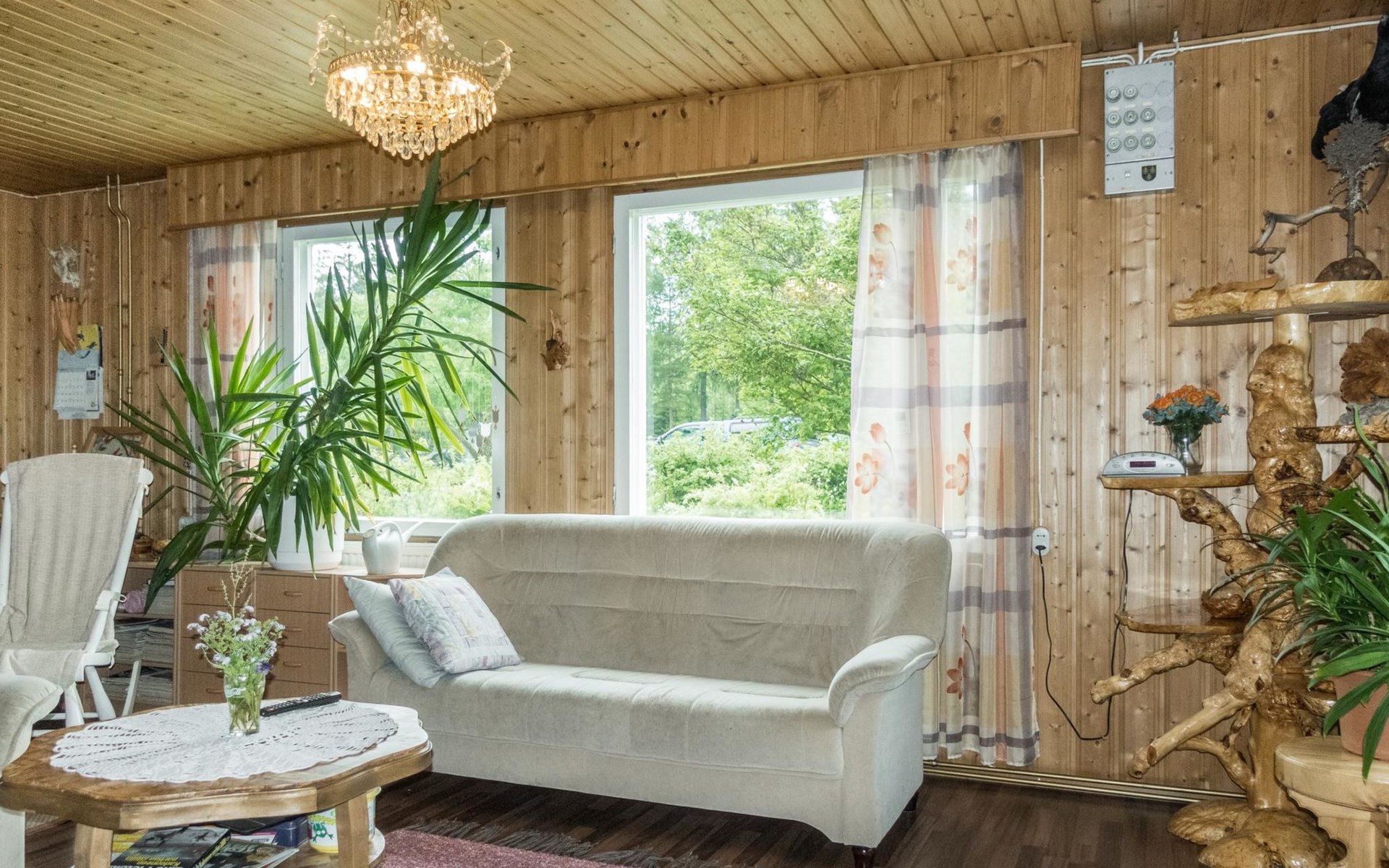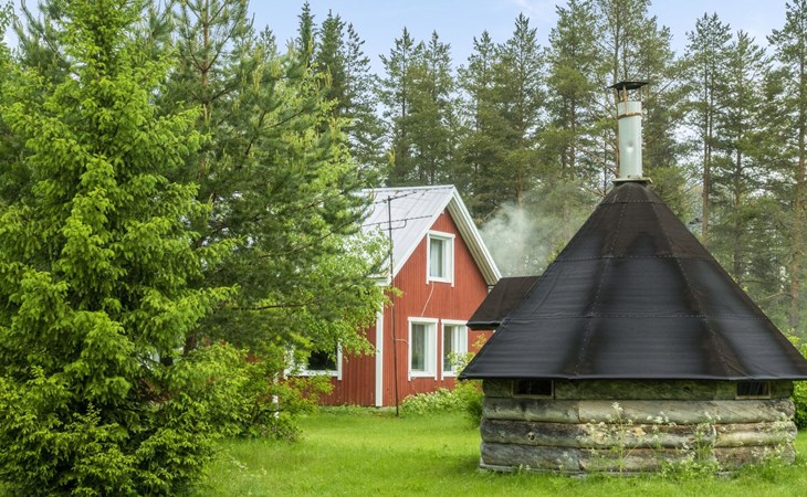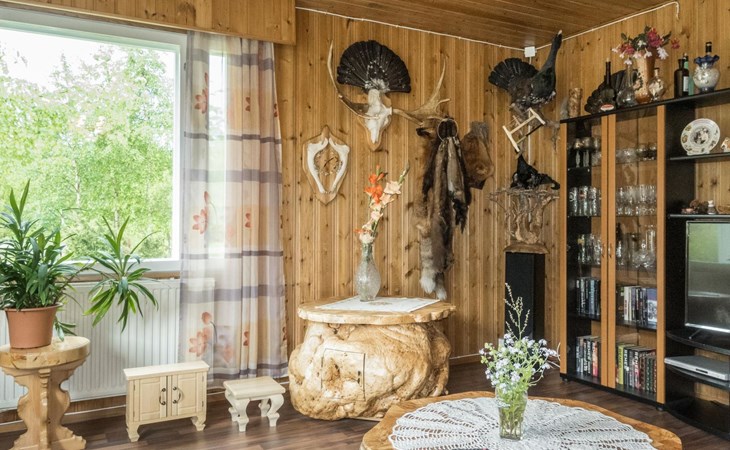 Wood-built house, originally built in 1949, expanded and renovated later. On the ground floor, living room, bedroom with 2 beds, sauna, washroom, dressing room and separate WC. On the upper floor, bedroom with double bed and another bedroom with 2 separate beds. Covered terrace.