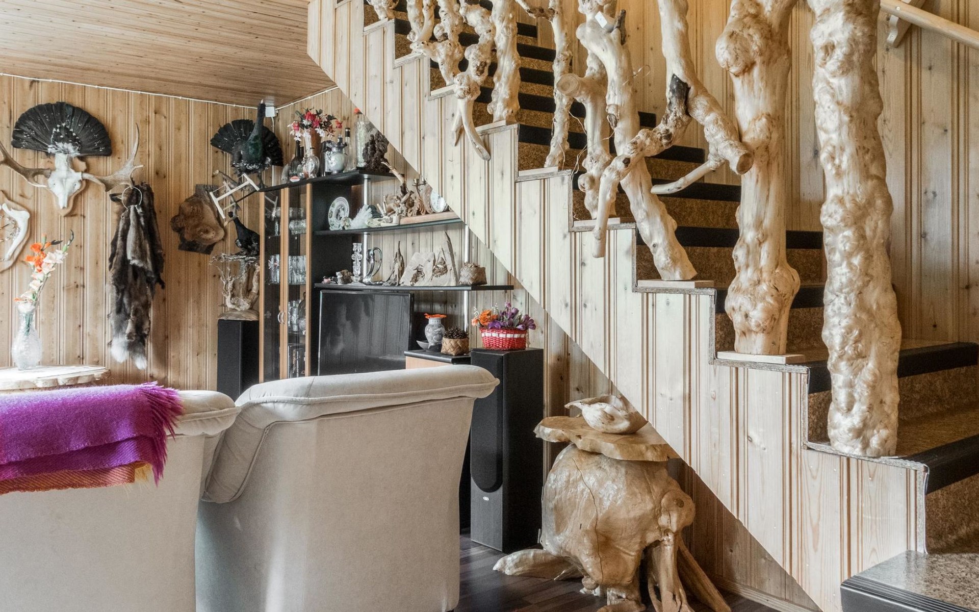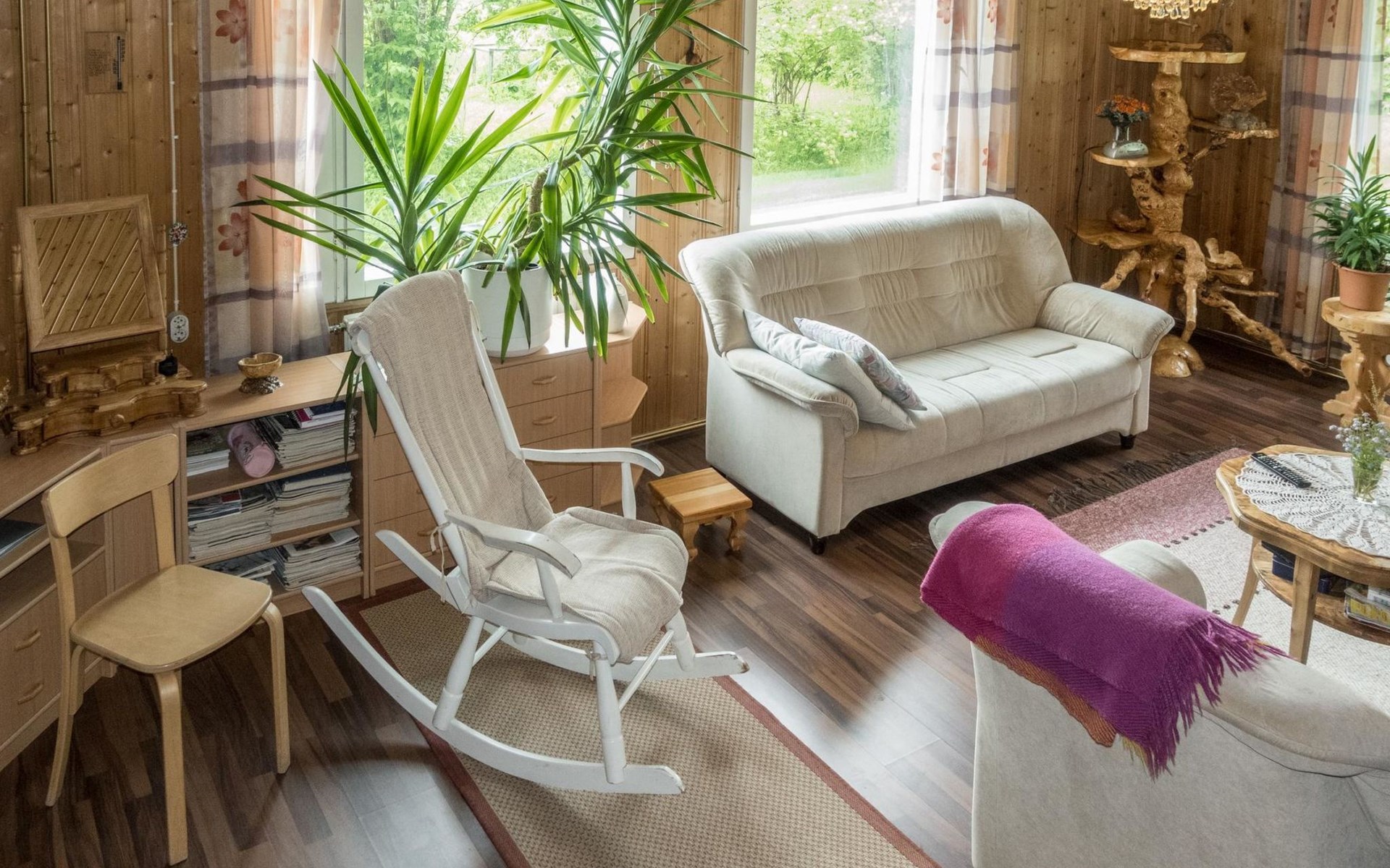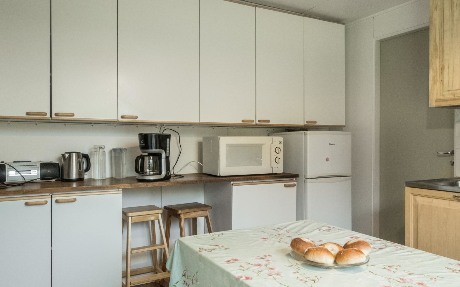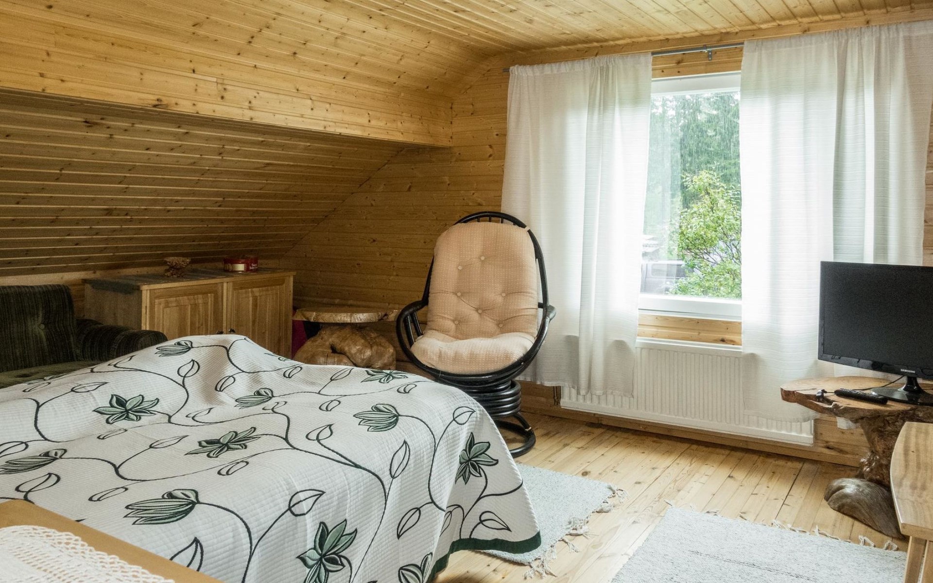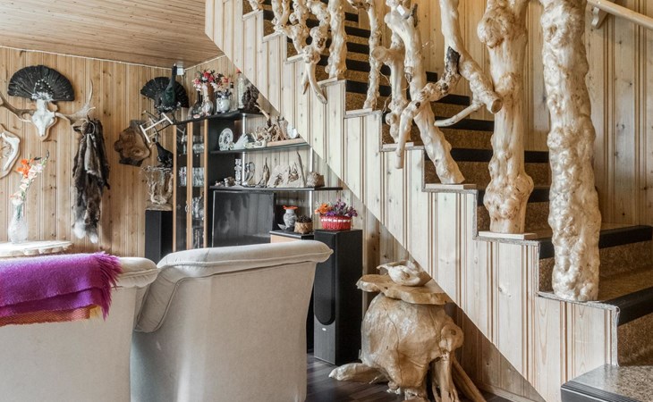 Wood-built house, originally built in 1949, expanded and renovated later. On the ground floor, living room, bedroom with 2 beds, sauna, washroom, dressing room and separate WC. On the upper floor, bedroom with double bed and another bedroom with 2 separate beds. Covered terrace.