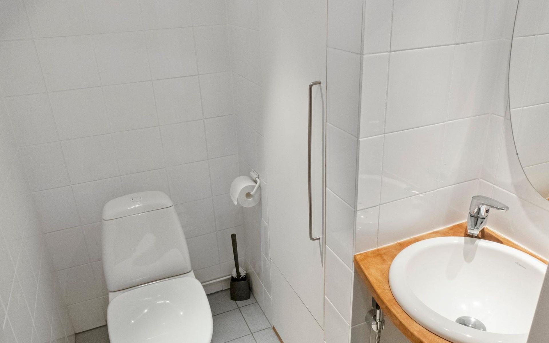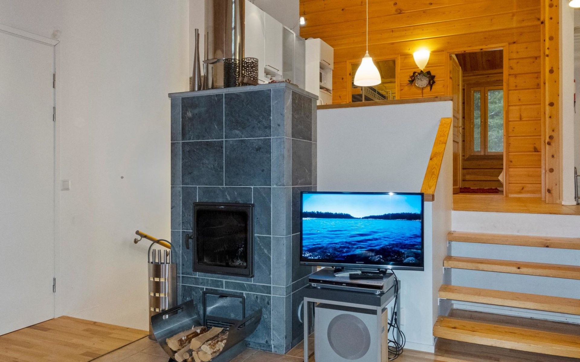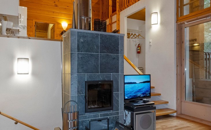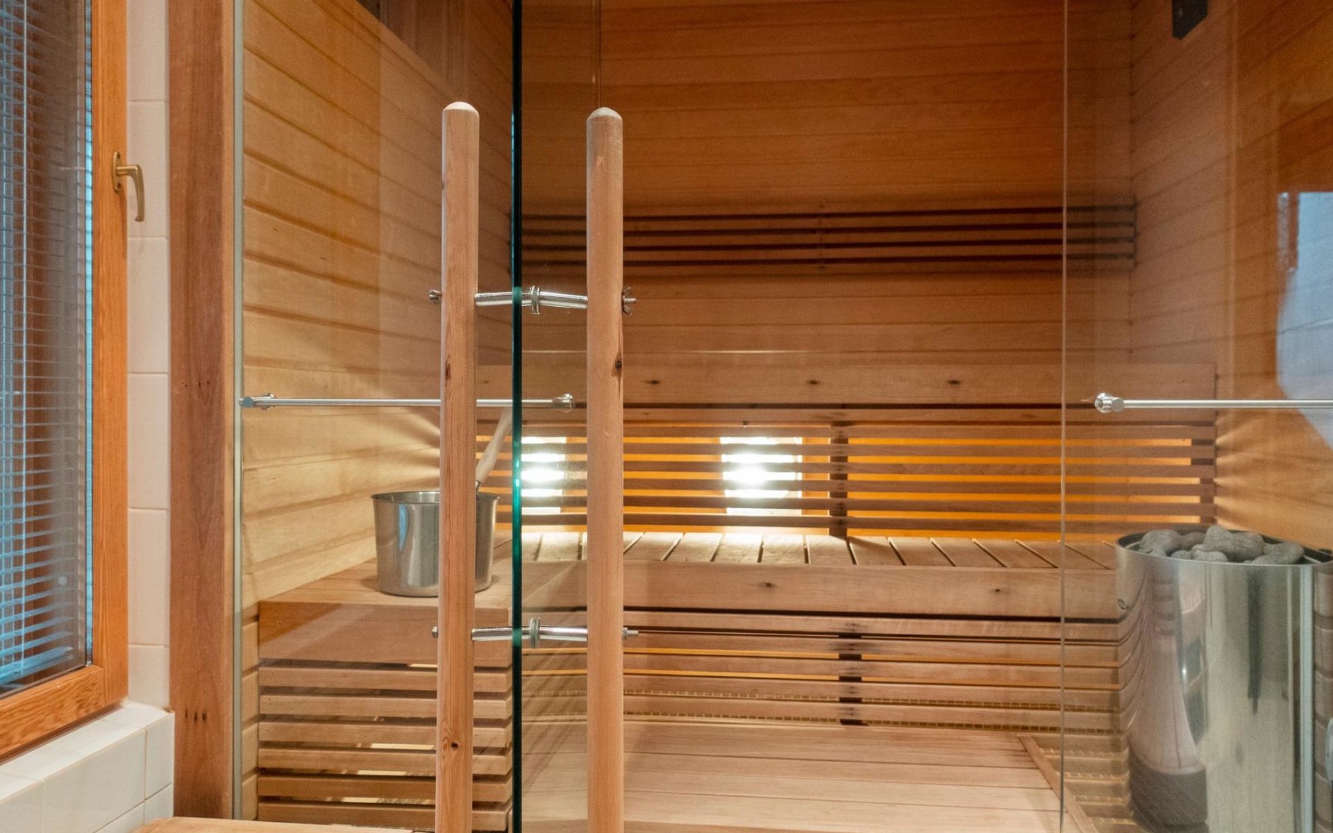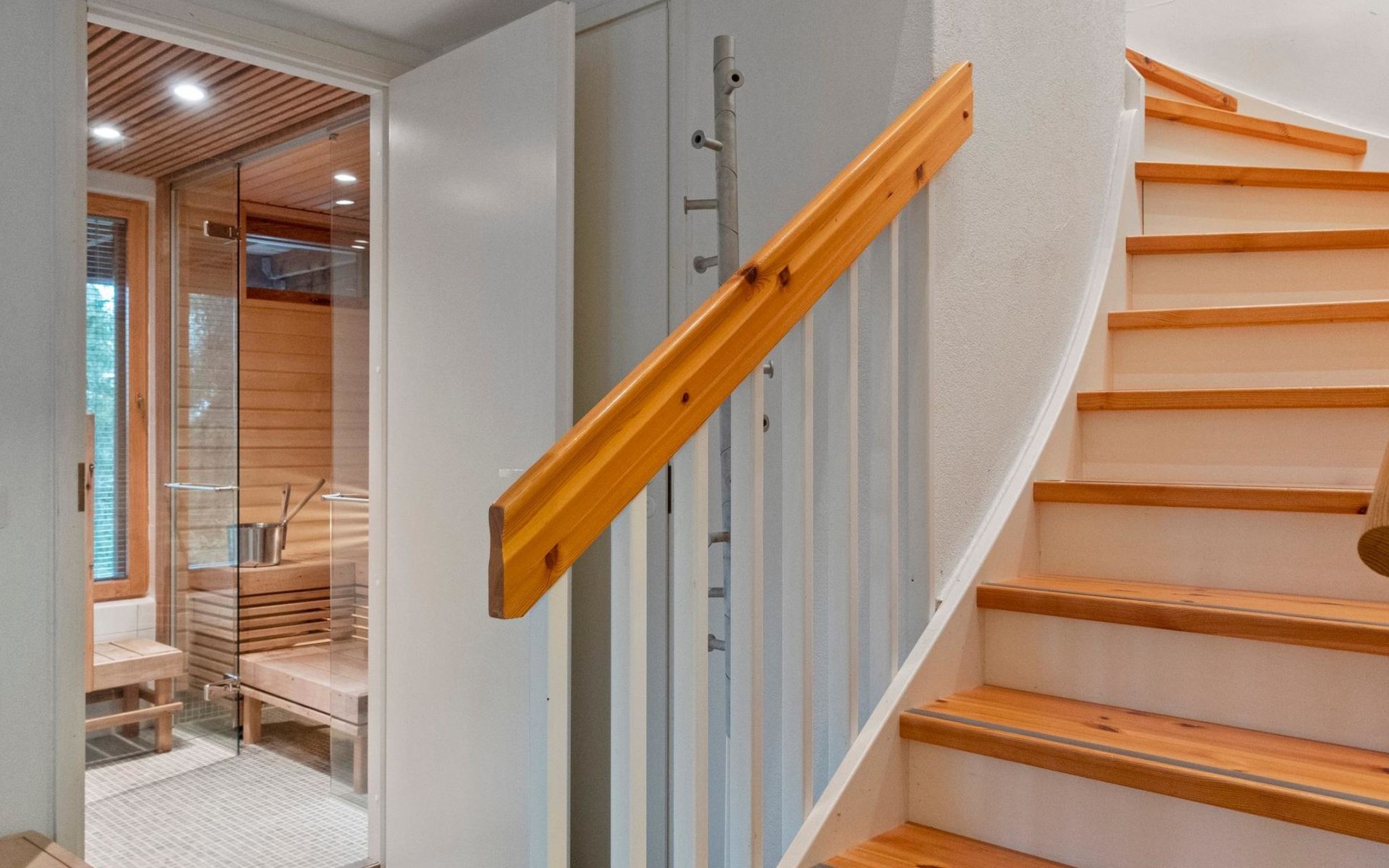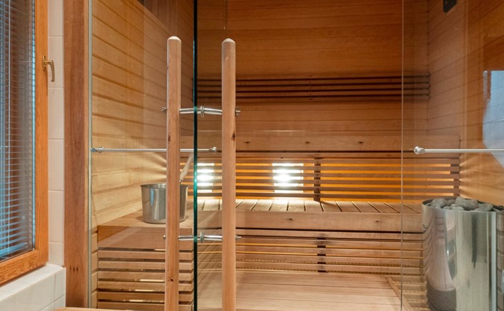 On the ground floor, bedroom with double bed, sauna, washroom, utility room and wardrobe. The apartment has two separate WCs, one on both floors.