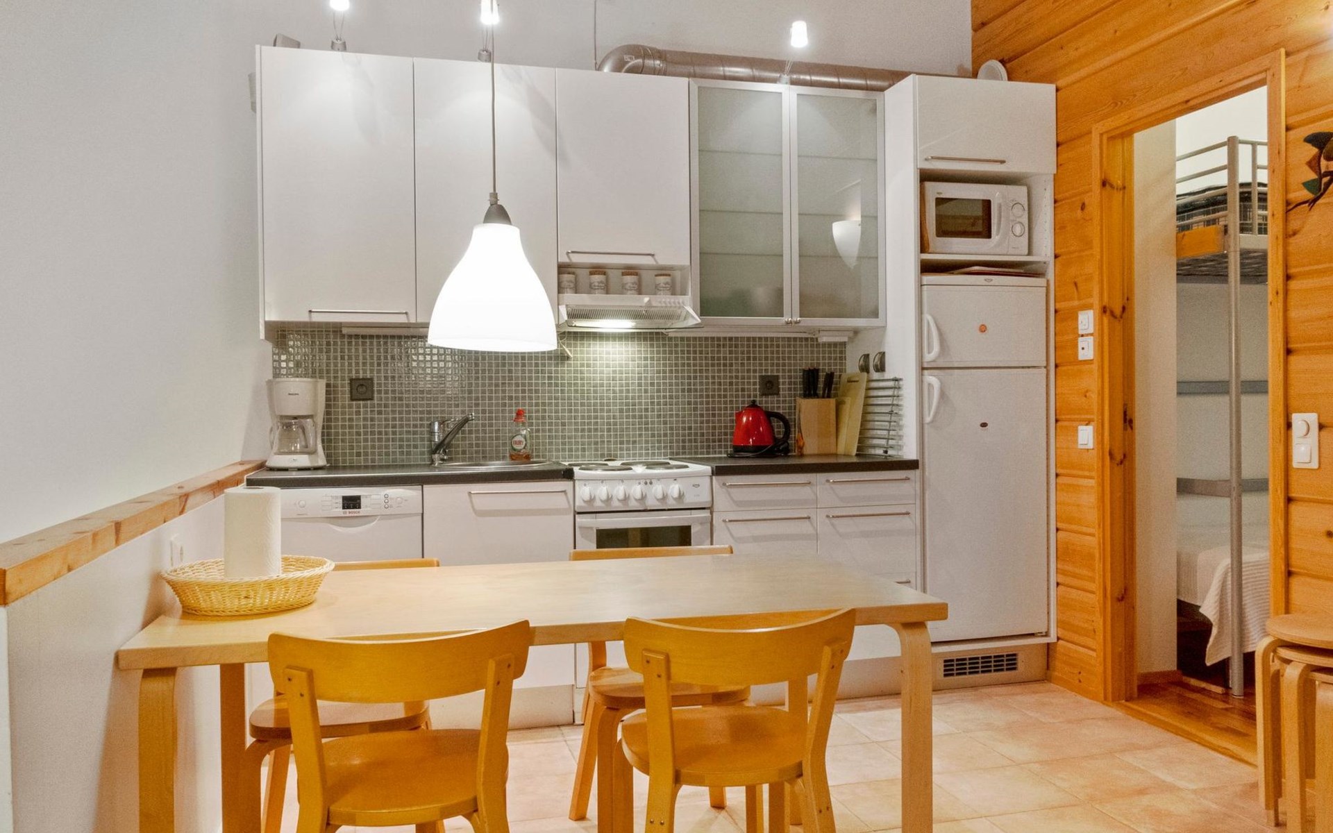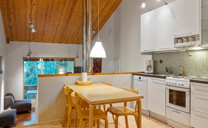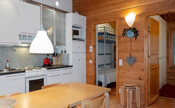 The semi-detached house is built in 2004. Facilities on two floors. On the upper floor (entrance floor), living room, kitchen, bedroom with double bed and another bedroom with bunk bed.
