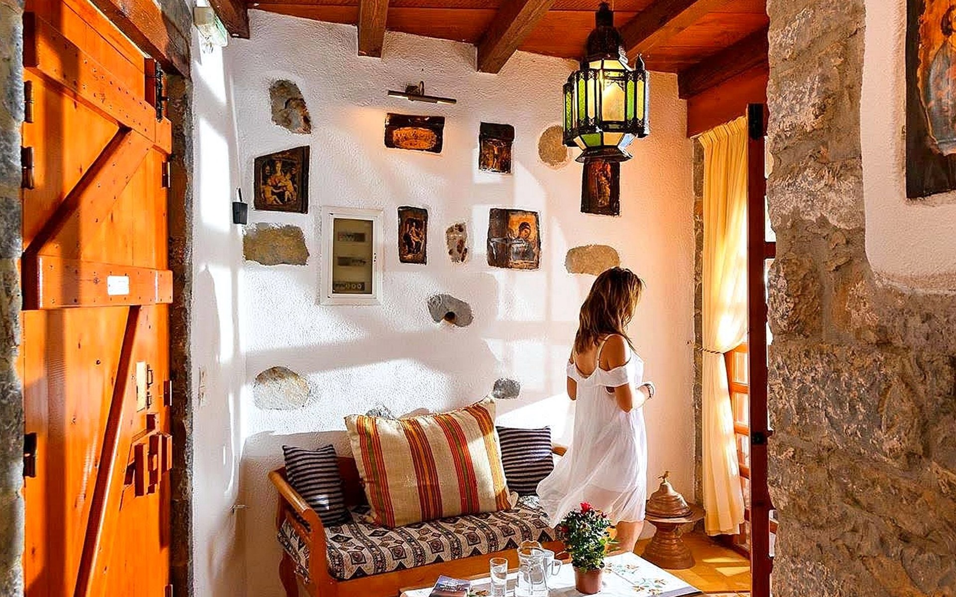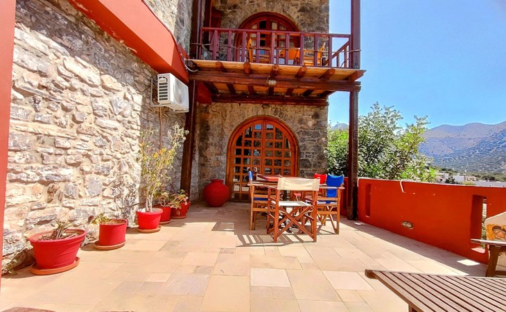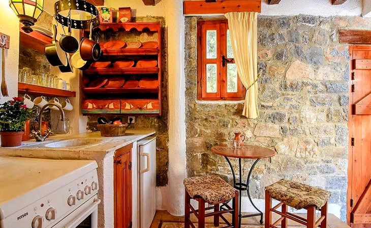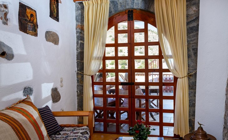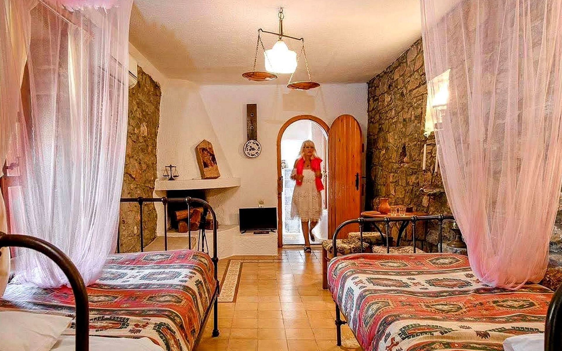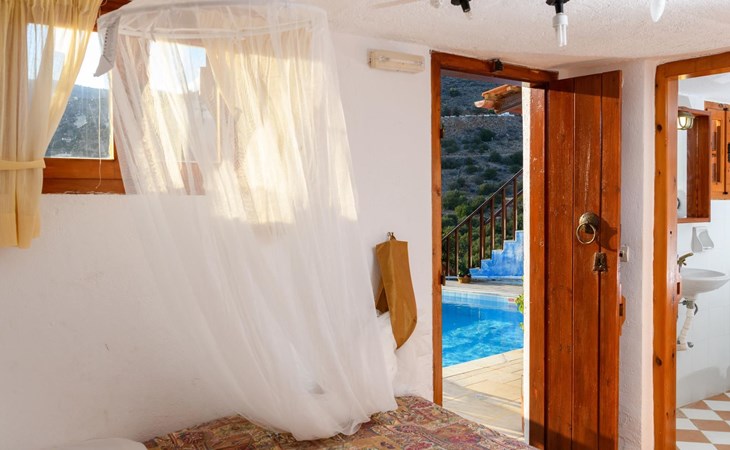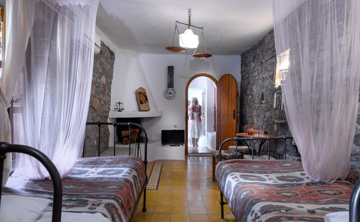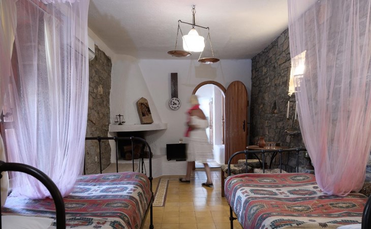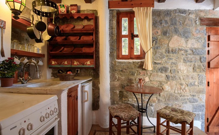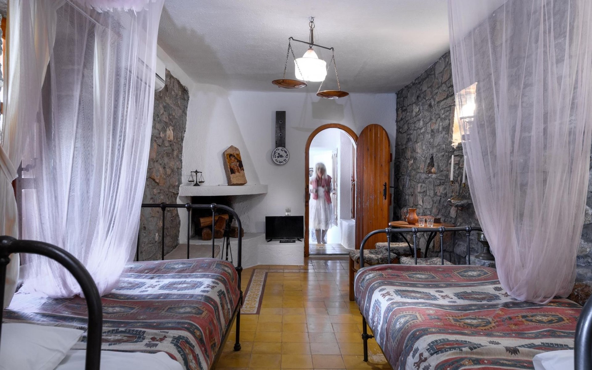 Das traditionell gebaute Haus verbindet rustikale Elemente mit luxuriöser Ausstattung. Das Innere ist mit Sichtmauerwerk, Holzbalken und eleganten Möbeln ausgestattet, die eine warme und gemütliche Atmosphäre schaffen. Es kann 4 Personen beherbergen. Inklusive A/C. Wir betreten den kleinen Ess- und Sitzbereich. Rechts die Küche mit allen Utensilien. Die Tür auf der linken Seite führt zu einem Schlafzimmer mit zwei Einzelbetten und weiter zu einem zweiten Schlafzimmer mit Doppelbett. Angrenzend das Badezimmer mit Jacuzzi. Im Außenbereich gibt es einen privaten Esstisch für vier Erwachsene und einen Swimmingpool, der mit einem anderen Haus geteilt wird. Privatparkplatz für zwei Autos. Alle Möbel sind Kopien von Originalen, die im Historischen Museum von Heraklion, Kreta, gefunden wurden, aber die Lampen und Armaturen sind original. Die Fliesen sind handgefertigt und stammen aus der Zeit um 1920. Sie wurden aus alten, abgerissenen Häusern entnommen und das Marmorwaschbecken wurde in einem türkischen Hammam gefunden. Die Wasserhähne sind Kopien derjenigen aus den 1920er Jahren. Der rötliche Putz an den Wänden besteht aus geschliffenen Fliesen, dem gleichen Material, das in den Klöstern des 14. bis 16. Jahrhunderts verwendet wurde. Es gibt Hinweise darauf, dass sich an dieser Stelle vor vielen Jahren eine Kirche befunden hat.