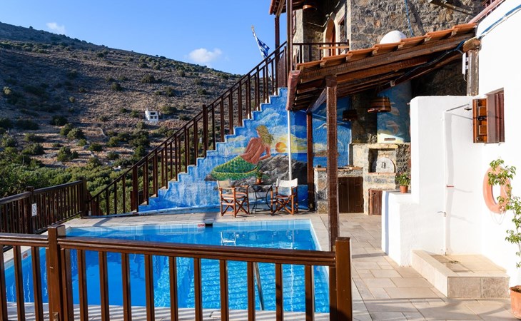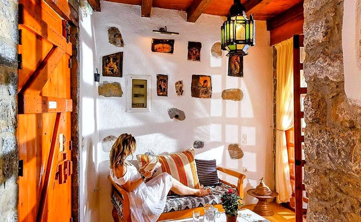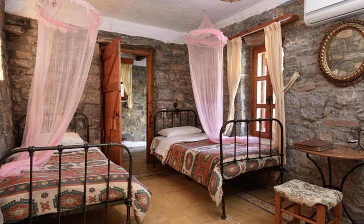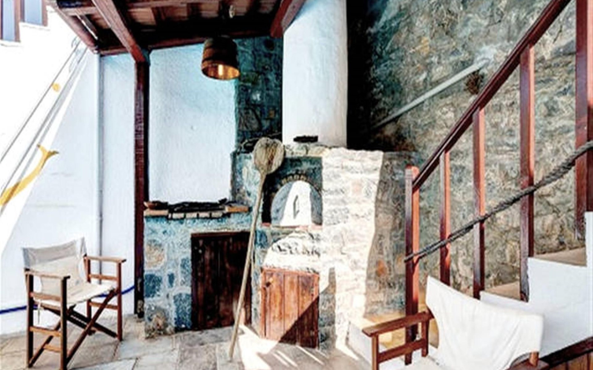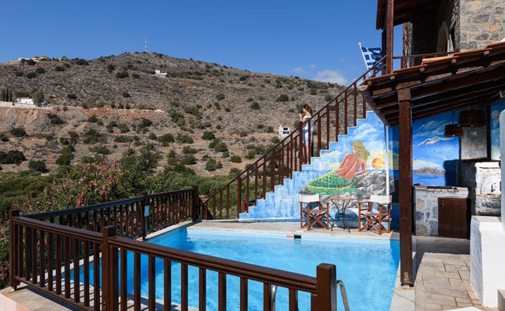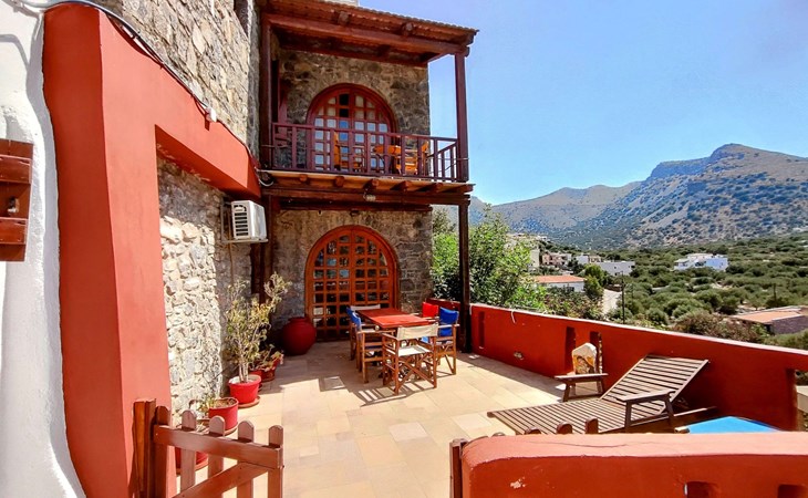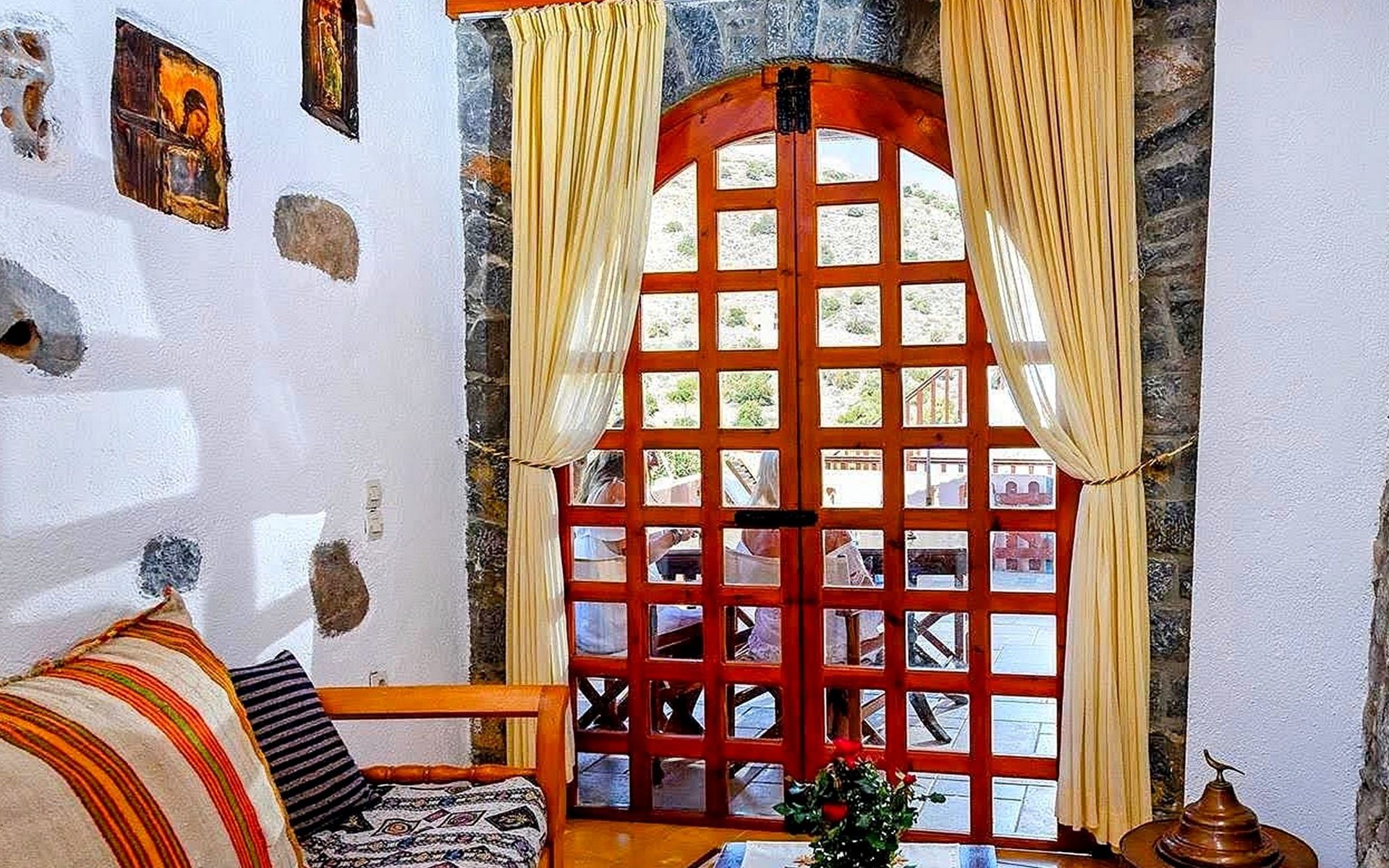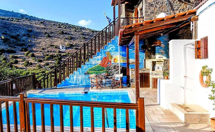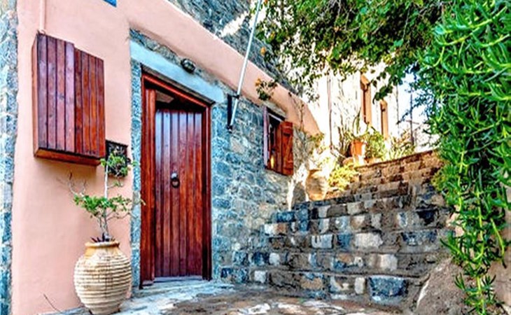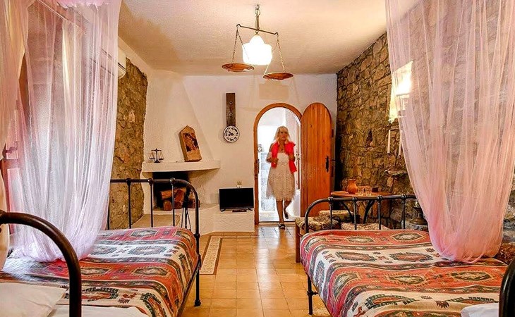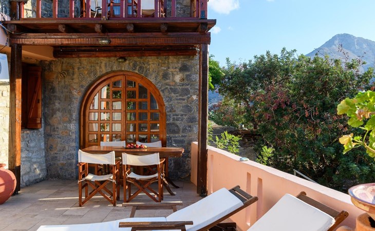 Das traditionell gebaute Haus verbindet rustikale Elemente mit luxuriöser Ausstattung. Das Innere ist mit Sichtmauerwerk, Holzbalken und eleganten Möbeln ausgestattet, die eine warme und gemütliche Atmosphäre schaffen. Es kann 4 Personen beherbergen. Inklusive A/C. Wir betreten den kleinen Ess- und Sitzbereich. Rechts die Küche mit allen Utensilien. Die Tür auf der linken Seite führt zu einem Schlafzimmer mit zwei Einzelbetten und weiter zu einem zweiten Schlafzimmer mit Doppelbett. Angrenzend das Badezimmer mit Jacuzzi. Im Außenbereich gibt es einen privaten Esstisch für vier Erwachsene und einen Swimmingpool, der mit einem anderen Haus geteilt wird. Privatparkplatz für zwei Autos. Alle Möbel sind Kopien von Originalen, die im Historischen Museum von Heraklion, Kreta, gefunden wurden, aber die Lampen und Armaturen sind original. Die Fliesen sind handgefertigt und stammen aus der Zeit um 1920. Sie wurden aus alten, abgerissenen Häusern entnommen und das Marmorwaschbecken wurde in einem türkischen Hammam gefunden. Die Wasserhähne sind Kopien derjenigen aus den 1920er Jahren. Der rötliche Putz an den Wänden besteht aus geschliffenen Fliesen, dem gleichen Material, das in den Klöstern des 14. bis 16. Jahrhunderts verwendet wurde. Es gibt Hinweise darauf, dass sich an dieser Stelle vor vielen Jahren eine Kirche befunden hat.