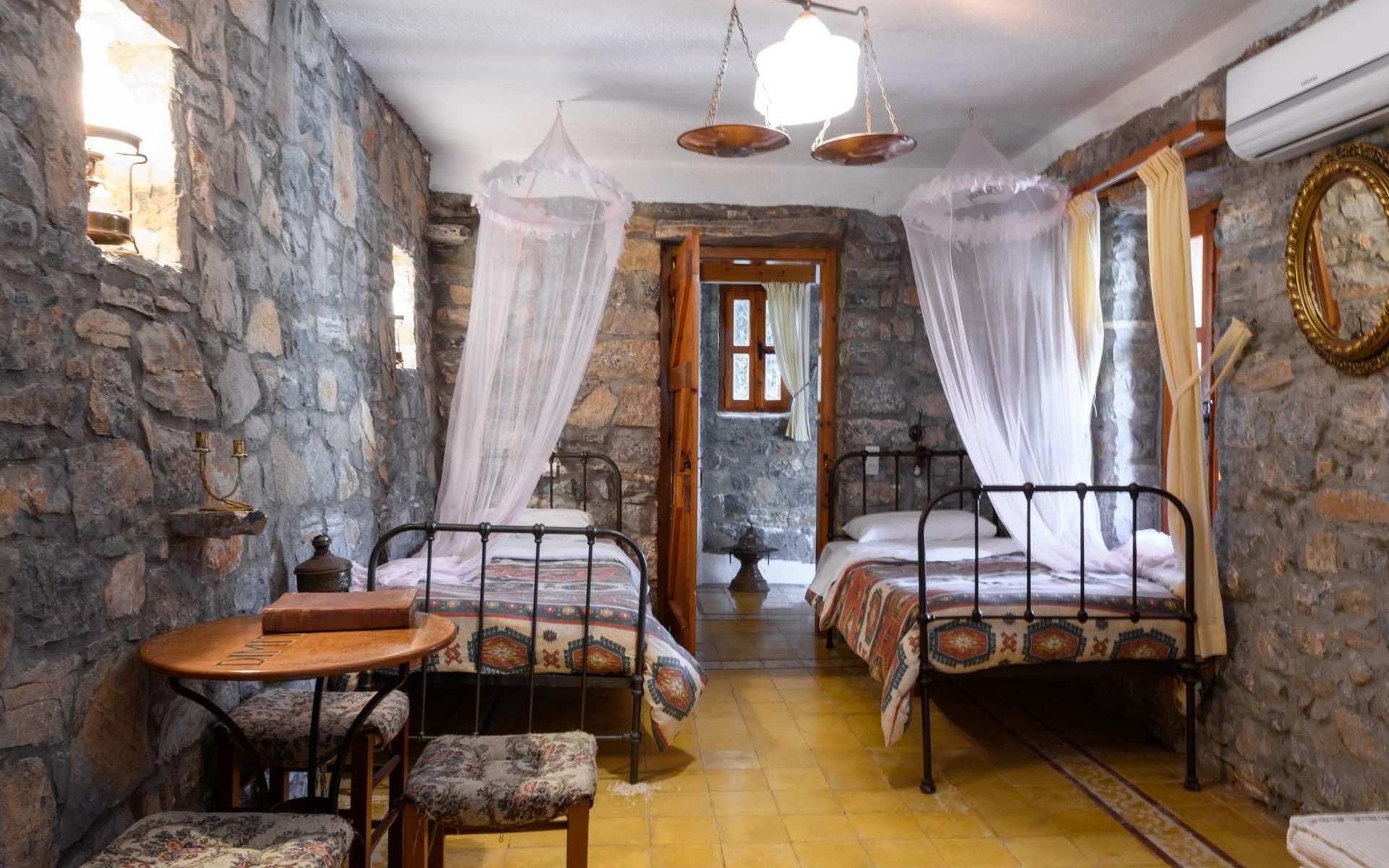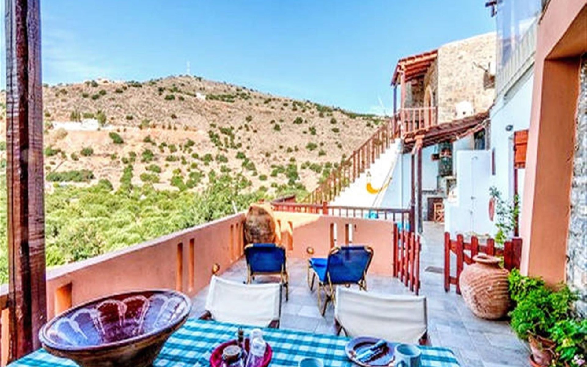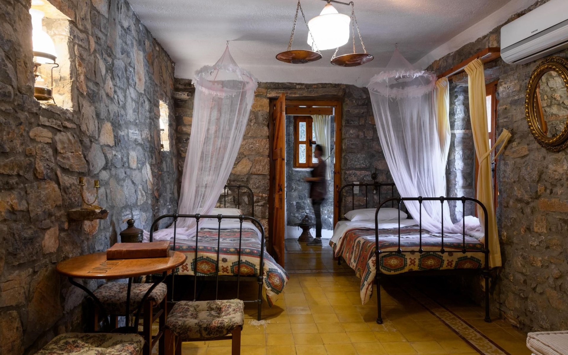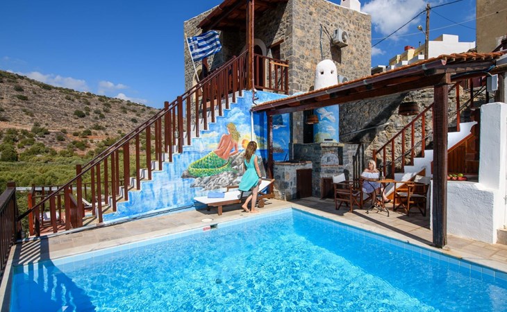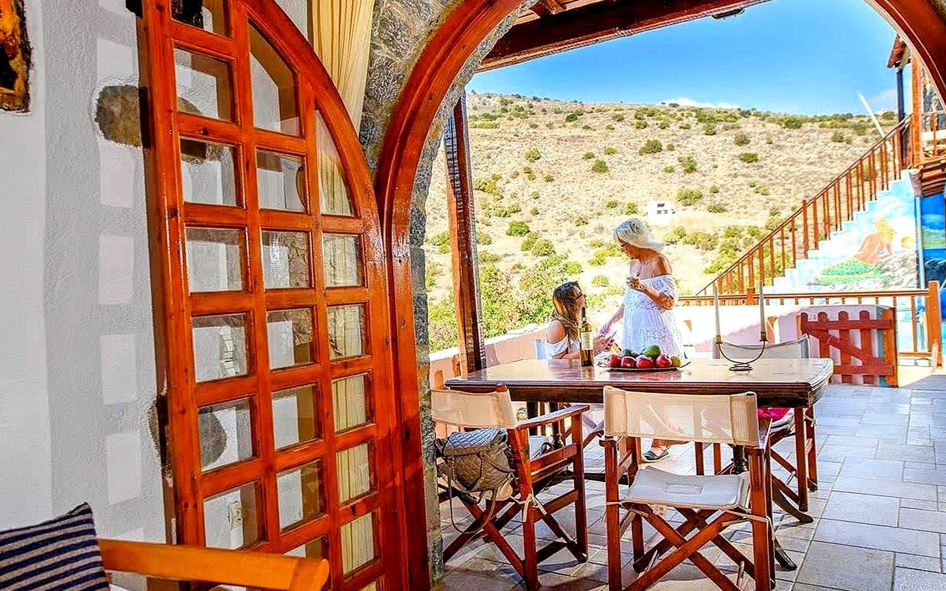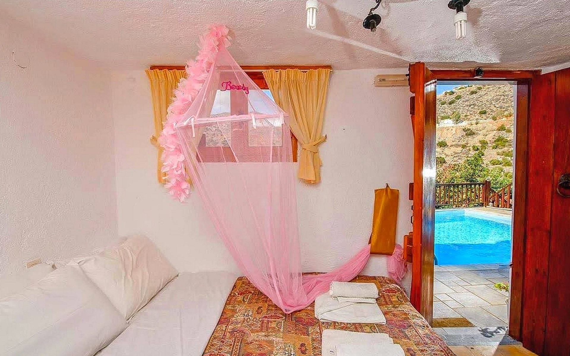 Das traditionell gebaute Haus verbindet rustikale Elemente mit luxuriöser Ausstattung. Das Innere ist mit Sichtmauerwerk, Holzbalken und eleganten Möbeln ausgestattet, die eine warme und gemütliche Atmosphäre schaffen. Es kann 4 Personen beherbergen. Inklusive A/C. Wir betreten den kleinen Ess- und Sitzbereich. Rechts die Küche mit allen Utensilien. Die Tür auf der linken Seite führt zu einem Schlafzimmer mit zwei Einzelbetten und weiter zu einem zweiten Schlafzimmer mit Doppelbett. Angrenzend das Badezimmer mit Jacuzzi. Im Außenbereich gibt es einen privaten Esstisch für vier Erwachsene und einen Swimmingpool, der mit einem anderen Haus geteilt wird. Privatparkplatz für zwei Autos. Alle Möbel sind Kopien von Originalen, die im Historischen Museum von Heraklion, Kreta, gefunden wurden, aber die Lampen und Armaturen sind original. Die Fliesen sind handgefertigt und stammen aus der Zeit um 1920. Sie wurden aus alten, abgerissenen Häusern entnommen und das Marmorwaschbecken wurde in einem türkischen Hammam gefunden. Die Wasserhähne sind Kopien derjenigen aus den 1920er Jahren. Der rötliche Putz an den Wänden besteht aus geschliffenen Fliesen, dem gleichen Material, das in den Klöstern des 14. bis 16. Jahrhunderts verwendet wurde. Es gibt Hinweise darauf, dass sich an dieser Stelle vor vielen Jahren eine Kirche befunden hat.