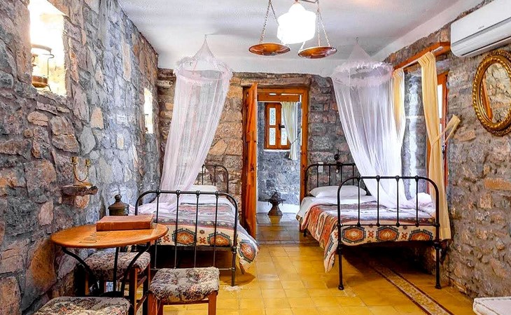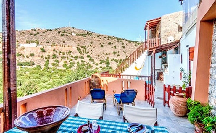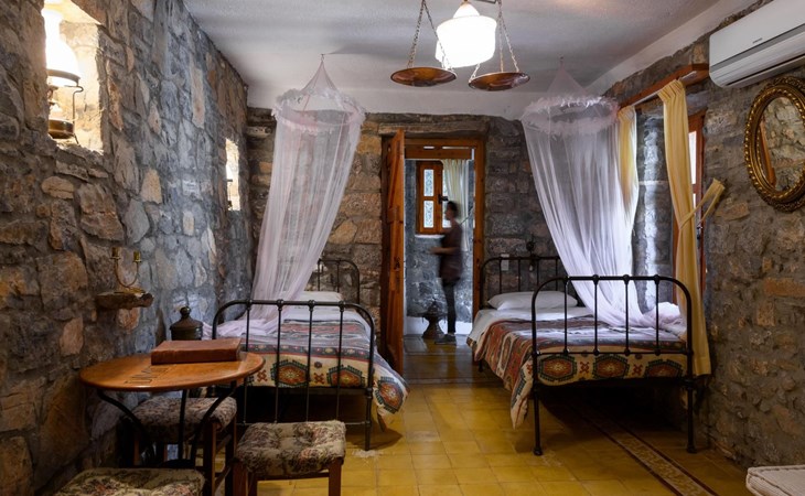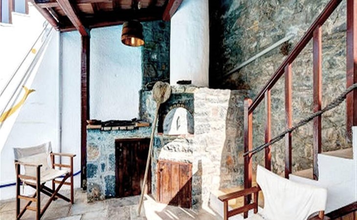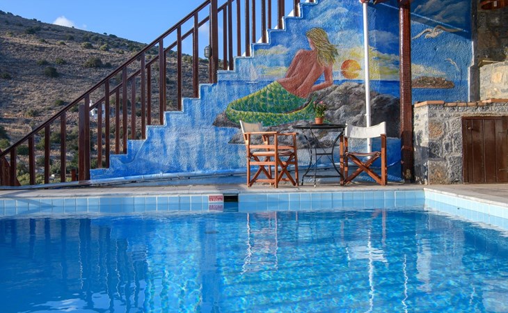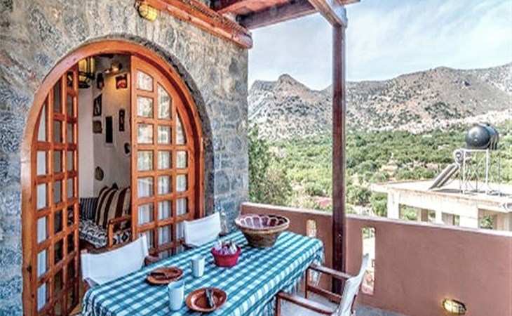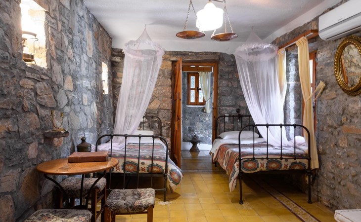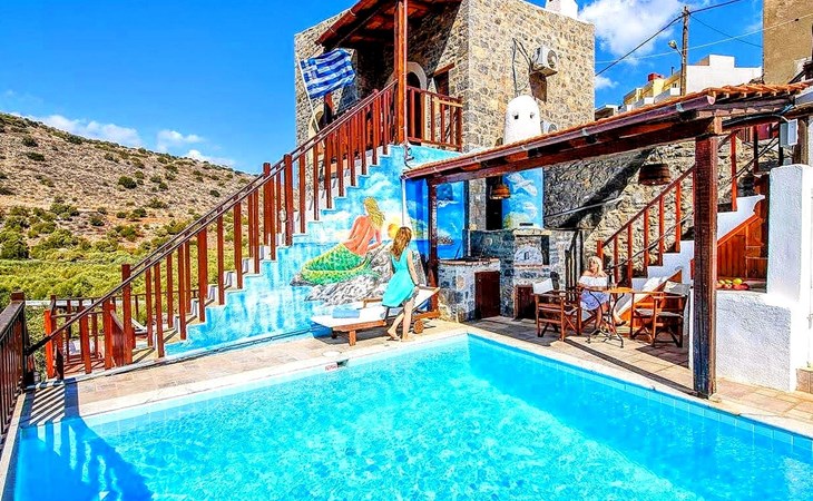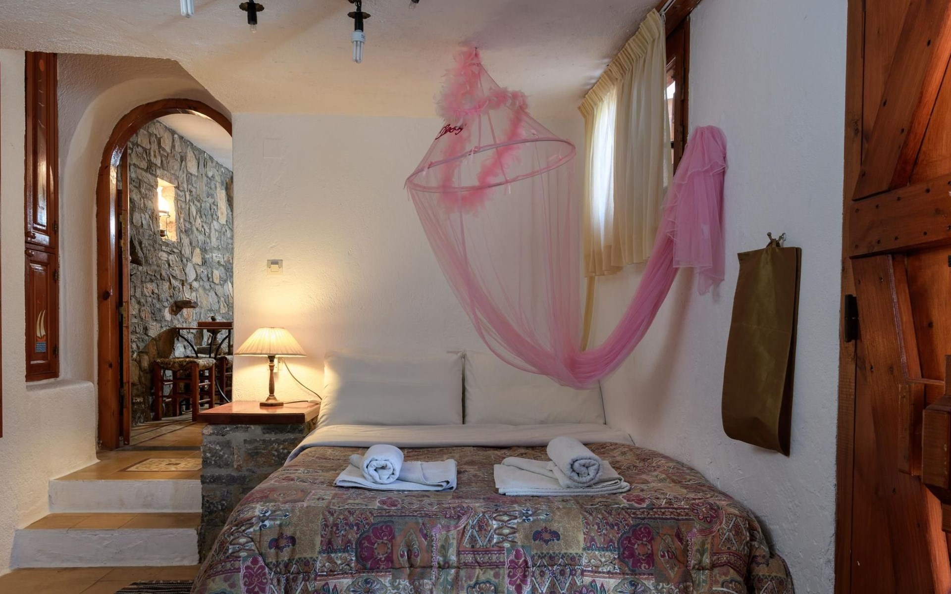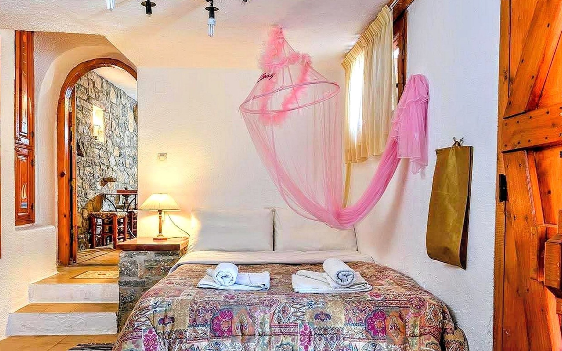 Das traditionell gebaute Haus verbindet rustikale Elemente mit luxuriöser Ausstattung. Das Innere ist mit Sichtmauerwerk, Holzbalken und eleganten Möbeln ausgestattet, die eine warme und gemütliche Atmosphäre schaffen. Es kann 4 Personen beherbergen. Inklusive A/C. Wir betreten den kleinen Ess- und Sitzbereich. Rechts die Küche mit allen Utensilien. Die Tür auf der linken Seite führt zu einem Schlafzimmer mit zwei Einzelbetten und weiter zu einem zweiten Schlafzimmer mit Doppelbett. Angrenzend das Badezimmer mit Jacuzzi. Im Außenbereich gibt es einen privaten Esstisch für vier Erwachsene und einen Swimmingpool, der mit einem anderen Haus geteilt wird. Privatparkplatz für zwei Autos. Alle Möbel sind Kopien von Originalen, die im Historischen Museum von Heraklion, Kreta, gefunden wurden, aber die Lampen und Armaturen sind original. Die Fliesen sind handgefertigt und stammen aus der Zeit um 1920. Sie wurden aus alten, abgerissenen Häusern entnommen und das Marmorwaschbecken wurde in einem türkischen Hammam gefunden. Die Wasserhähne sind Kopien derjenigen aus den 1920er Jahren. Der rötliche Putz an den Wänden besteht aus geschliffenen Fliesen, dem gleichen Material, das in den Klöstern des 14. bis 16. Jahrhunderts verwendet wurde. Es gibt Hinweise darauf, dass sich an dieser Stelle vor vielen Jahren eine Kirche befunden hat.