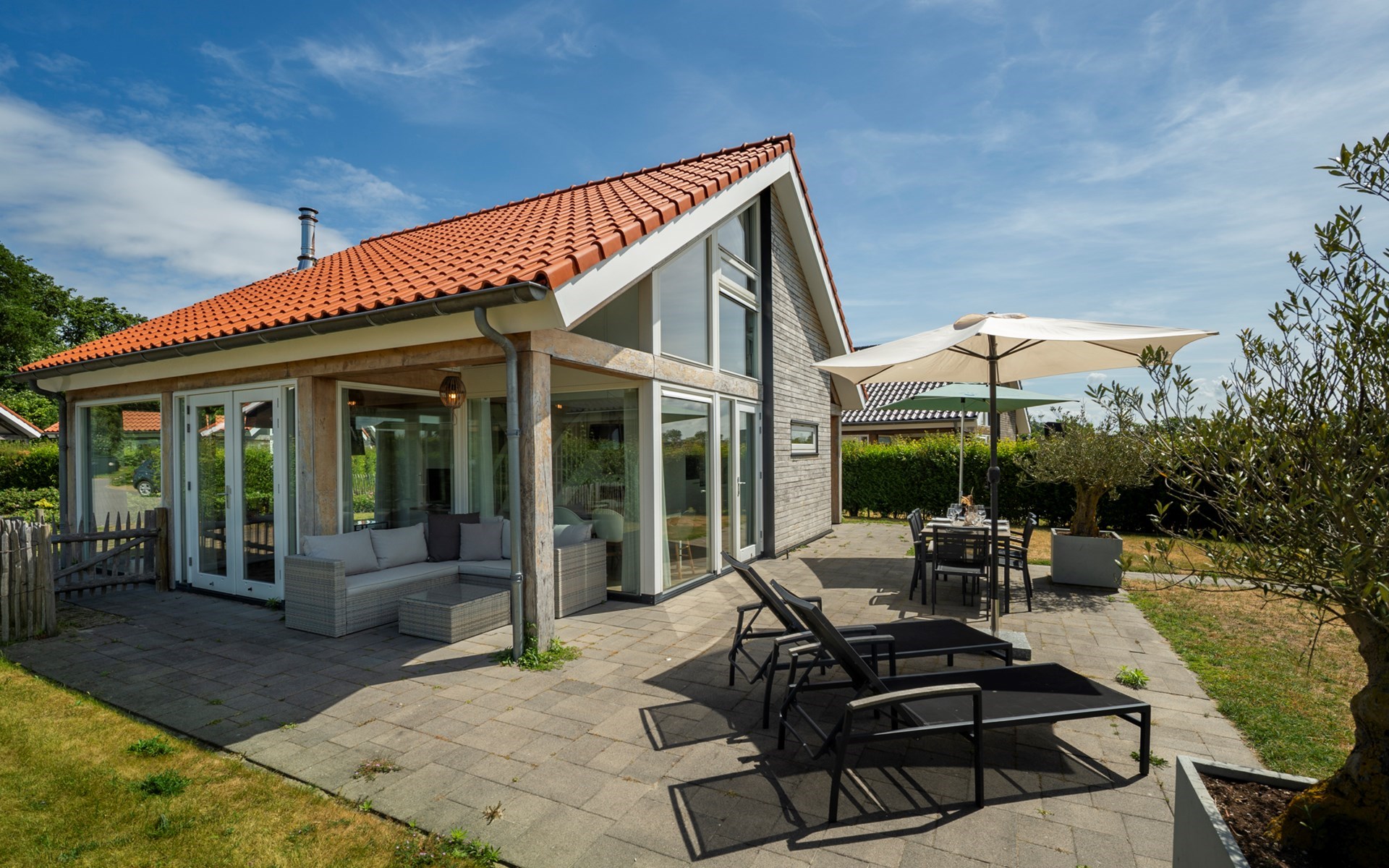 Dieses moderne Ferienhaus ist stilvoll eingerichtet und verfügt über eine komfortable Sitzecke mit angrenzendem Essbereich sowie eine offene Küche, die ein echtes Küstengefühl vermittelt. Die Küche ist mit allem Komfort ausgestattet, einschließlich verschiedener Geräte wie der Miele-Geschirrspüler, aber auch ein Poffertjes-Maker, damit Sie mit Ihren Kindern gemeinsam Poffertjes zubereiten können. Der holzbefeuerte Kamin sorgt für Atmosphäre und Gemütlichkeit im Haus, besonders an kälteren Tagen. Im Erdgeschoss gibt es ein Schlafzimmer mit eigenem Badezimmer sowie eine separate Toilette. Die obere Etage verfügt über zwei Schlafzimmer, ein zusätzliches Badezimmer und eine separate Toilette. Ein besonderes Highlight dieser Unterkunft sind die elektrischen Dachfenster in den oberen Schlafzimmern, die automatisch für Belüftung sorgen. Dadurch bleiben die Räume im Sommer angenehm kühl, insbesondere wenn Sie tagsüber die elektrischen Rollos geschlossen halten – nur einer der vielen Vorteile dieses Hauses in den Sommermonaten.