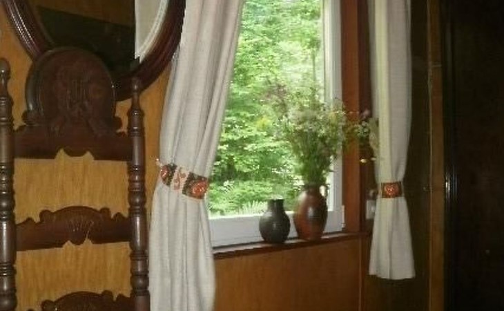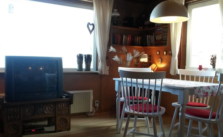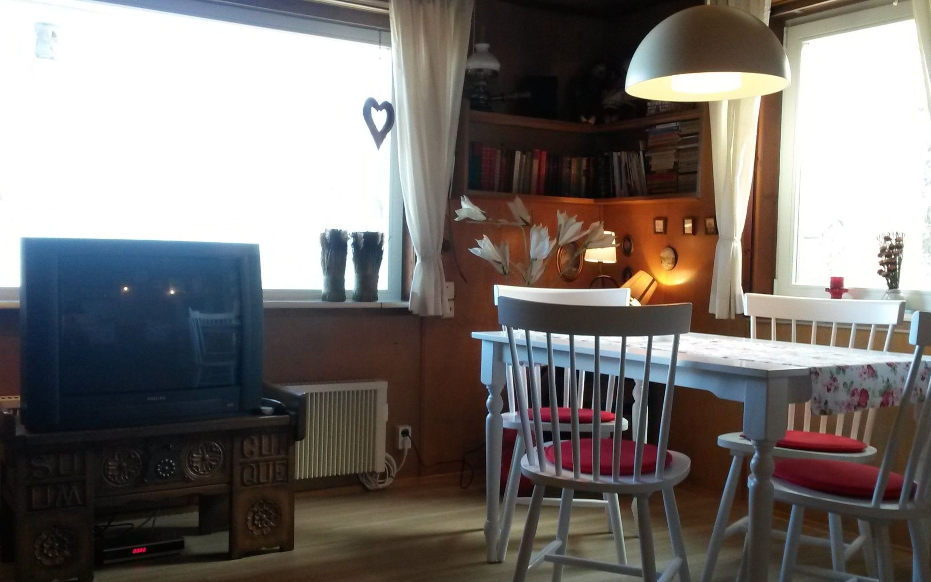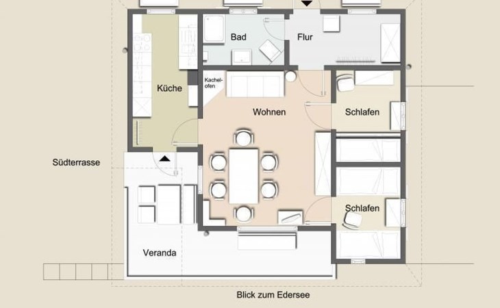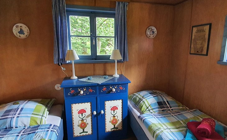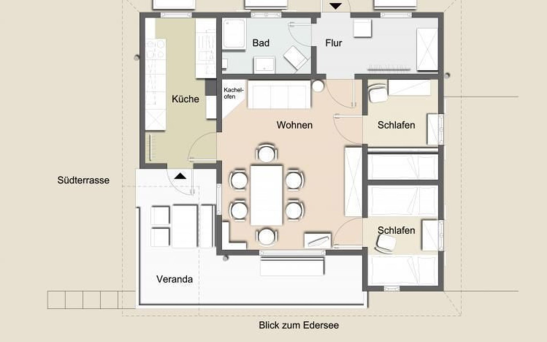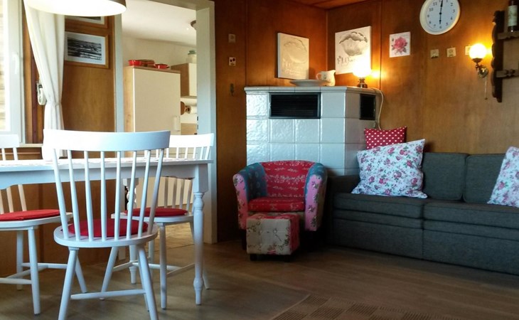 Das Sommerhaus ist gemütlich mit viel Liebe eingerichtet. Vom Wohnzimmerfenster aus haben Sie einen uneingeschränkten Blick auf den Edersee. Der große Kachelofen kann mit Holz beheizt werden. Im alten Bauernschrank befinden sich einige nützliche Dinge und Gesellschaftsspiele. Das Haus verfügt über zwei Schlafräume mit je zwei Schlafkojen links und rechts angeordnet in dem einen Raum und einer Schlafkoje in dem anderen. Die Fenster sind durch Holzläden abdunkelbar. Die Küche ist neben den üblichen Küchenmaschinen mit allen Kochutensilien und Geschirr ausgestattet, um sich selber zu versorgen. Das Bad verfügt über Tageslicht. Im Flur können Sie so einige Sachen verstauen.