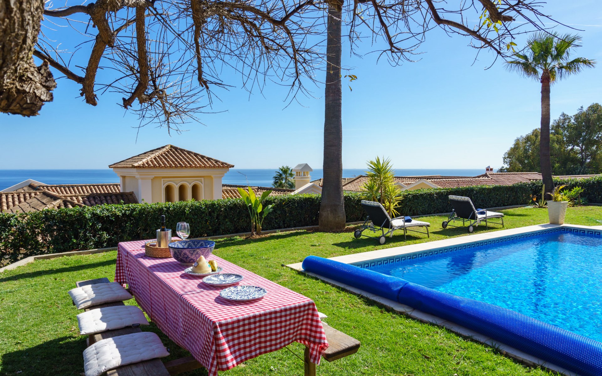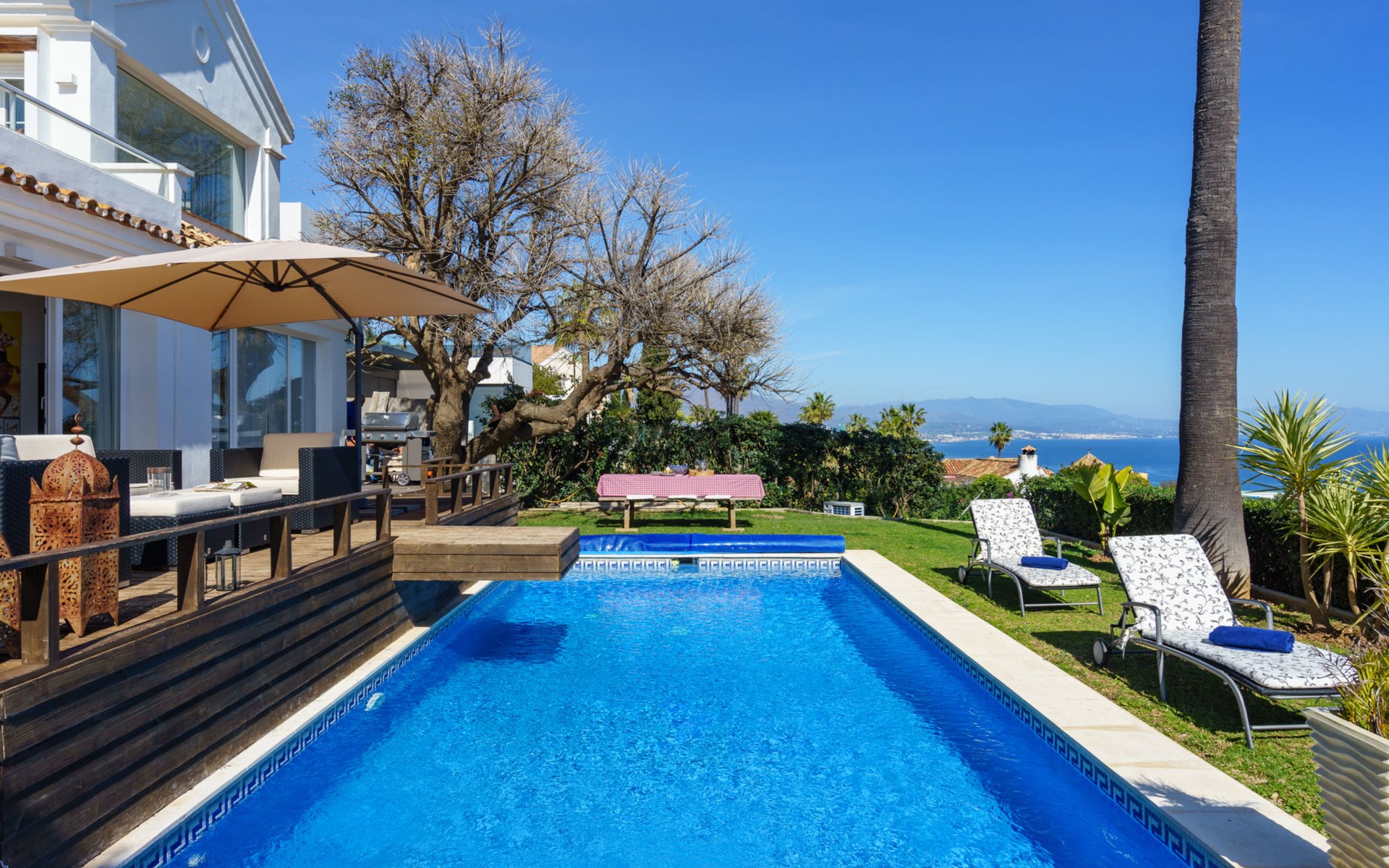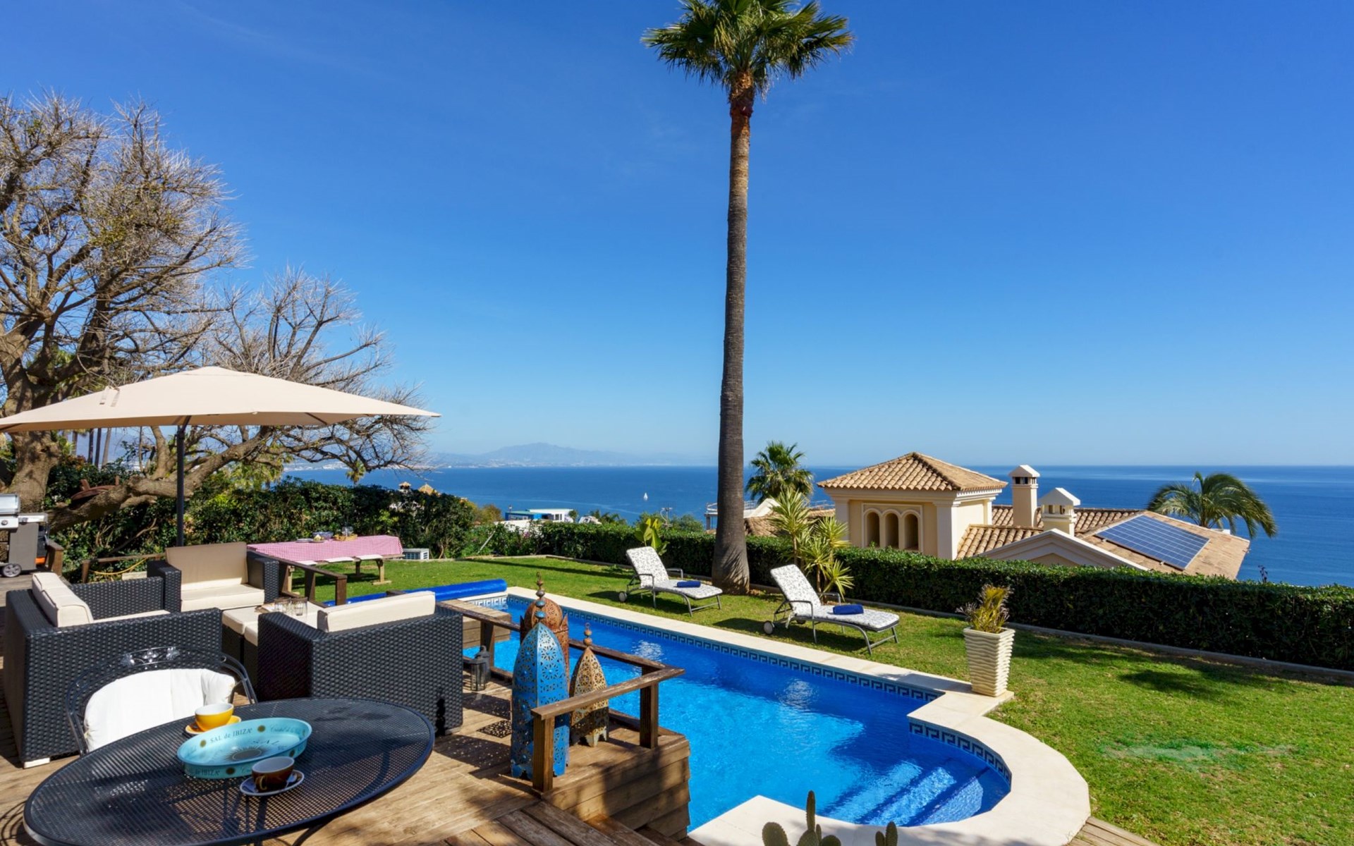 Urbanización La Paloma 9 km von Marina de Sotogrande: Villa "Villa Sara". Auf einem Hügel, 1.3 km vom Meer, 1.3 km vom Strand. Zur Alleinbenutzung: Garten (eingezäunt) mit Rasen, Schwimmbad eckig (8 x 4 m, 200 - 100 cm tief, saisonale Verfügbarkeit: 01.Jan. - 31.Dez.) mit Innentreppe und Salzelektrolyse-Reinigungssystem. Parkplatz auf dem Grundstück. Supermarkt 4.8 km, Einkaufszentrum 10.5 km, Restaurant 1.6 km, Café 600 m, Bushaltestelle "Duquesa West" 6 km, Bahnstation "Algeciras" 37.5 km, Sandstrand "Las Arenas" 1.7 km, Steinstrand "Cala de la sardina" 1.3 km. Sporthafen 6 km, Jacht-Hafen 8.3 km, Golfplatz (18 Loch) 6.6 km, Segelschule 10.2 km, Tennis 9.4 km, Minigolf 12.6 km, Reitstall 10.8 km. Nahe gelegene Sehenswürdigkeiten: Gibraltar 33.8 km, Puerto Deportivo Sotogrande 8.3 km, Estepona Casco Antiguo 18.6 km, Ciudad Romana de Acinipo 102 km, Ronda 83.4 km, Tarifa Beach 59.2 km. Wandergebiete: El Caminito del Rey 118 km. Bitte beachten: Fahrzeug empfohlen. Der Besitzer akzeptiert keine Jugendgruppen. Die Anlage wird nachts überwacht. Die Nachbarschaft ist sehr lärmempfindlich. Ruhe und gutes Benehmen wird erwartet.