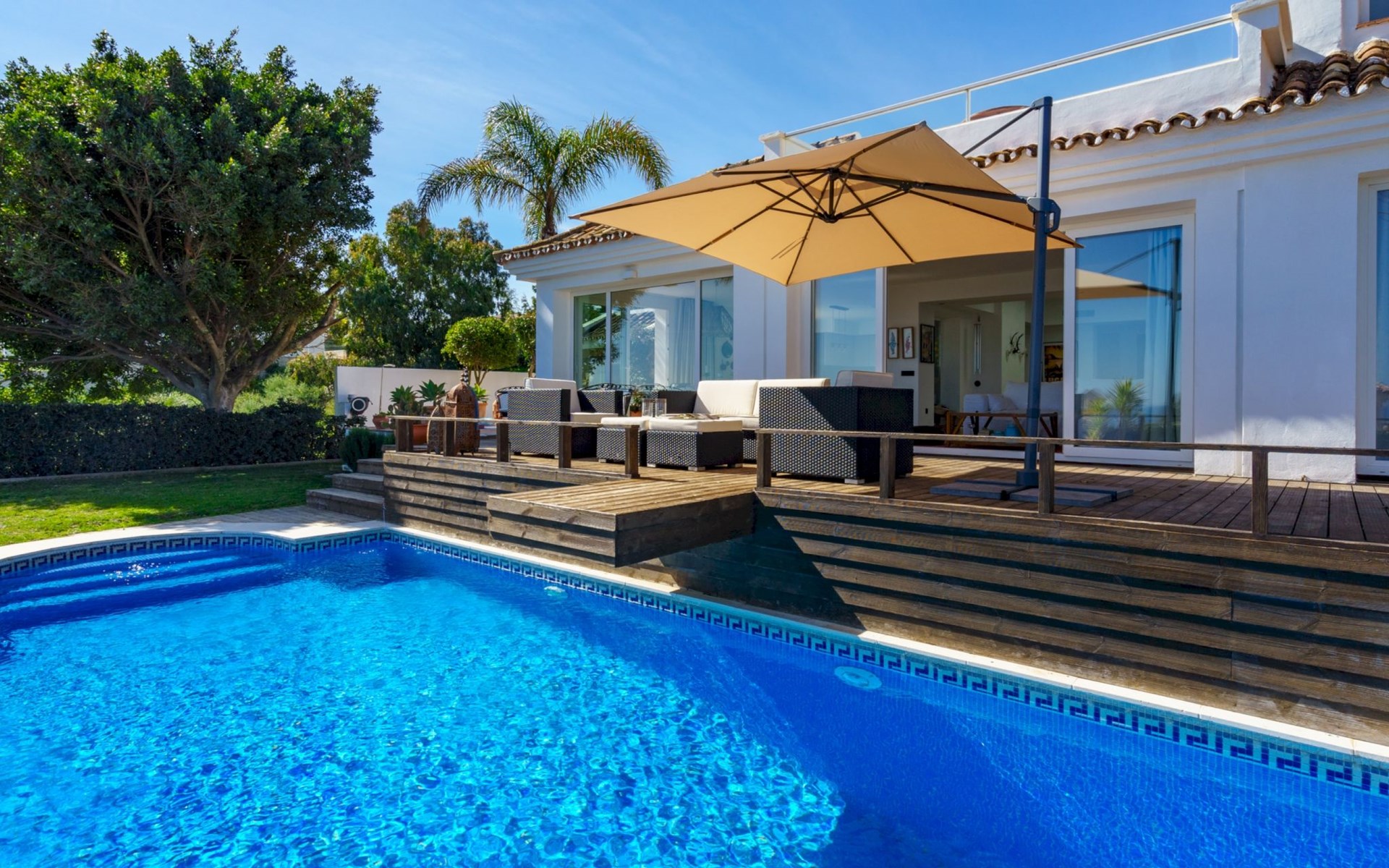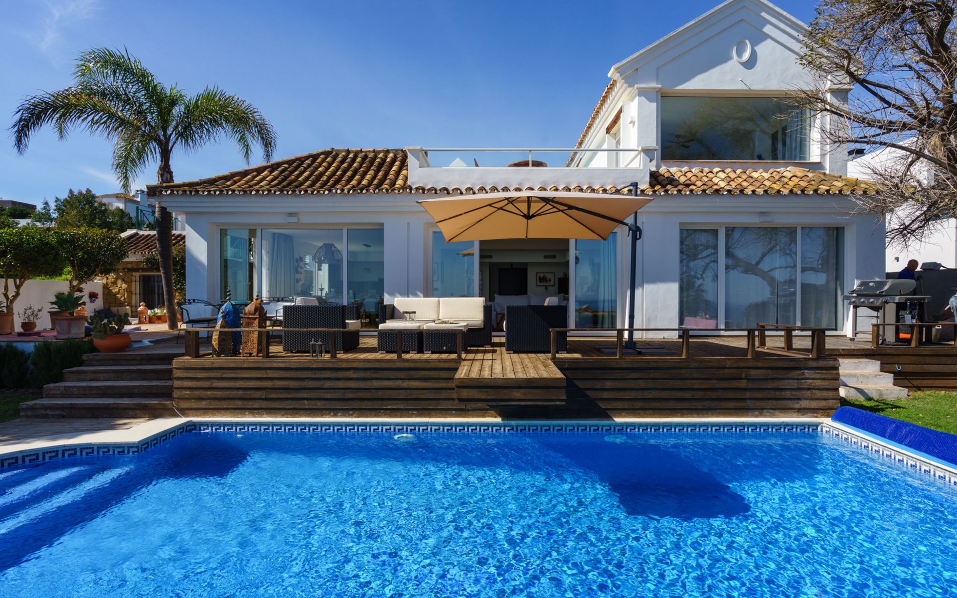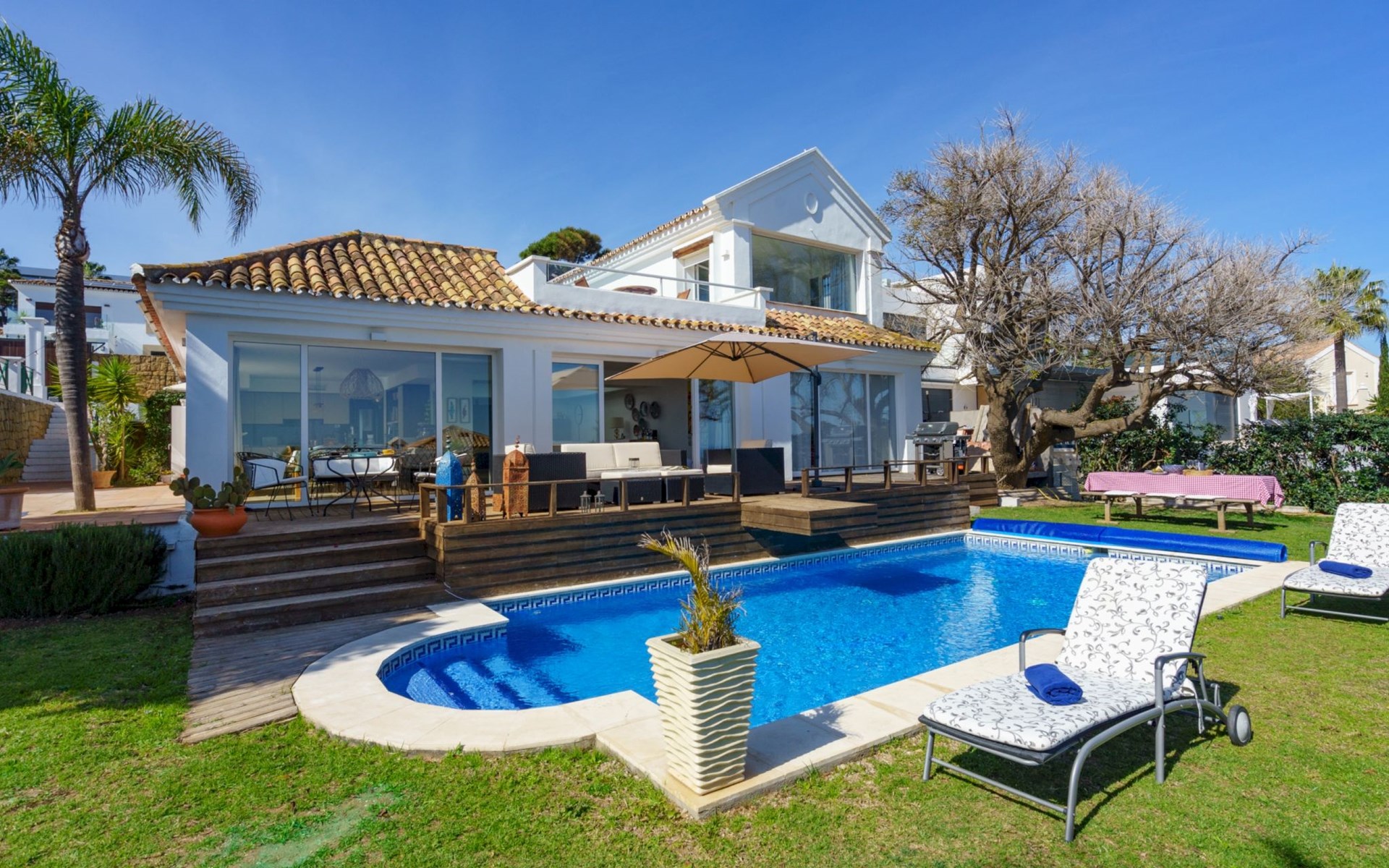Urbanización La Paloma 9 km von Marina de Sotogrande: Villa "Villa Sara". Auf einem Hügel, 1.3 km vom Meer, 1.3 km vom Strand. Zur Alleinbenutzung: Garten (eingezäunt) mit Rasen, Schwimmbad eckig (8 x 4 m, 200 - 100 cm tief, saisonale Verfügbarkeit: 01.Jan. - 31.Dez.) mit Innentreppe und Salzelektrolyse-Reinigungssystem. Parkplatz auf dem Grundstück. Supermarkt 4.8 km, Einkaufszentrum 10.5 km, Restaurant 1.6 km, Café 600 m, Bushaltestelle "Duquesa West" 6 km, Bahnstation "Algeciras" 37.5 km, Sandstrand "Las Arenas" 1.7 km, Steinstrand "Cala de la sardina" 1.3 km. Sporthafen 6 km, Jacht-Hafen 8.3 km, Golfplatz (18 Loch) 6.6 km, Segelschule 10.2 km, Tennis 9.4 km, Minigolf 12.6 km, Reitstall 10.8 km. Nahe gelegene Sehenswürdigkeiten: Gibraltar 33.8 km, Puerto Deportivo Sotogrande 8.3 km, Estepona Casco Antiguo 18.6 km, Ciudad Romana de Acinipo 102 km, Ronda 83.4 km, Tarifa Beach 59.2 km. Wandergebiete: El Caminito del Rey 118 km. Bitte beachten: Fahrzeug empfohlen. Der Besitzer akzeptiert keine Jugendgruppen. Die Anlage wird nachts überwacht. Die Nachbarschaft ist sehr lärmempfindlich. Ruhe und gutes Benehmen wird erwartet.