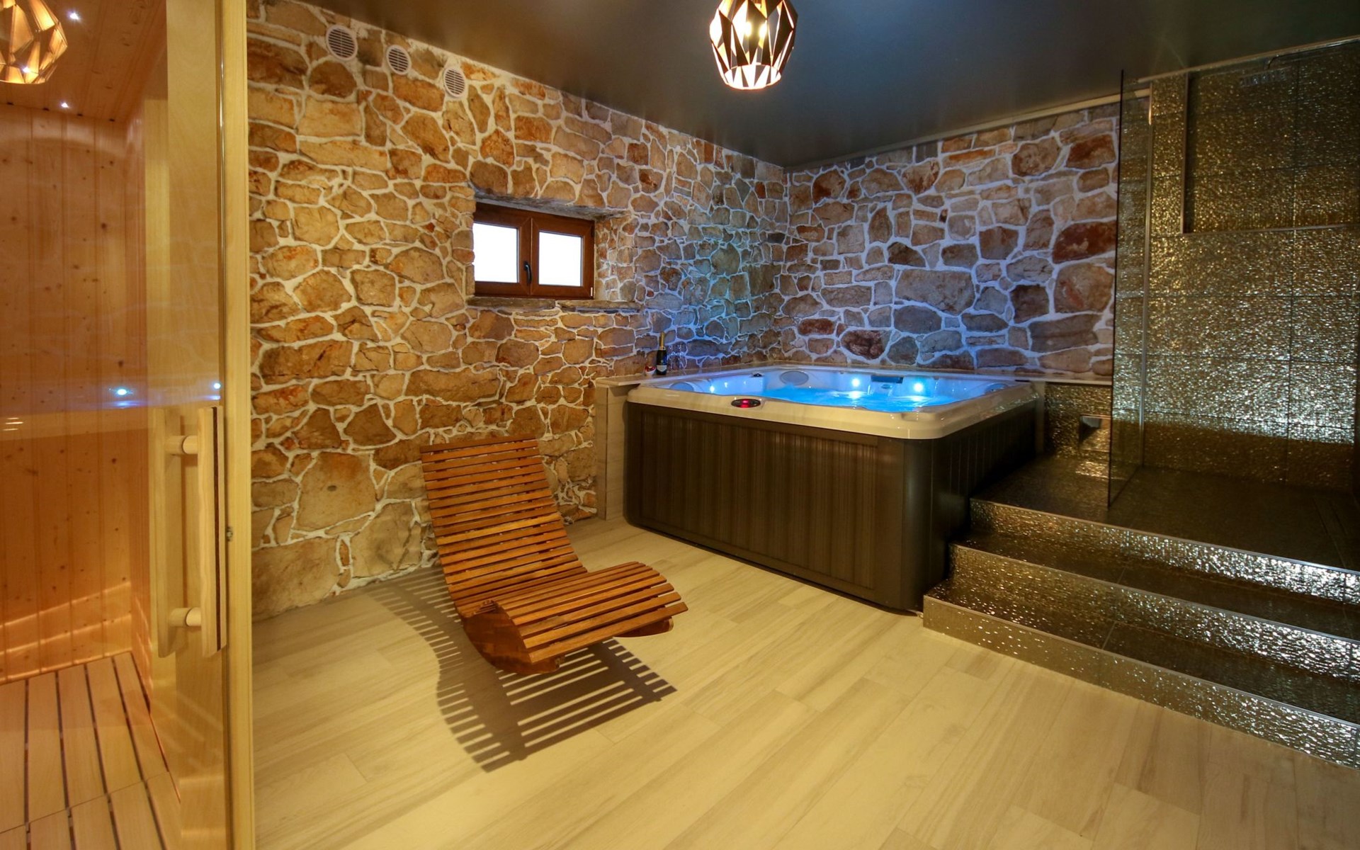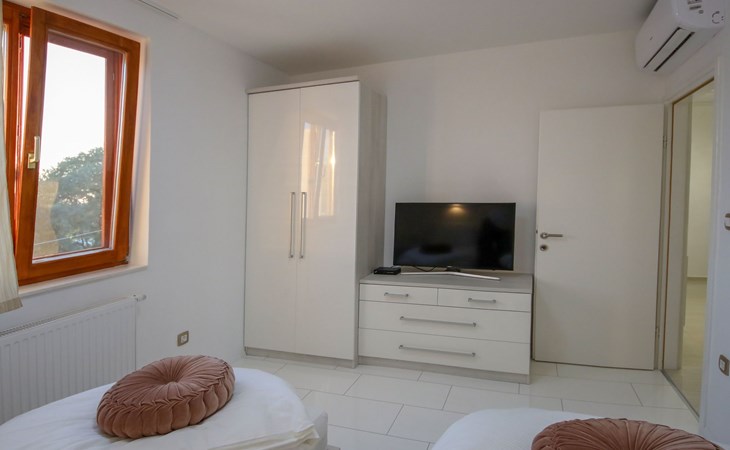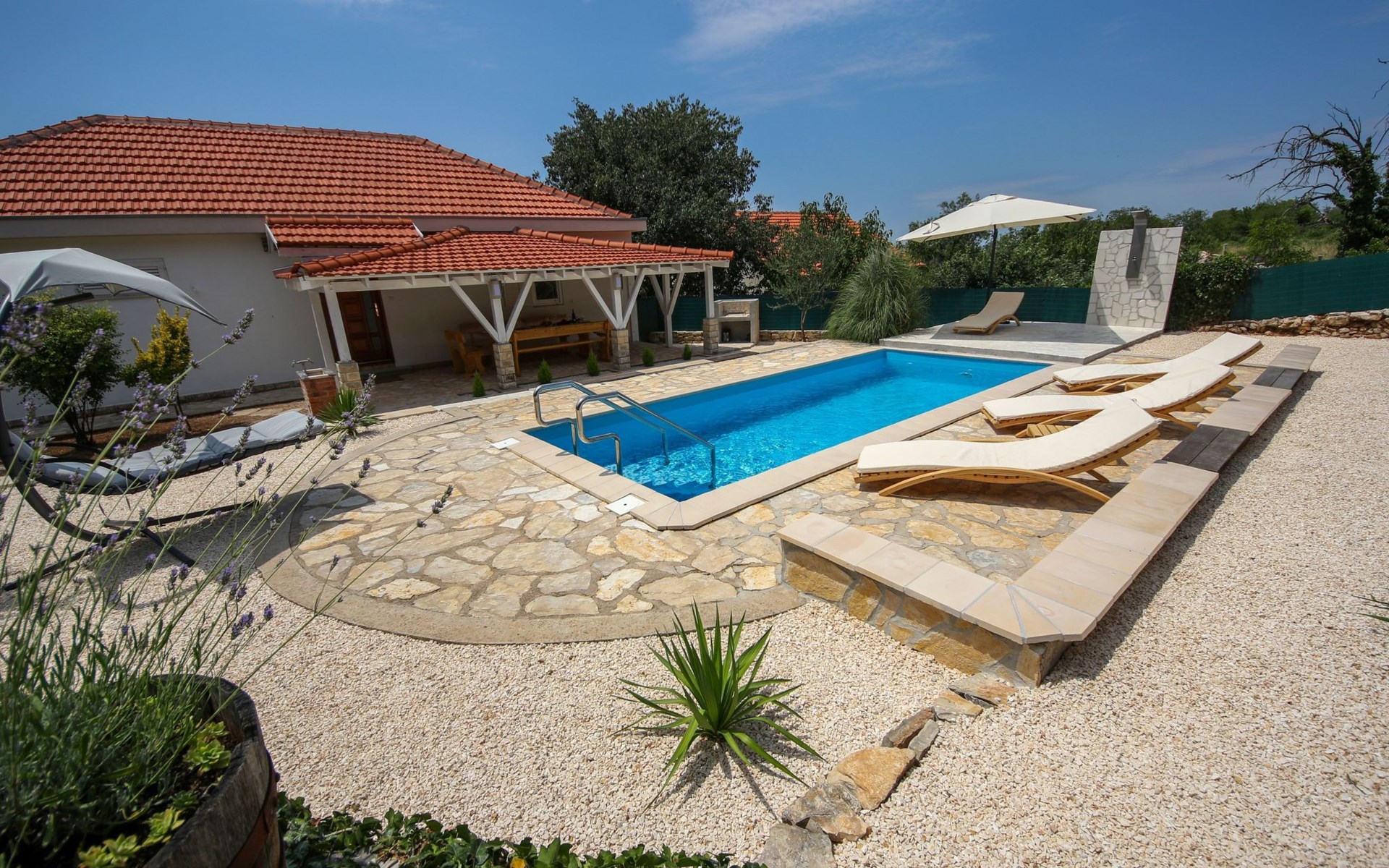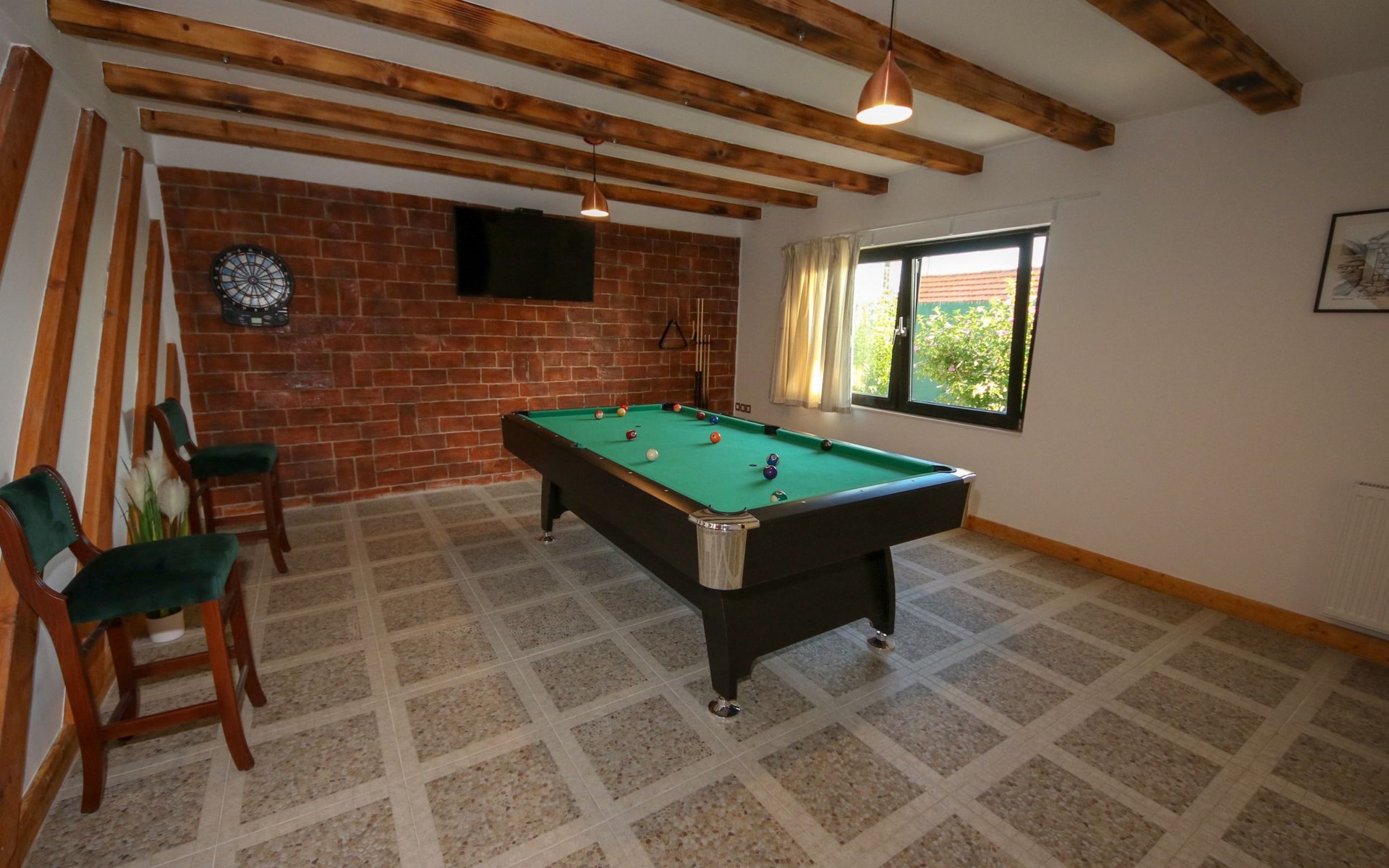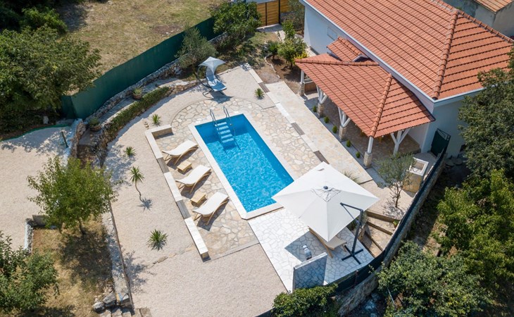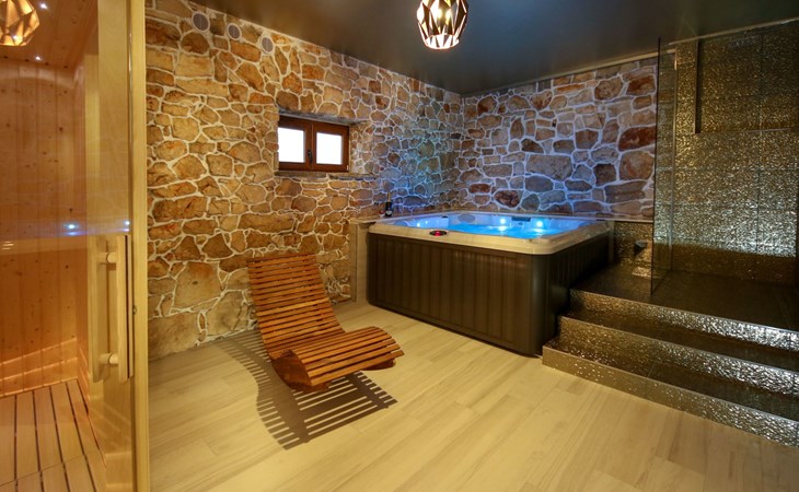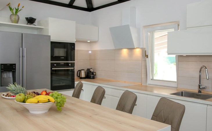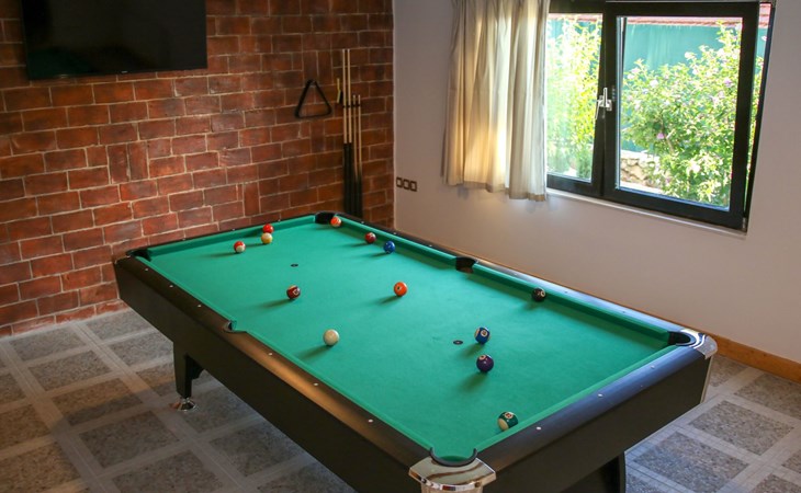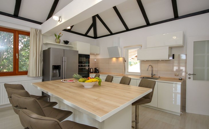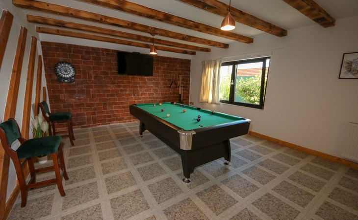 Die Landhausvilla Gabriel bietet Platz für bis zu 8 Personen in 3 Schlafzimmern, von denen eines ein eigenes Bad hat. Die Klimaanlage ist im ganzen Haus verteilt und sorgt für eine kühle Temperatur an den heißen Sommertagen. Weitere 2 Badezimmer stehen den Gästen zur Verfügung. Eine Besonderheit des Hauses ist der Wellnessbereich mit Toilette, Jacuzzi und Sauna. Die Gäste können auch den Billardtisch, Darts und Tischtennis nutzen. Die Villa verfügt über ein geräumiges Wohnzimmer mit einem Kamin und einer PS4-Spielkonsole.