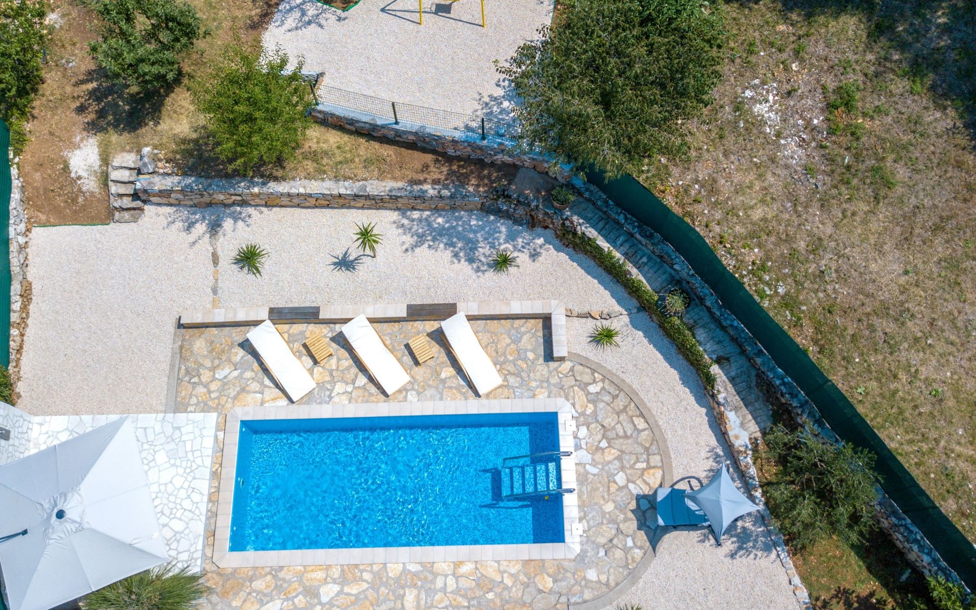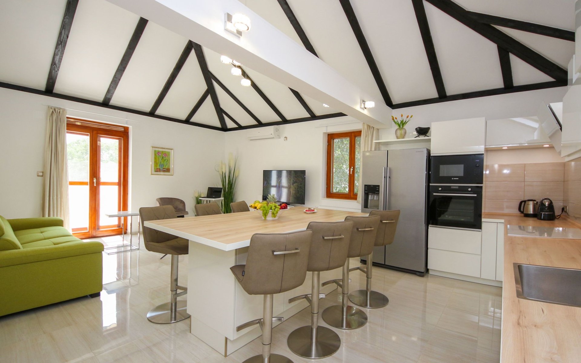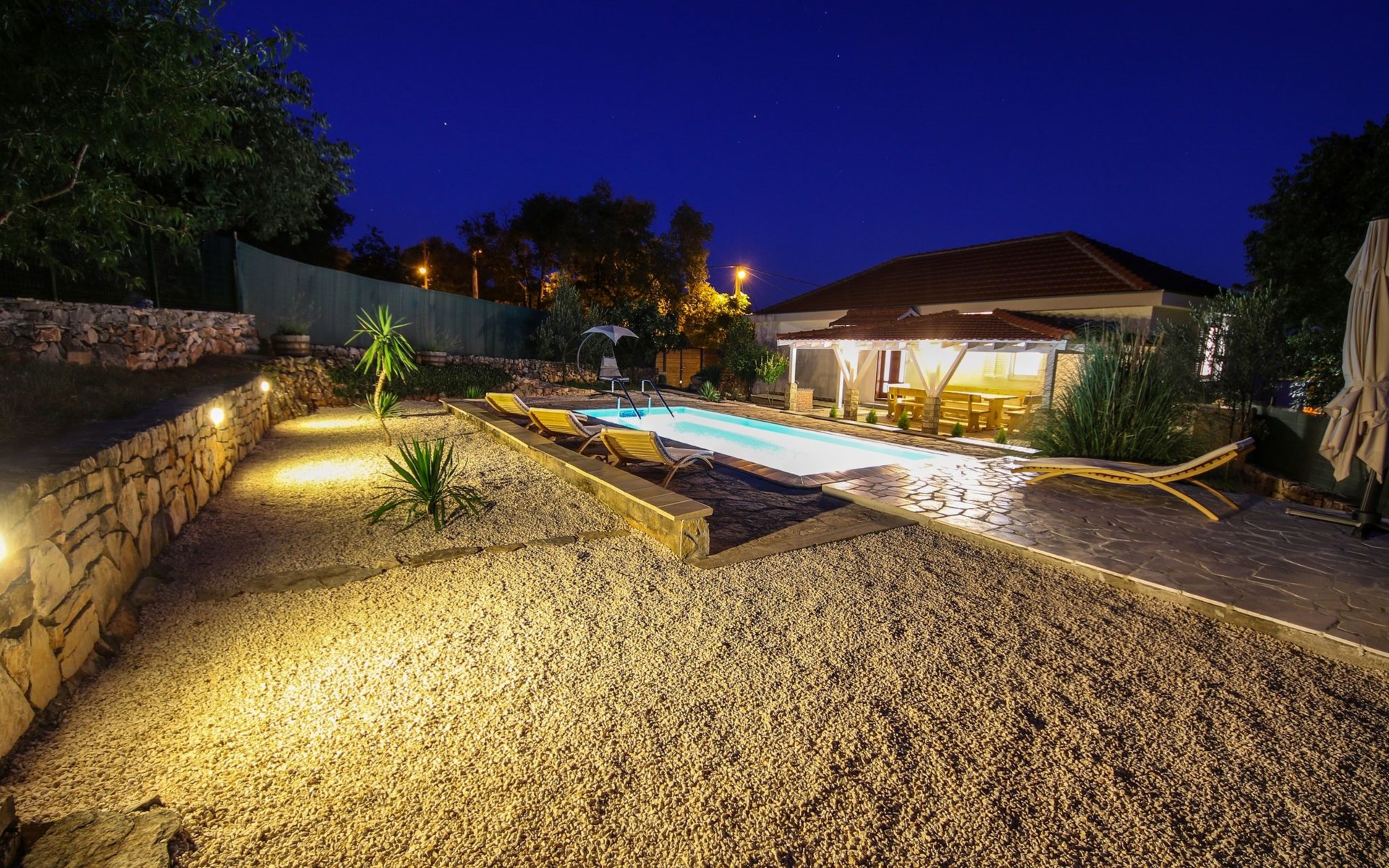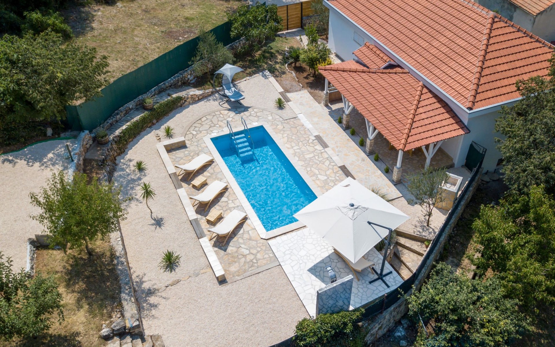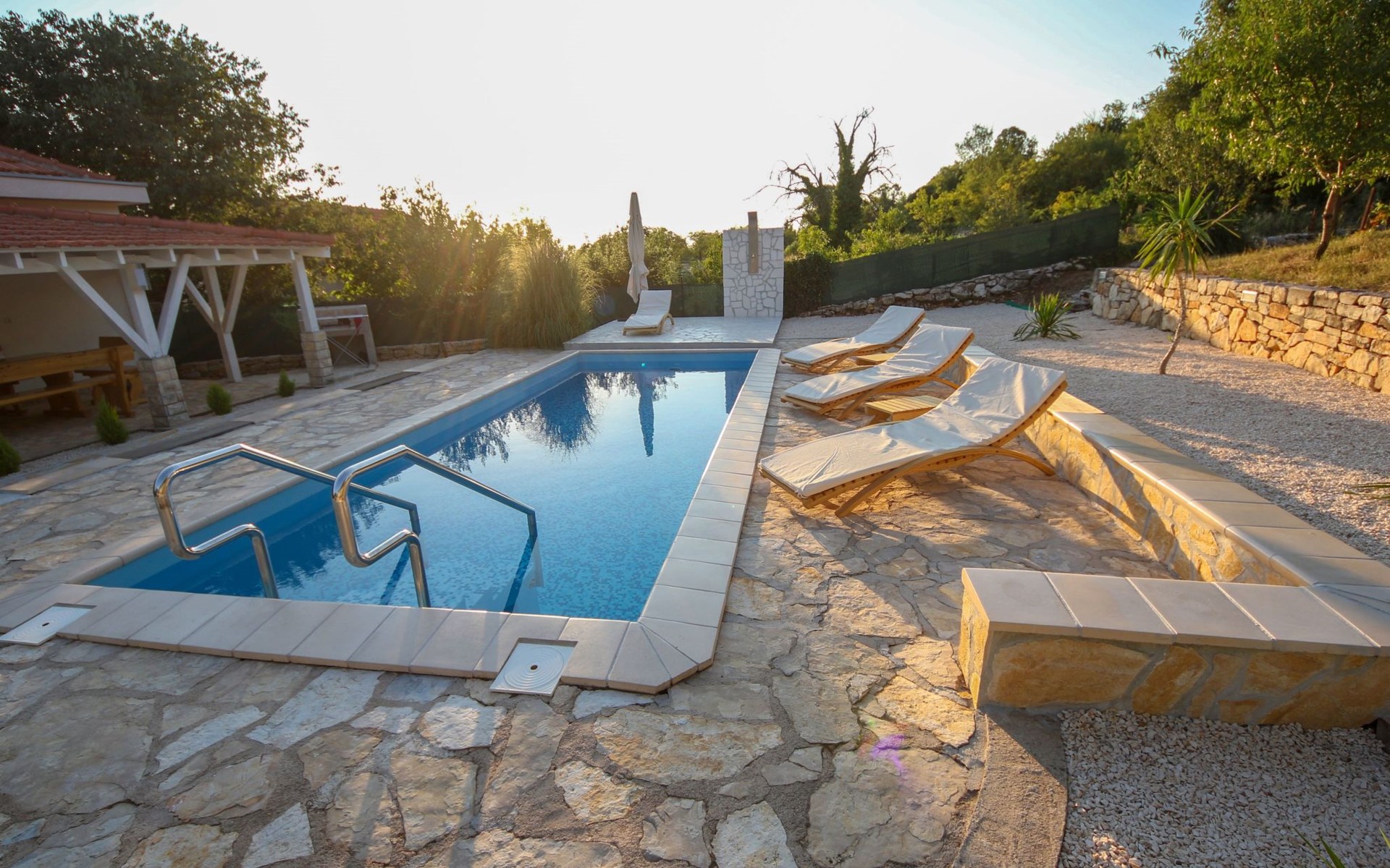 Die Landhausvilla Gabriel bietet Platz für bis zu 8 Personen in 3 Schlafzimmern, von denen eines ein eigenes Bad hat. Die Klimaanlage ist im ganzen Haus verteilt und sorgt für eine kühle Temperatur an den heißen Sommertagen. Weitere 2 Badezimmer stehen den Gästen zur Verfügung. Eine Besonderheit des Hauses ist der Wellnessbereich mit Toilette, Jacuzzi und Sauna. Die Gäste können auch den Billardtisch, Darts und Tischtennis nutzen. Die Villa verfügt über ein geräumiges Wohnzimmer mit einem Kamin und einer PS4-Spielkonsole.