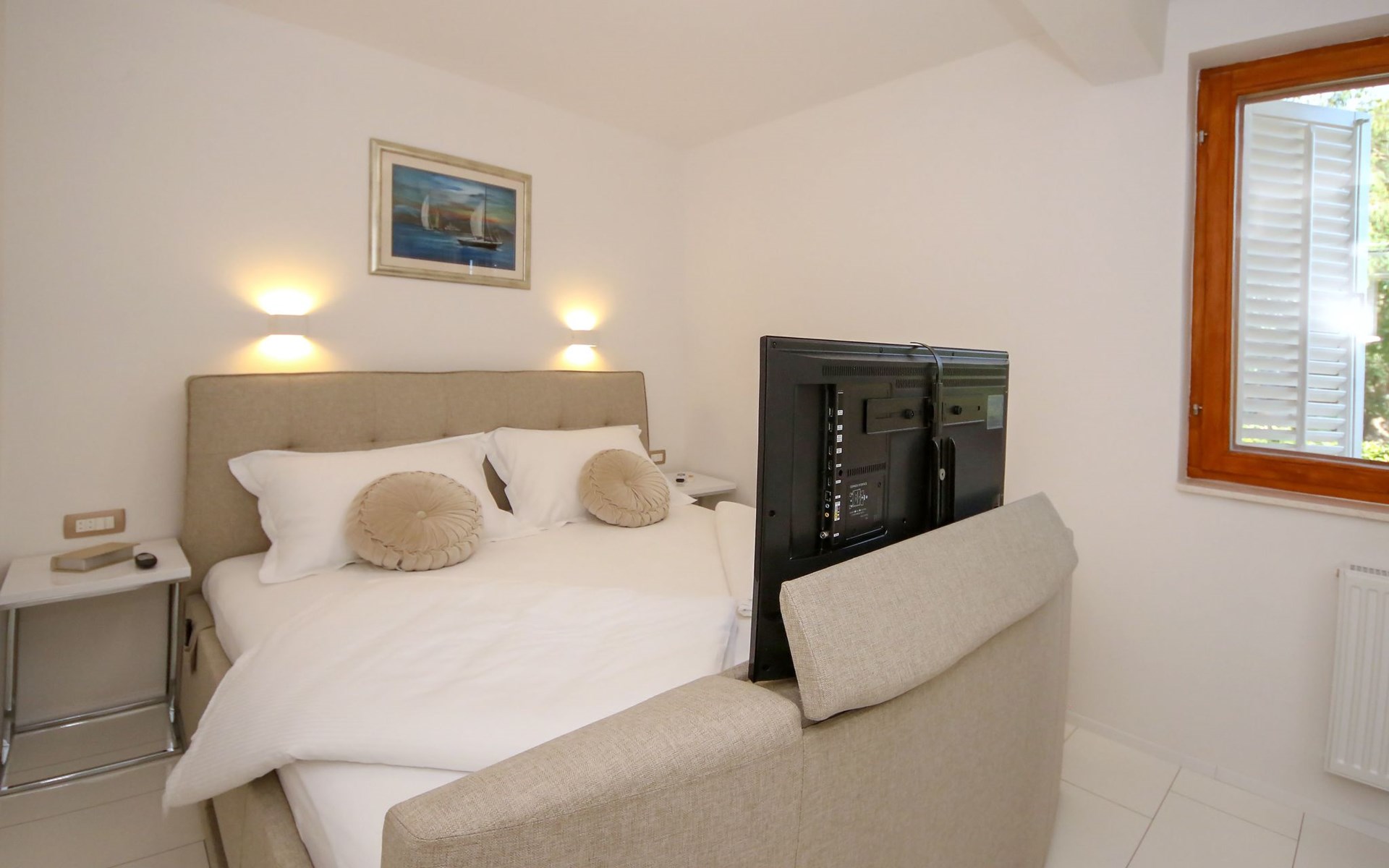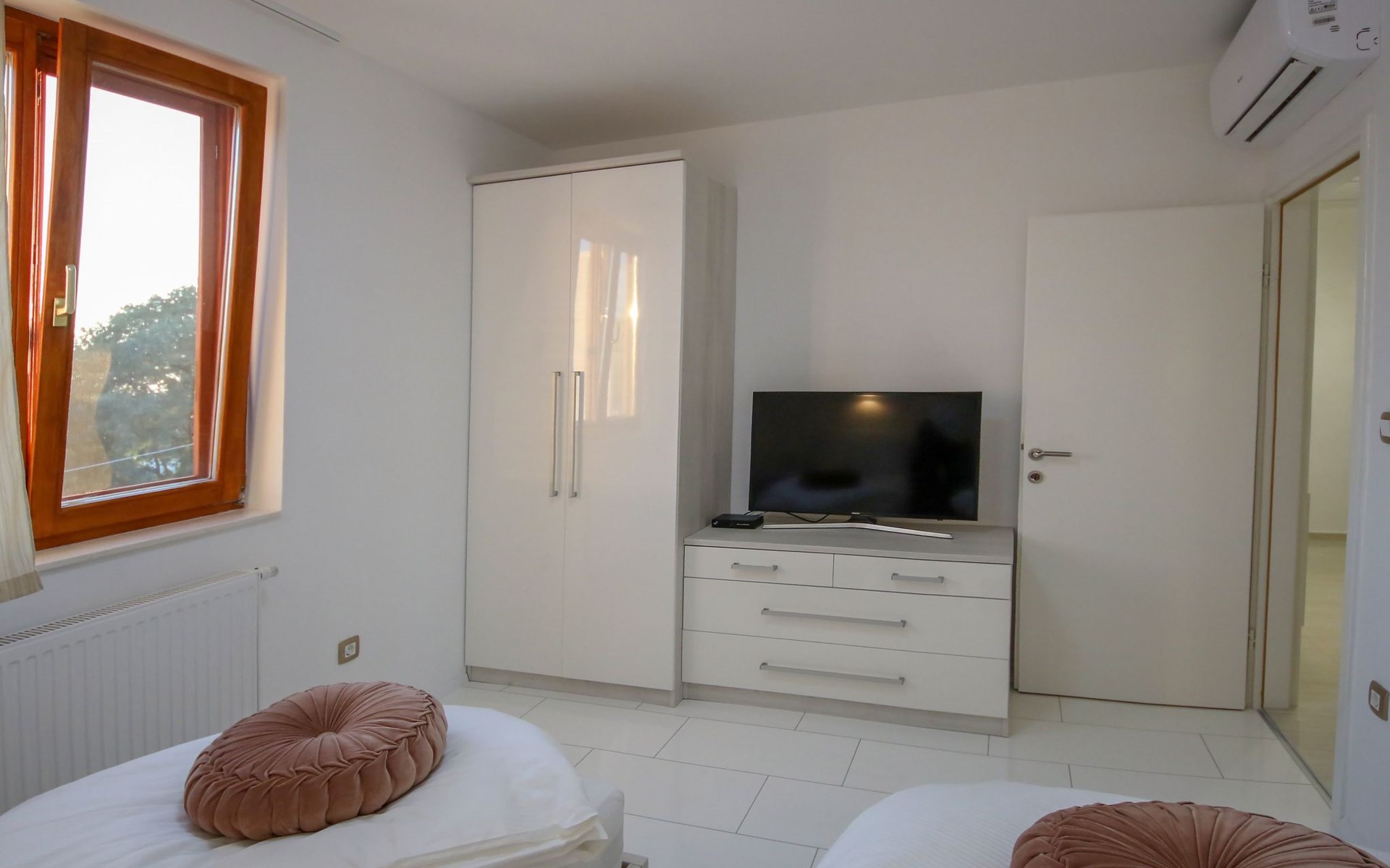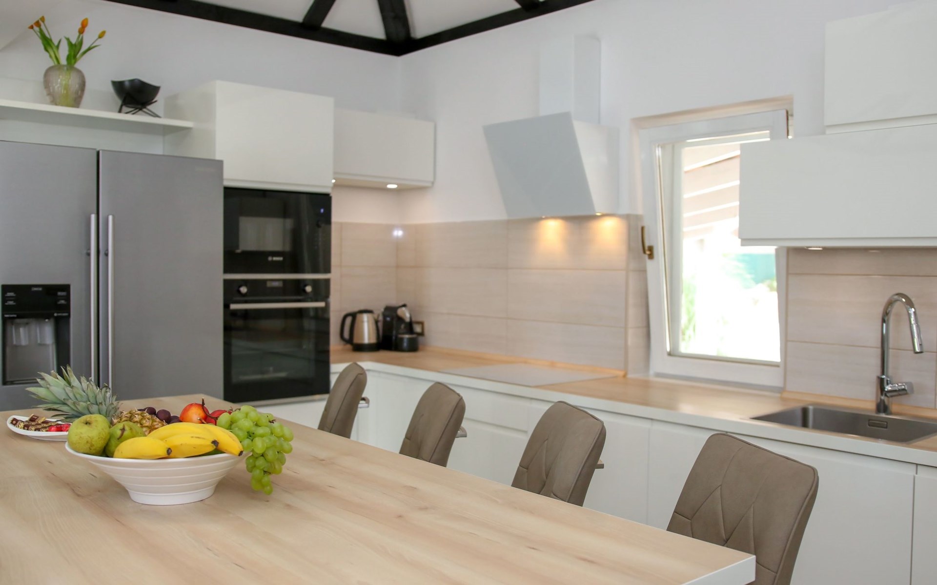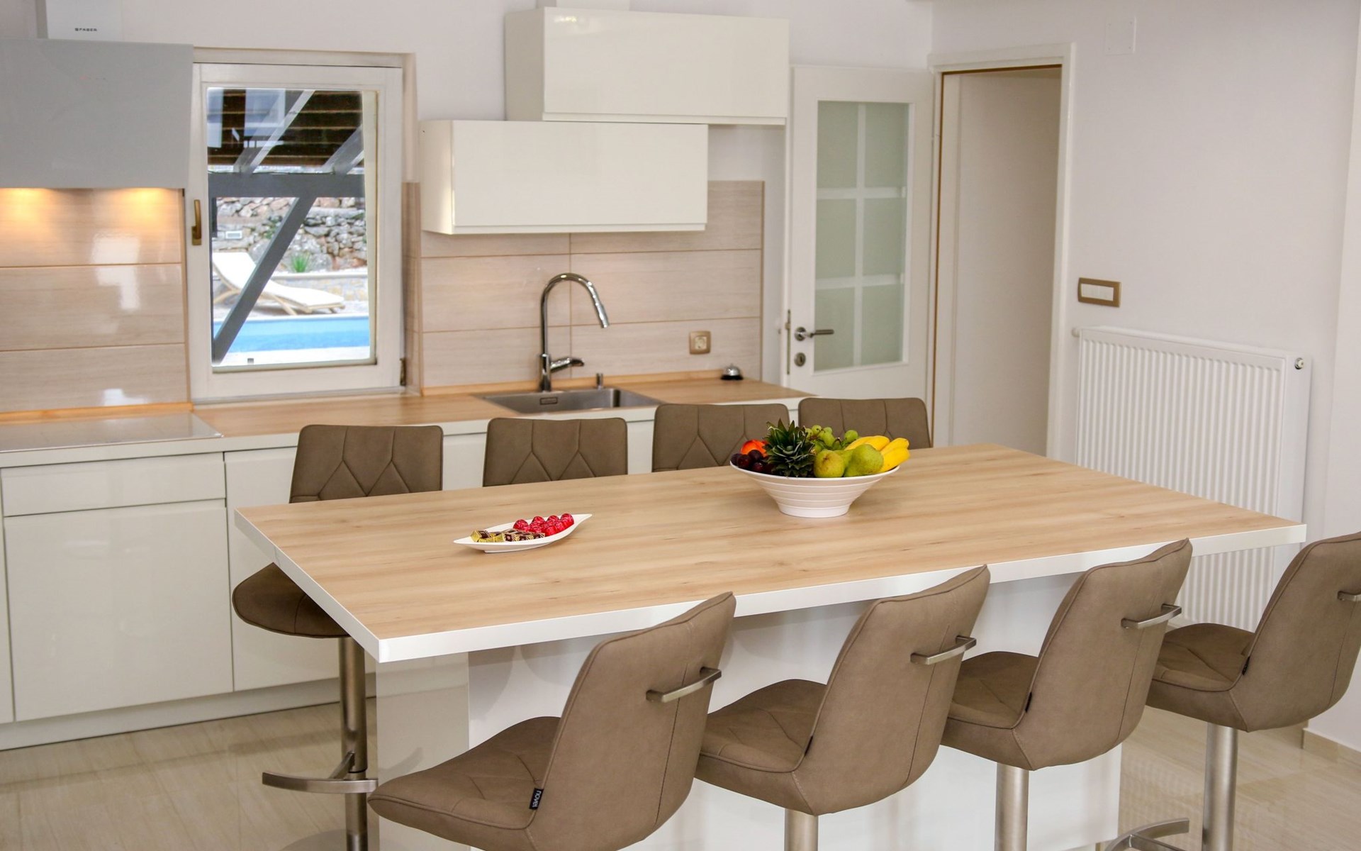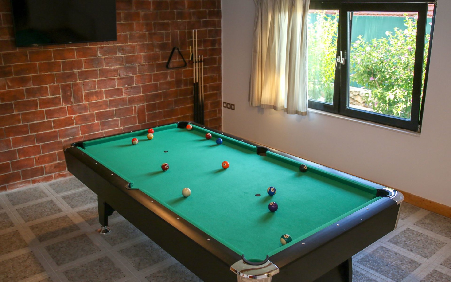 Die Landhausvilla Gabriel bietet Platz für bis zu 8 Personen in 3 Schlafzimmern, von denen eines ein eigenes Bad hat. Die Klimaanlage ist im ganzen Haus verteilt und sorgt für eine kühle Temperatur an den heißen Sommertagen. Weitere 2 Badezimmer stehen den Gästen zur Verfügung. Eine Besonderheit des Hauses ist der Wellnessbereich mit Toilette, Jacuzzi und Sauna. Die Gäste können auch den Billardtisch, Darts und Tischtennis nutzen. Die Villa verfügt über ein geräumiges Wohnzimmer mit einem Kamin und einer PS4-Spielkonsole.
