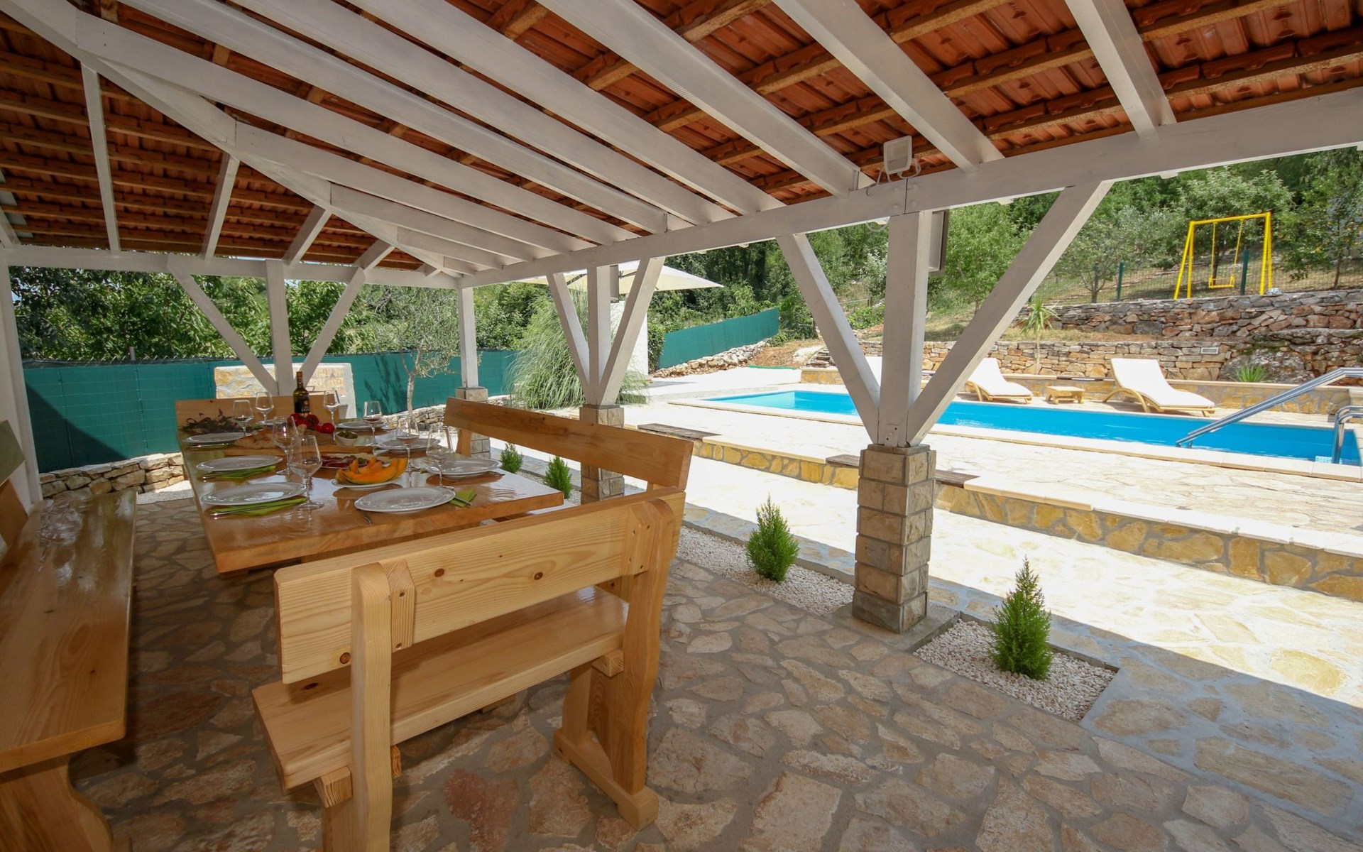 Auf der Außenseite des Hauses gibt es einen Swimmingpool mit 5 Liegestühlen und einem Sonnenschirm, sowie einen Kinderspielplatz. Diese Villa ist die perfekte Wahl für einen erholsamen Urlaub in einer ruhigen Gegend, umgeben von Natur, weit weg von den Menschenmassen der Stadt.