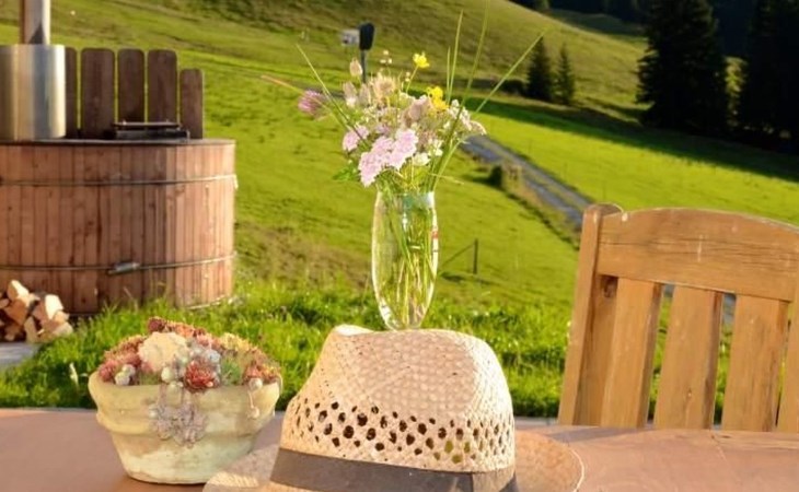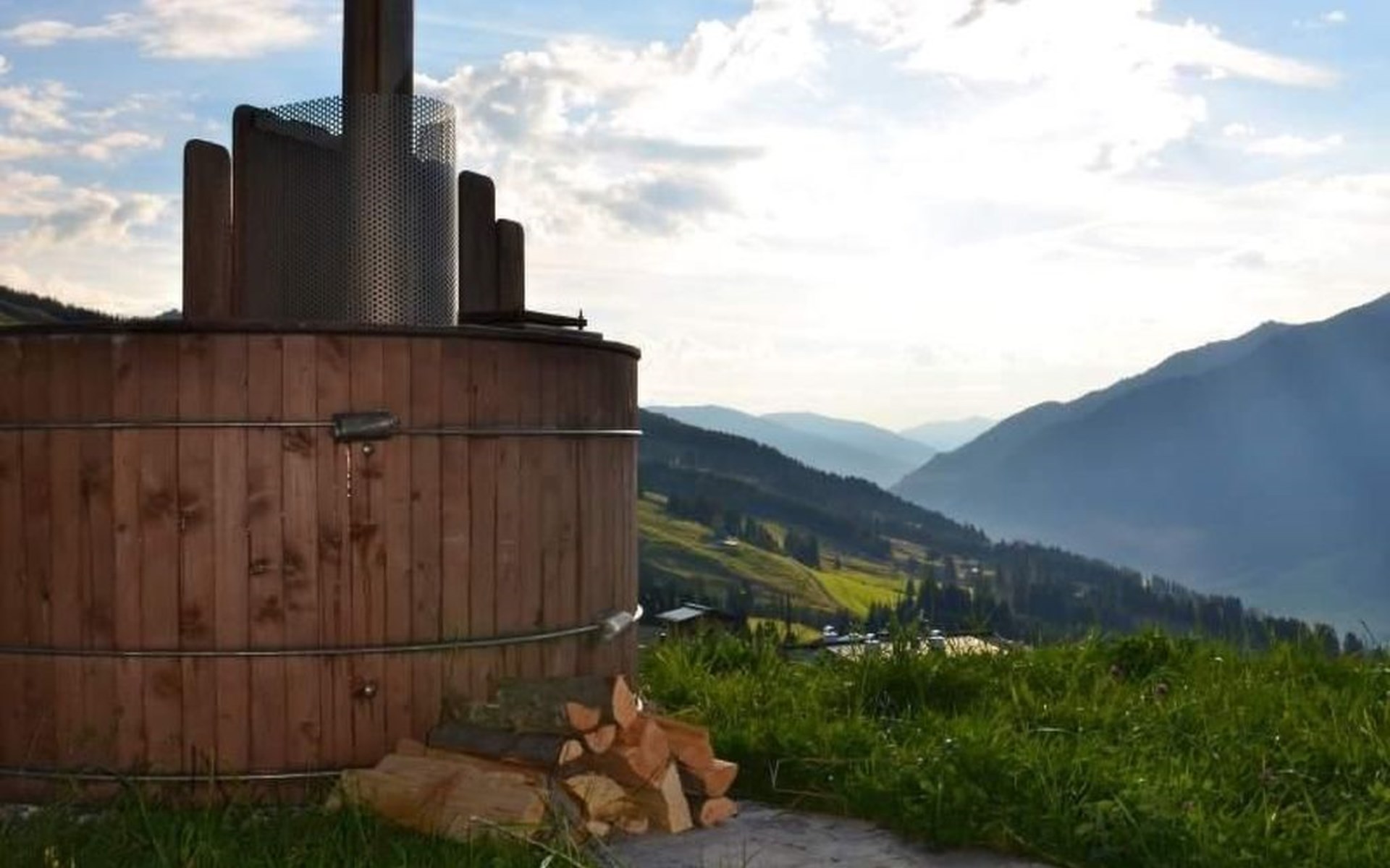 Zum Chalet gehört eine eigene Sonnenterrasse mit Liegestühlen und Panorama - HotPot (beheizbare 1800Liter Holzwanne) – Holz inkludiert. Ein ausgebauter Almweg (Zufahrt im Winter mit Allrad, wintertauglicher Ausrüstung und Taxi möglich!) führt zur Hütte. Alm-Carport für Ihr Auto und eine Hubschrauberlandemöglichkeit befinden sich direkt an der Hütte.