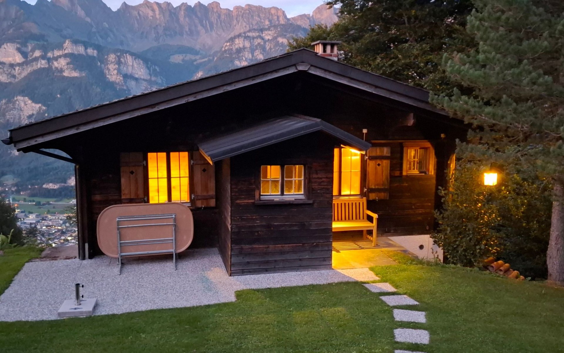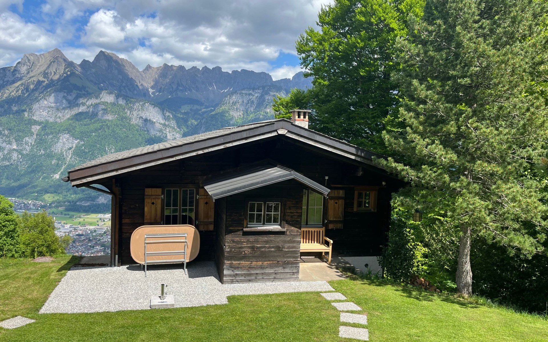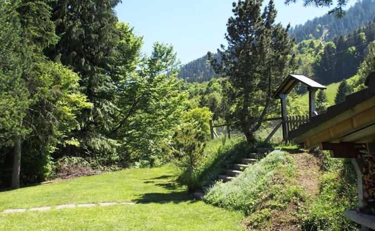 Im Außenbereich bietet sich Ihnen eine charmante Liegewiese direkt oberhalb des Hauses an, inklusive eines Cheminées für gemütliche Abendstunden unter freiem Himmel. Der zugängliche Außenbereich lädt ein, die atemberaubende Landschaft und Ruhe direkt vor der Haustür zu genießen.