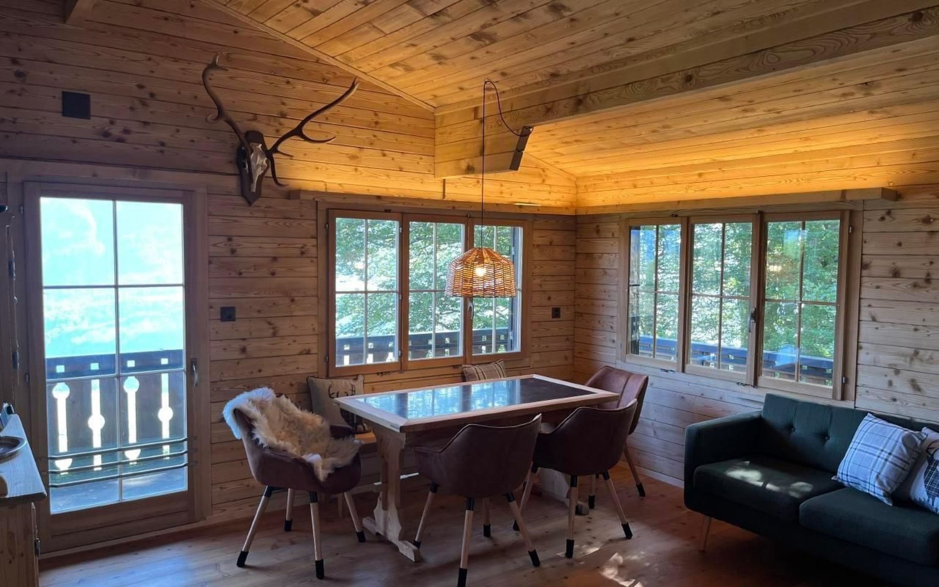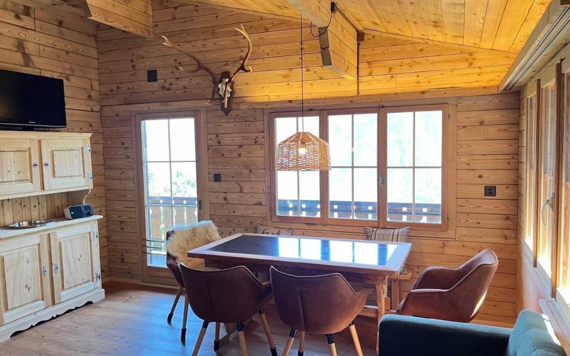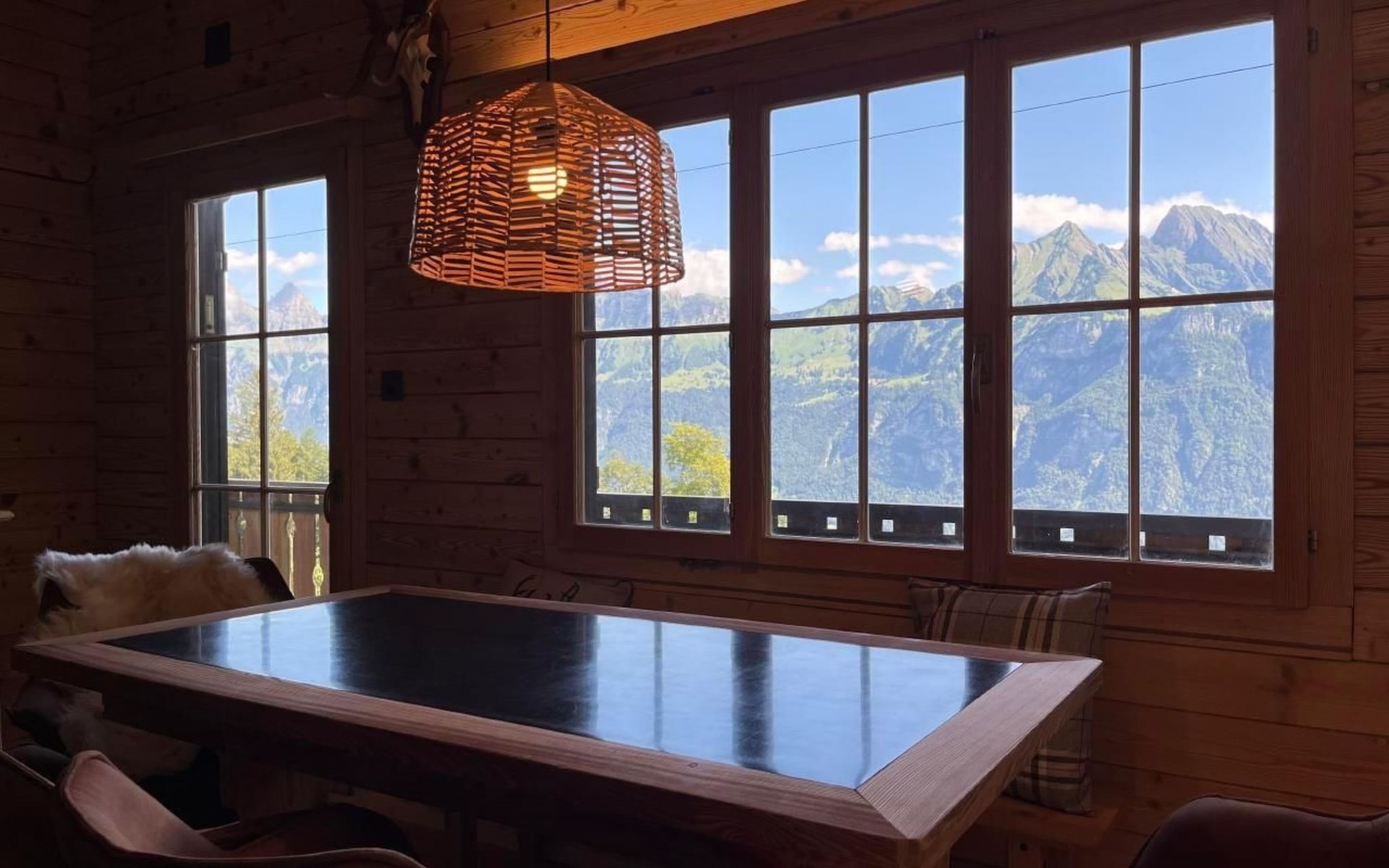 Im Außenbereich bietet sich Ihnen eine charmante Liegewiese direkt oberhalb des Hauses an, inklusive eines Cheminées für gemütliche Abendstunden unter freiem Himmel. Der zugängliche Außenbereich lädt ein, die atemberaubende Landschaft und Ruhe direkt vor der Haustür zu genießen.