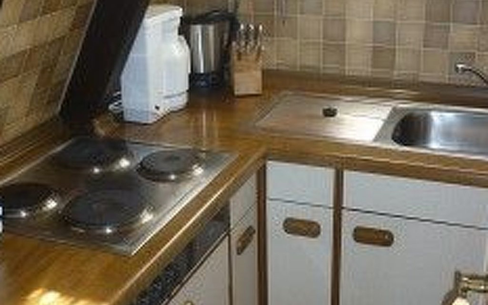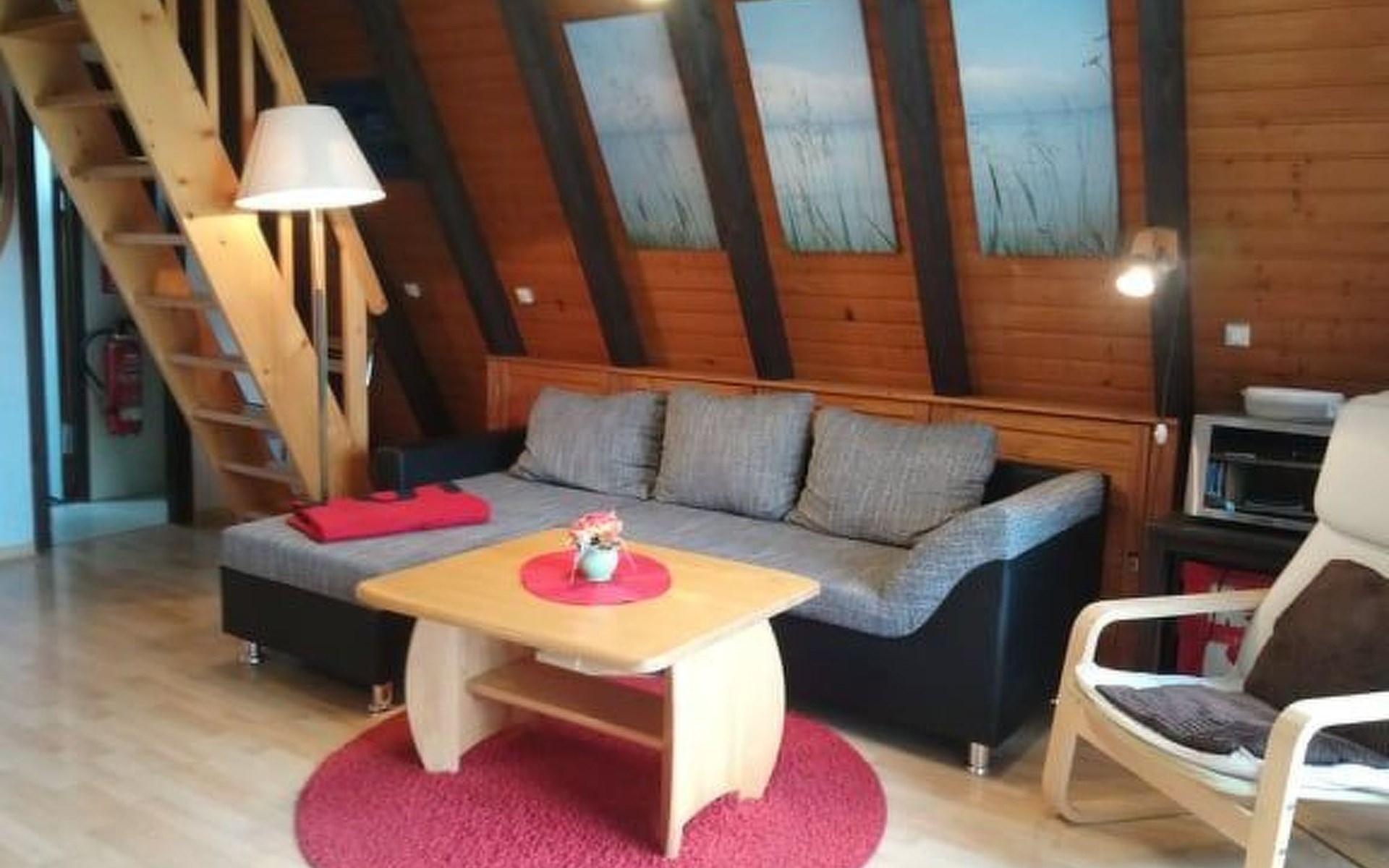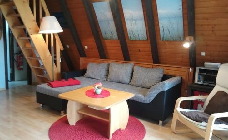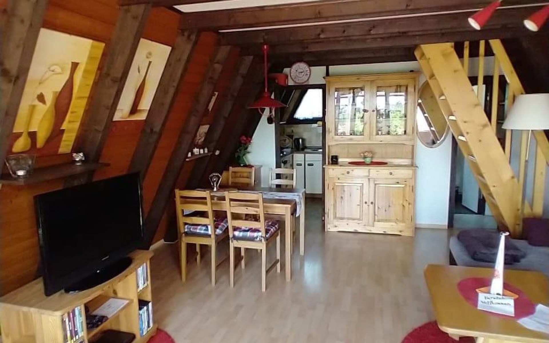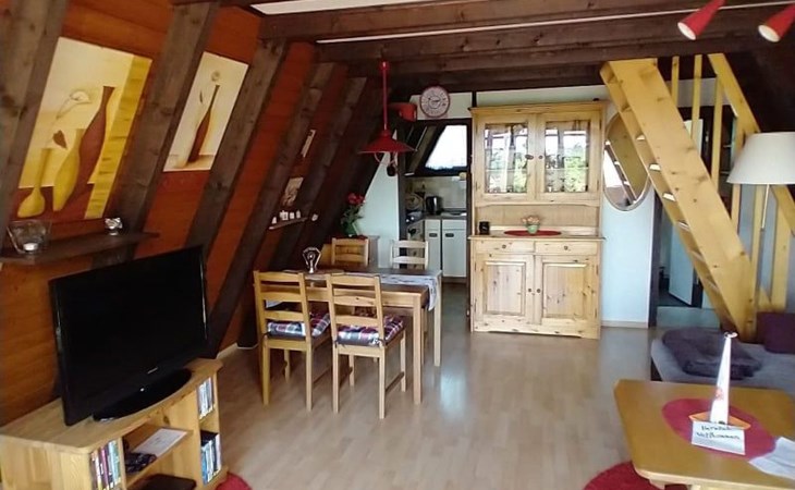 Im Erdgeschoss befindet sich der große Wohnraum mit gut ausgestatteter Einbauküche (Kochfeld, Kühlschrank mit Gefrierfach, Kaffeemaschine, Mikrowelle mit Grillfunktion, Wasserkocher, Toaster usw.), Essbereich für 4 Personen, gemütliche Couchecke, Sat-TV/Radio sowie das Duschbad und eine kleine Garderobe. Ein KInderhochstuhl wird auf Wunsch bereit gestellt.