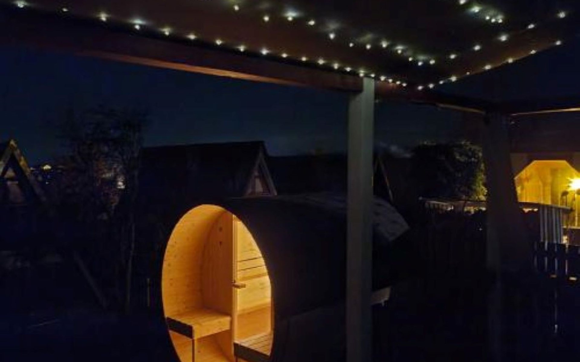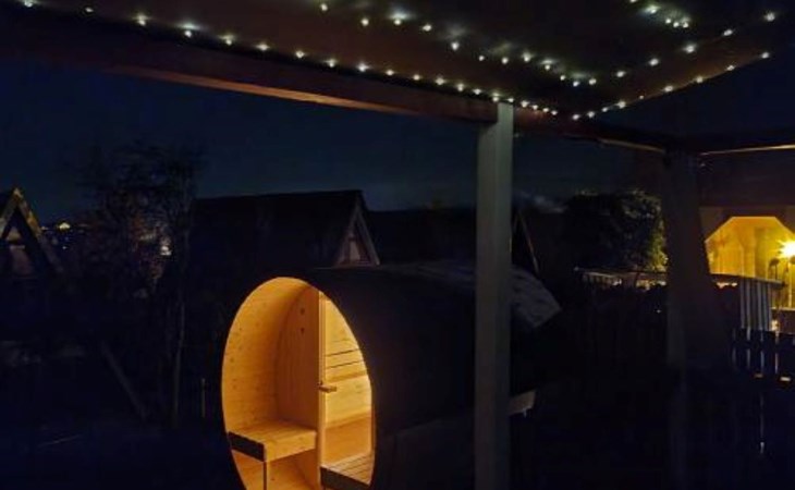 Im Oktober d. J. haben wir eine Fass-Sauna zur alleinigen Benutzung für unsere Gäste direkt am Haus aufgestellt.