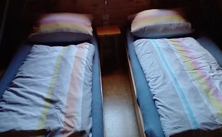 Im Obergeschoss befindet sich ein Schlafzimmer mit Doppelbett (180/200 cm) und ein Schlafzimmer mit zwei Einzellbetten sowie ein Kleiderschrank im Flur sowie eine kleine Bibliothek. Ein Kinderbettchen kann zusätzlich im größeren Schlafzimmer aufgestellt werden.