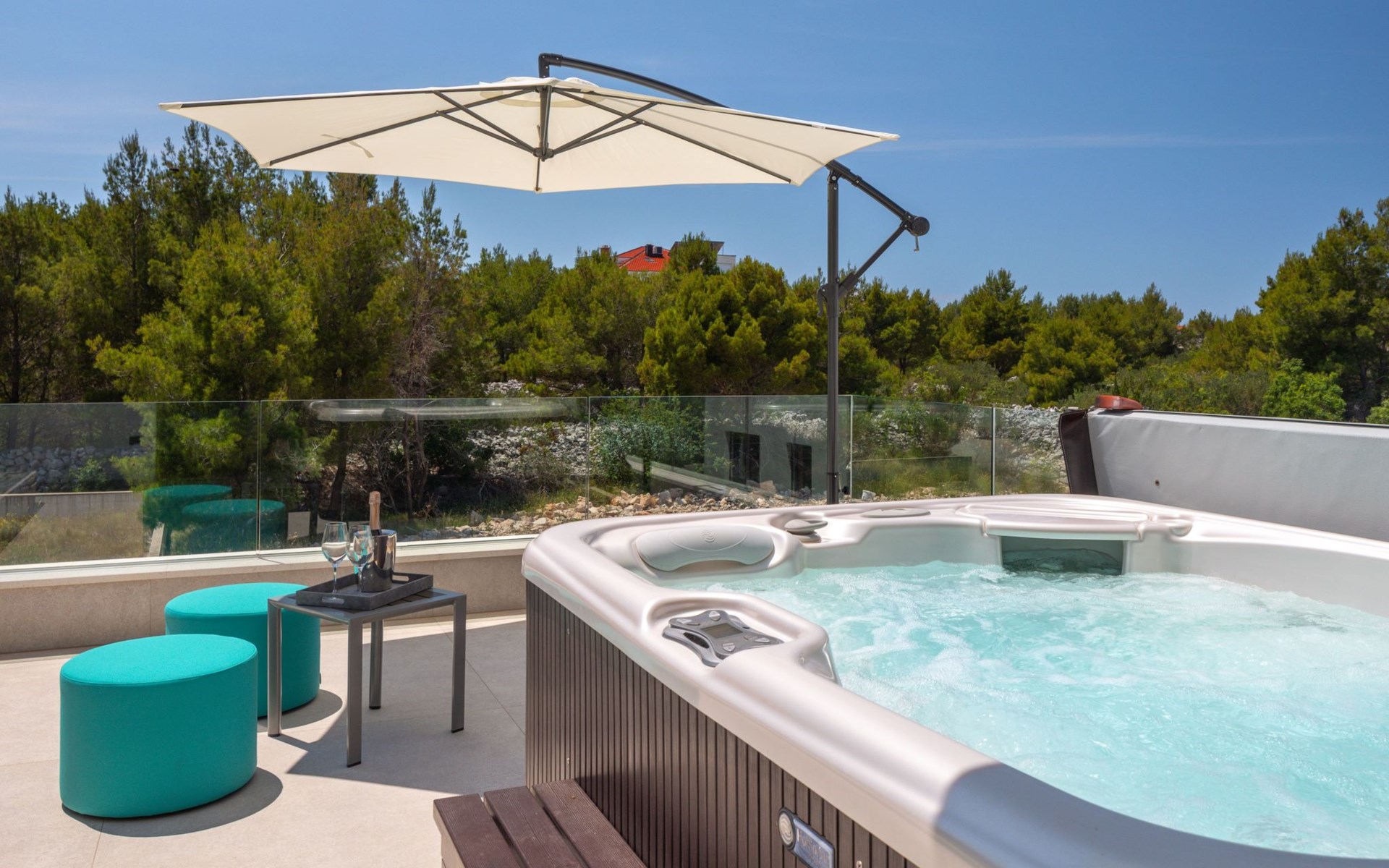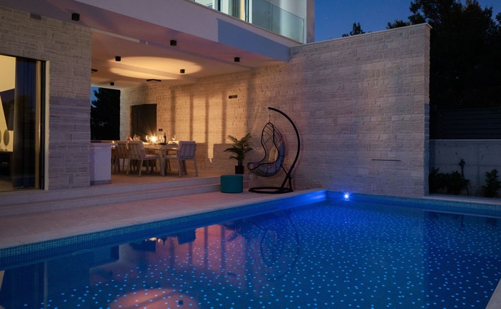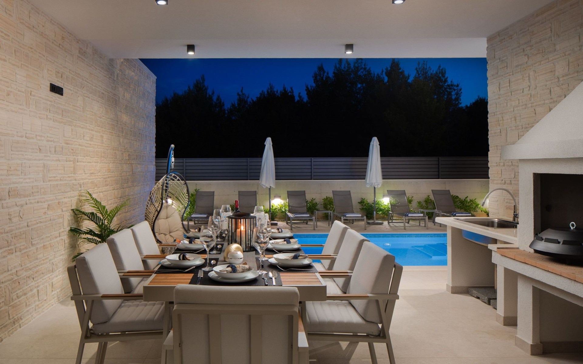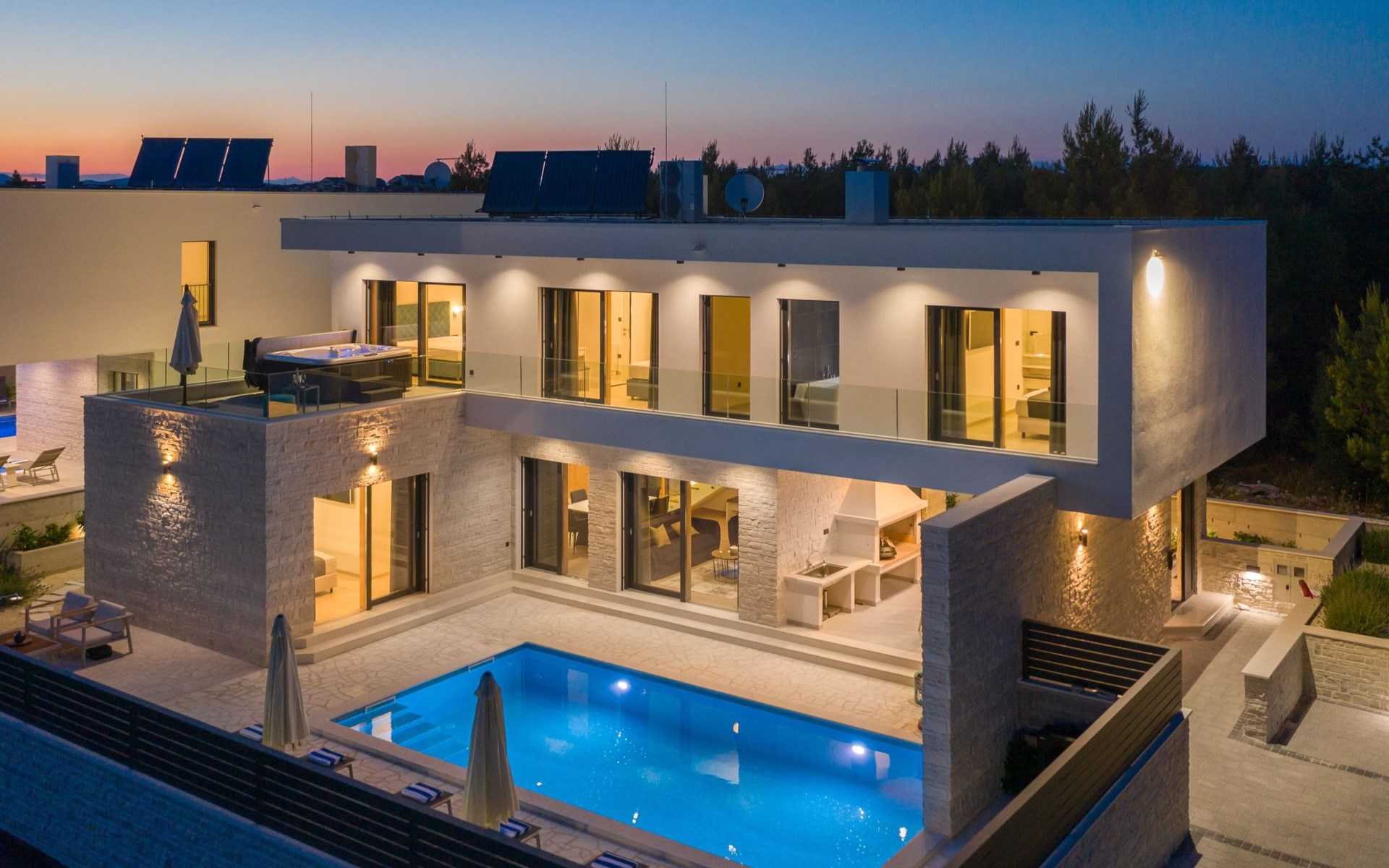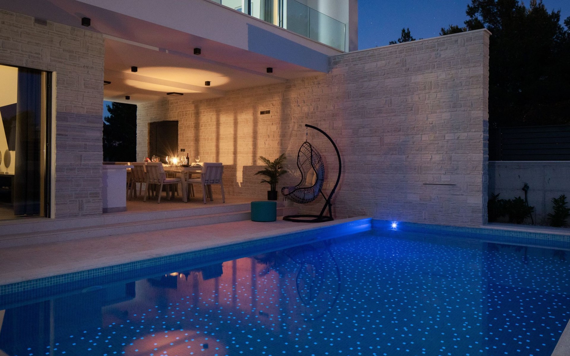 Treten Sie nach draußen und entdecken Sie Ihr privates Paradies mit einem 40 m2 großen, beheizten Swimmingpool, der mit stimmungsvollen Lichtern am Boden für ein bezauberndes Bad in der Nacht ausgestattet ist. Der wunderschön gepflegte Garten bietet eine friedliche Umgebung zum Entspannen im Freien, während die mit Sonnenliegen und einem Grill ausgestattete Terrasse zum Essen im Freien oder einfach zum Sonnenbaden in der dalmatinischen Sonne einlädt. Für die ultimative Entspannung können Sie sich im einladenden Whirlpool entspannen oder Ihre Sinne in der Sauna beruhigen.