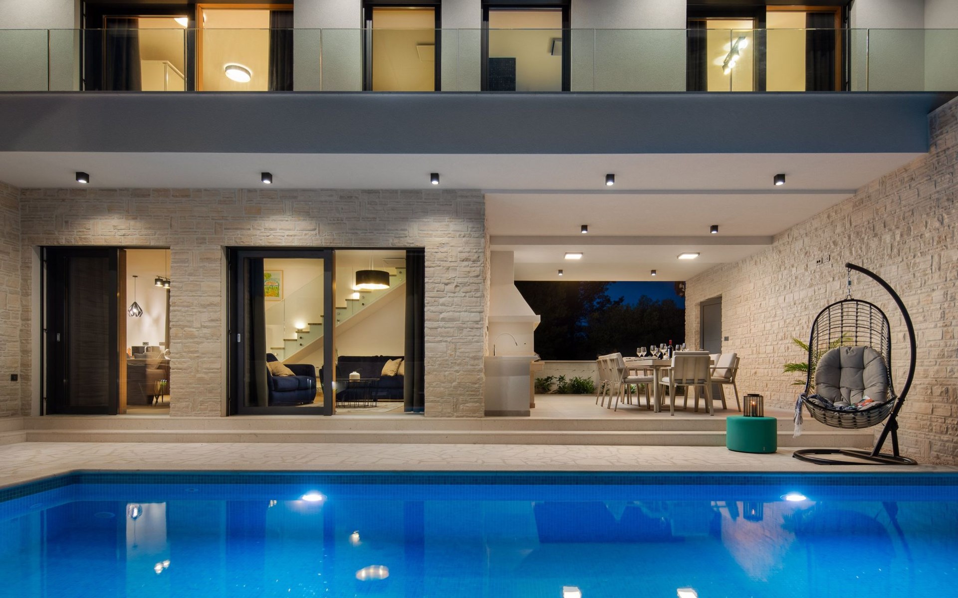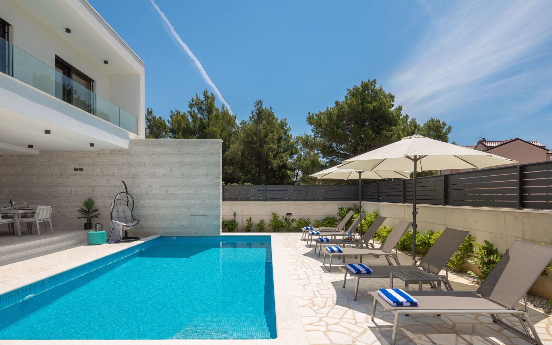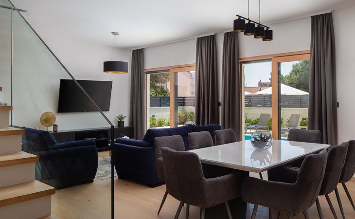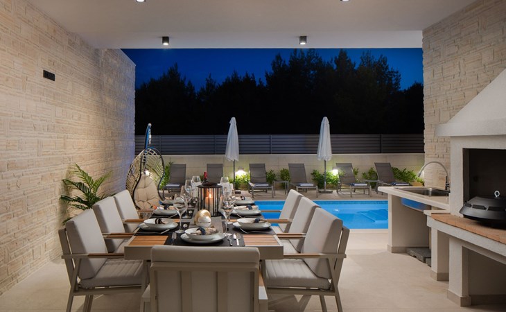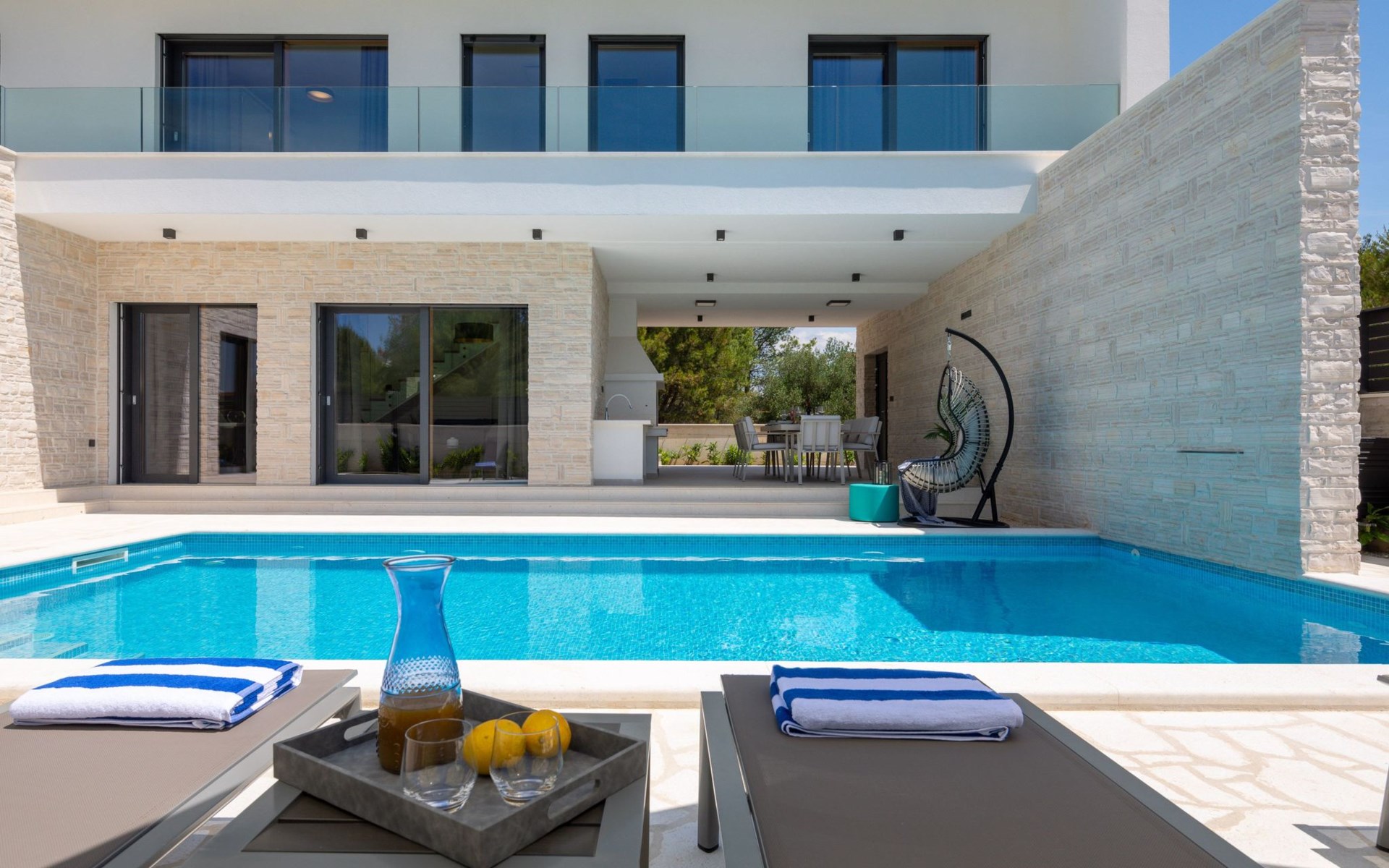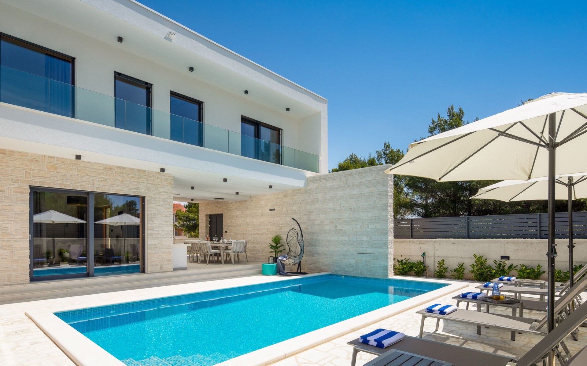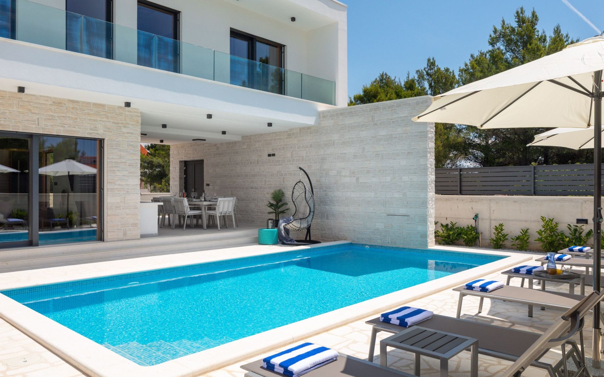 Treten Sie nach draußen und entdecken Sie Ihr privates Paradies mit einem 40 m2 großen, beheizten Swimmingpool, der mit stimmungsvollen Lichtern am Boden für ein bezauberndes Bad in der Nacht ausgestattet ist. Der wunderschön gepflegte Garten bietet eine friedliche Umgebung zum Entspannen im Freien, während die mit Sonnenliegen und einem Grill ausgestattete Terrasse zum Essen im Freien oder einfach zum Sonnenbaden in der dalmatinischen Sonne einlädt. Für die ultimative Entspannung können Sie sich im einladenden Whirlpool entspannen oder Ihre Sinne in der Sauna beruhigen.