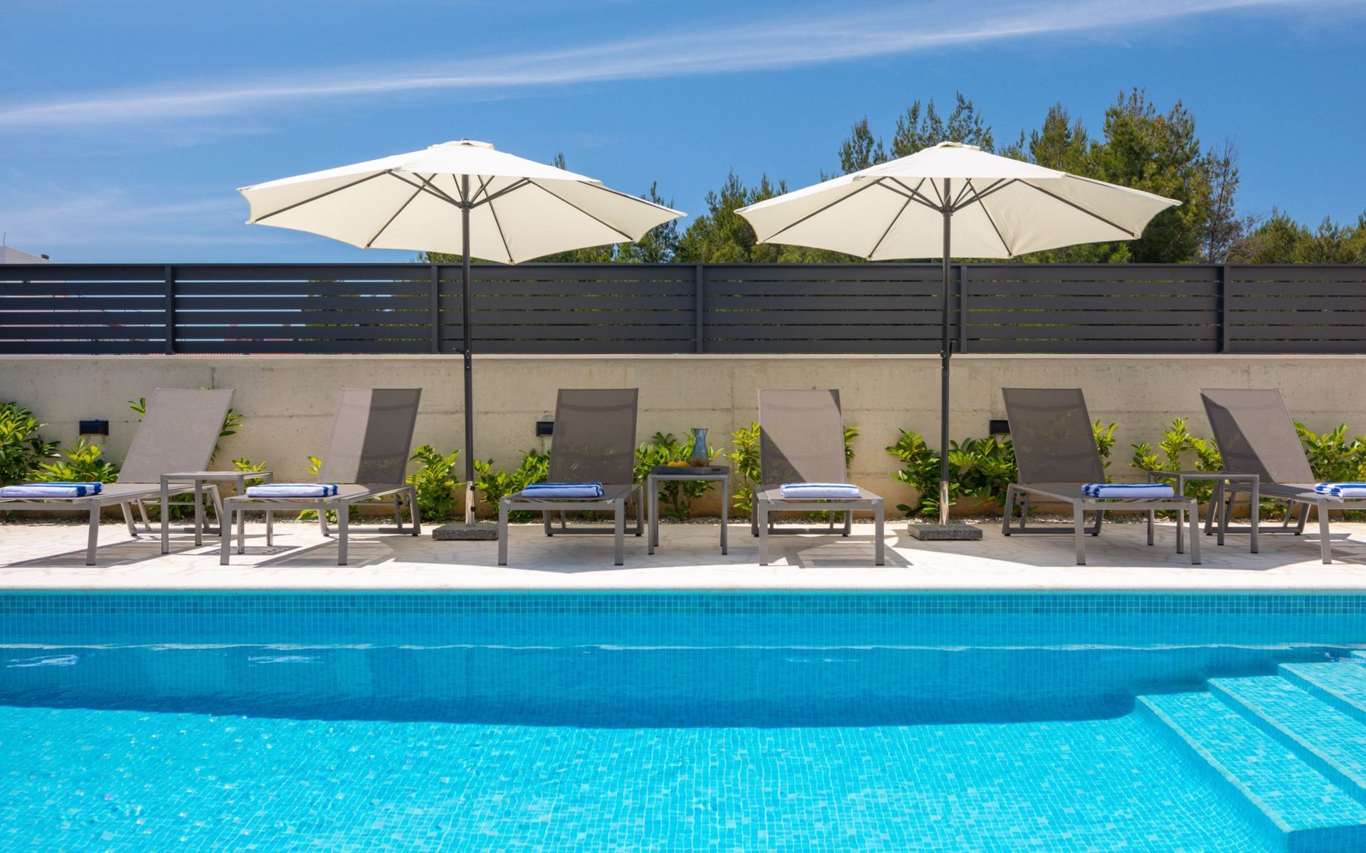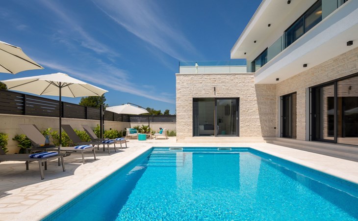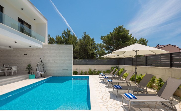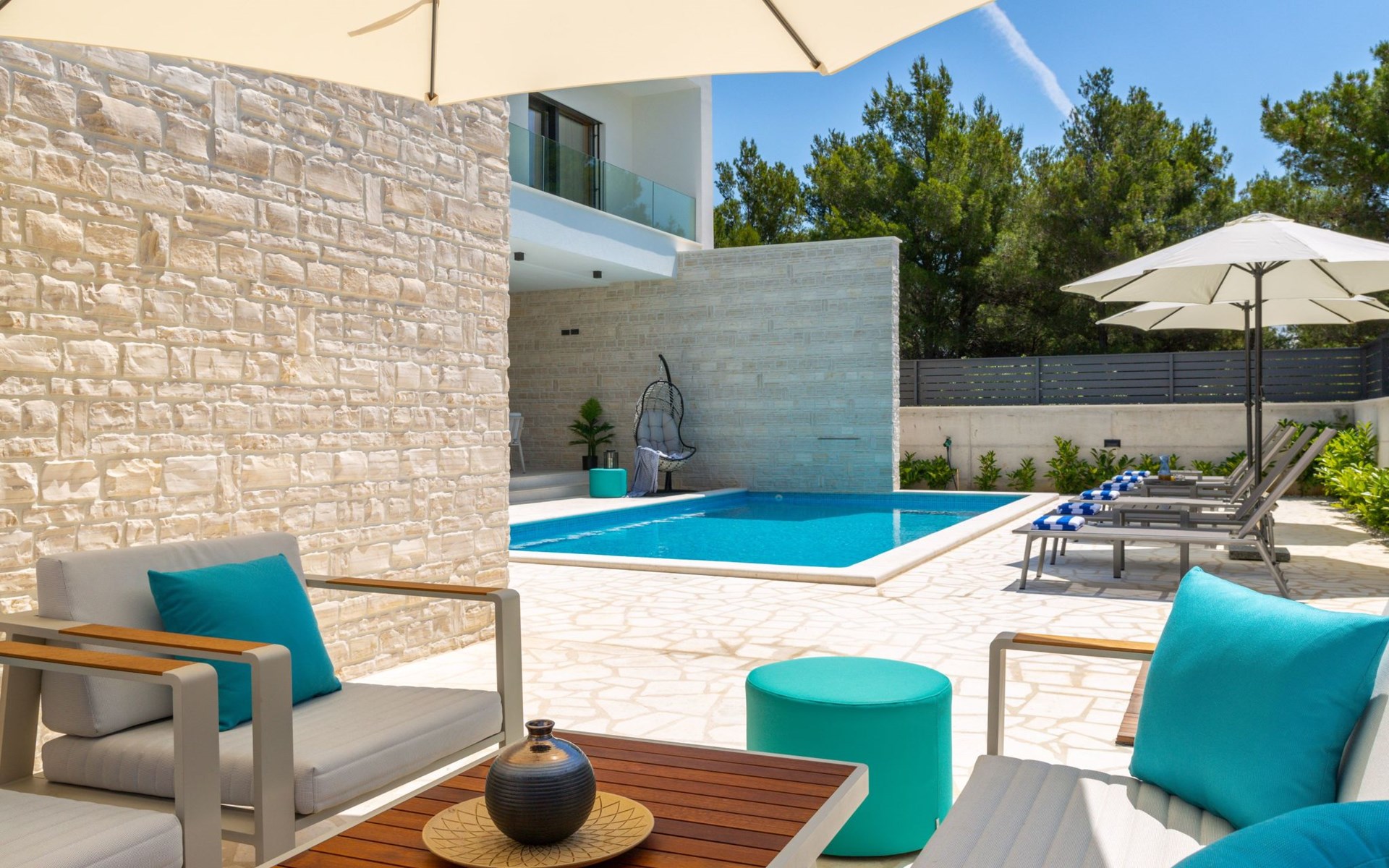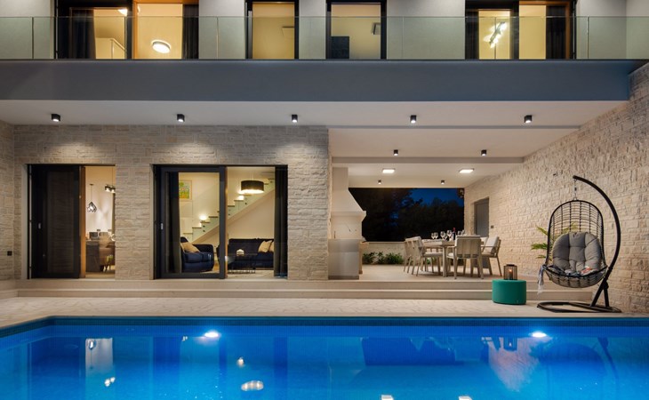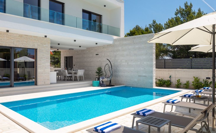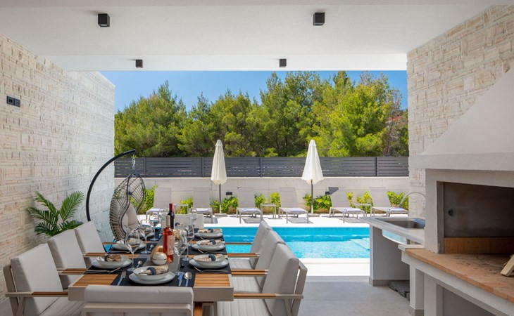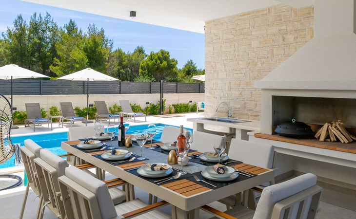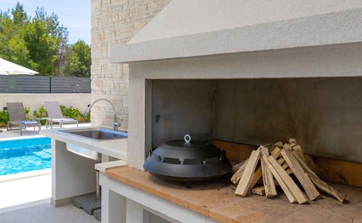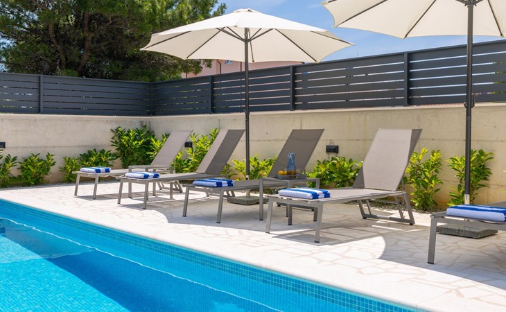 Treten Sie nach draußen und entdecken Sie Ihr privates Paradies mit einem 40 m2 großen, beheizten Swimmingpool, der mit stimmungsvollen Lichtern am Boden für ein bezauberndes Bad in der Nacht ausgestattet ist. Der wunderschön gepflegte Garten bietet eine friedliche Umgebung zum Entspannen im Freien, während die mit Sonnenliegen und einem Grill ausgestattete Terrasse zum Essen im Freien oder einfach zum Sonnenbaden in der dalmatinischen Sonne einlädt. Für die ultimative Entspannung können Sie sich im einladenden Whirlpool entspannen oder Ihre Sinne in der Sauna beruhigen.