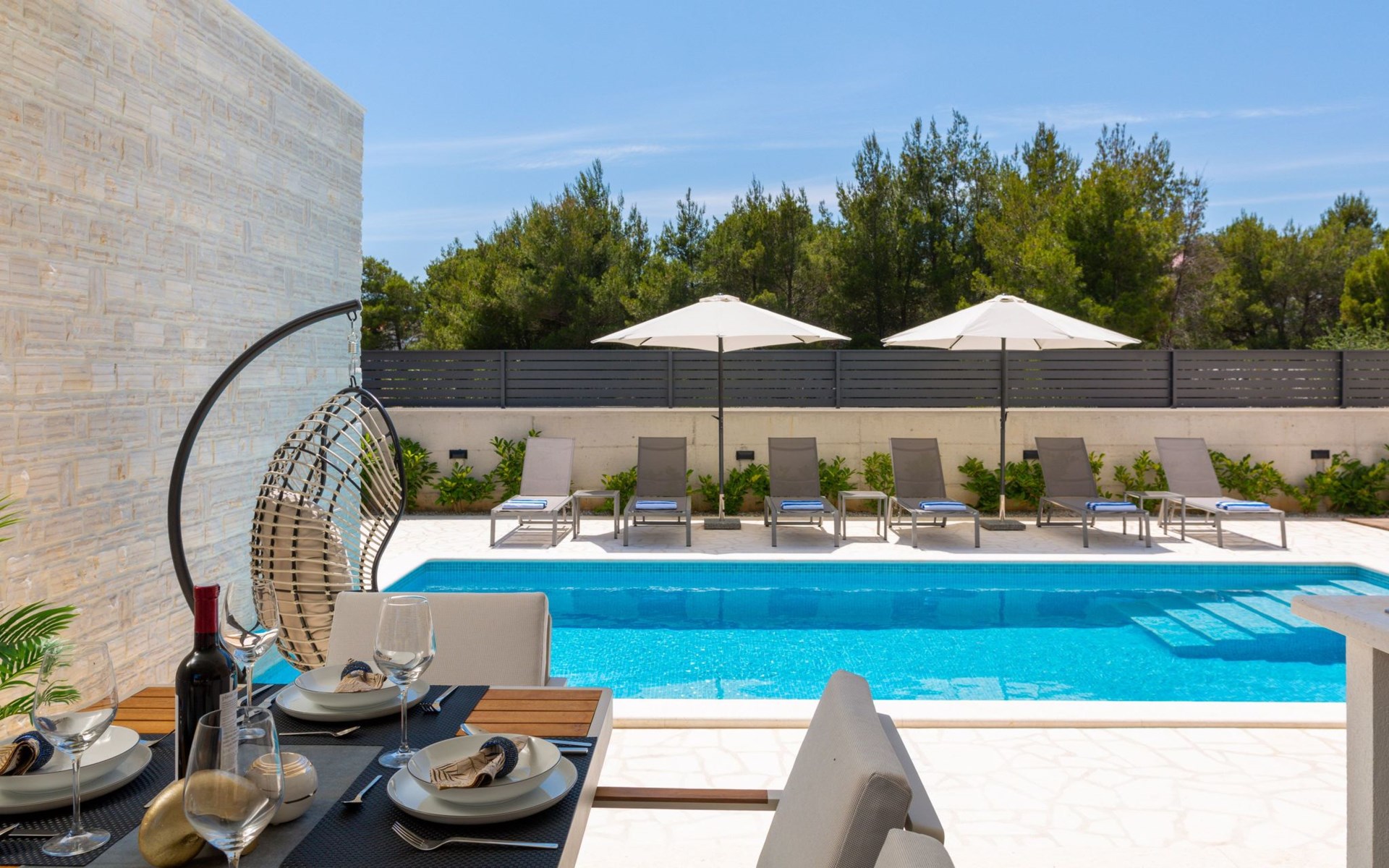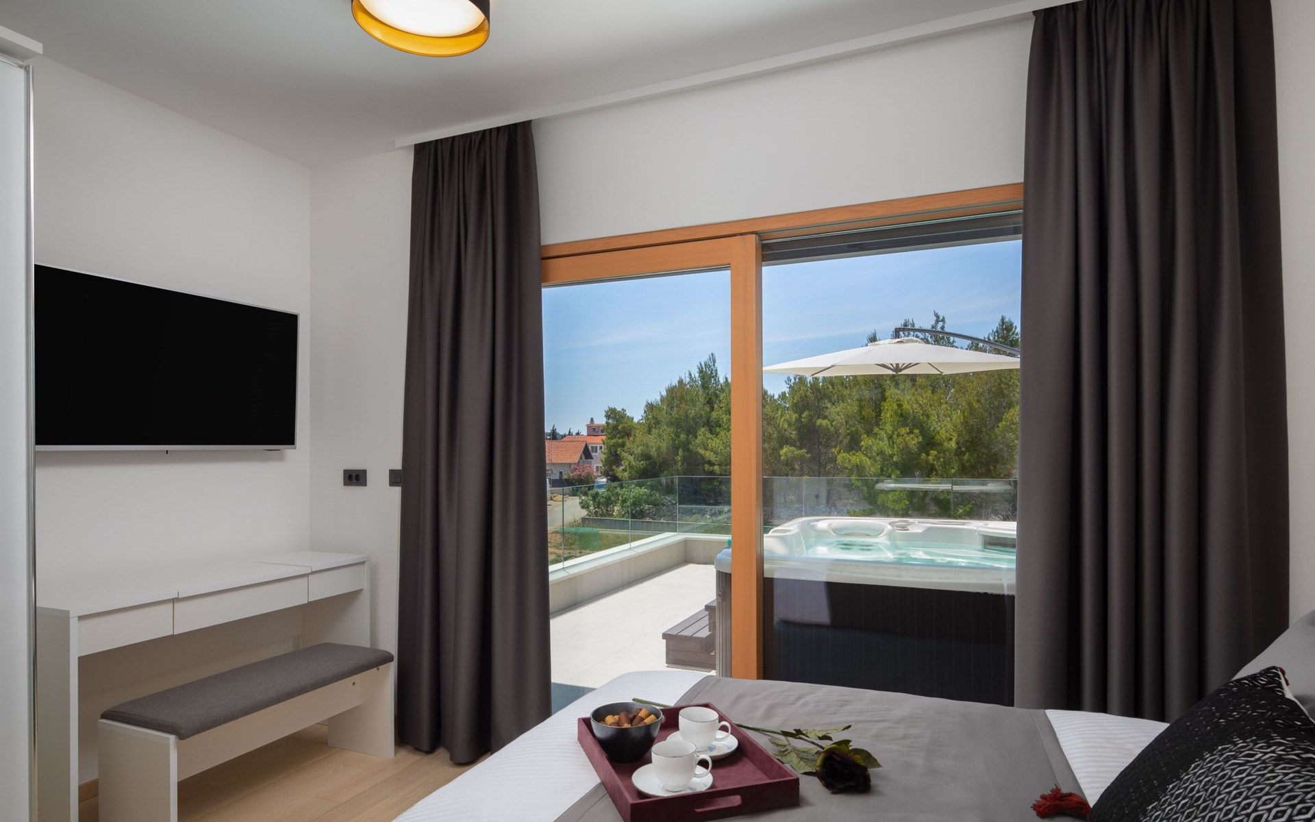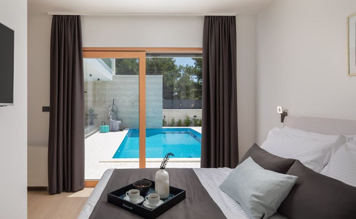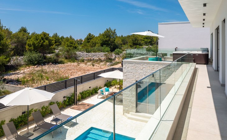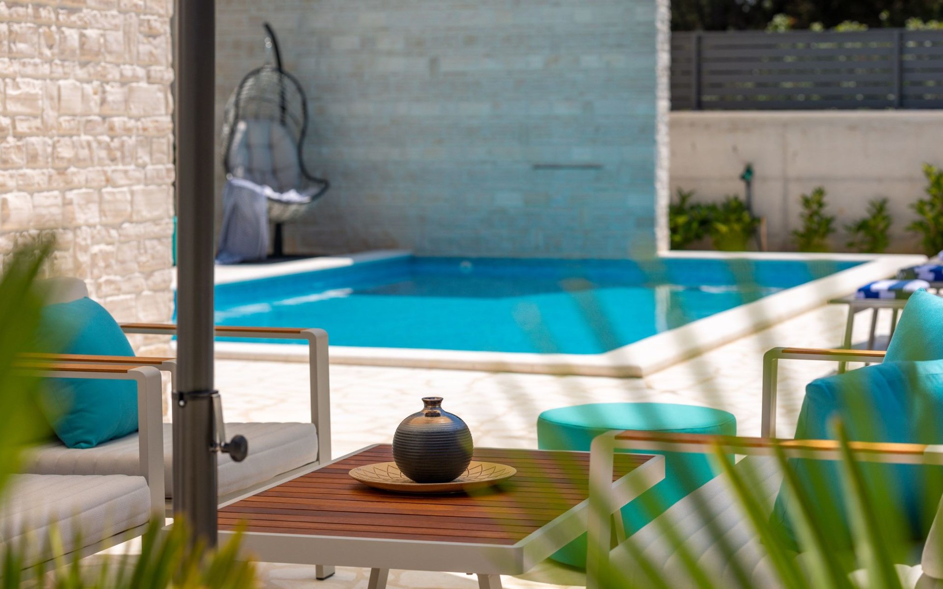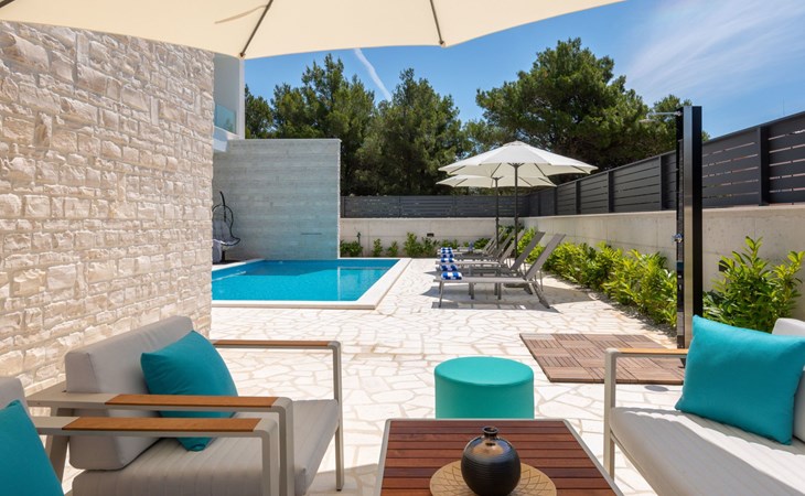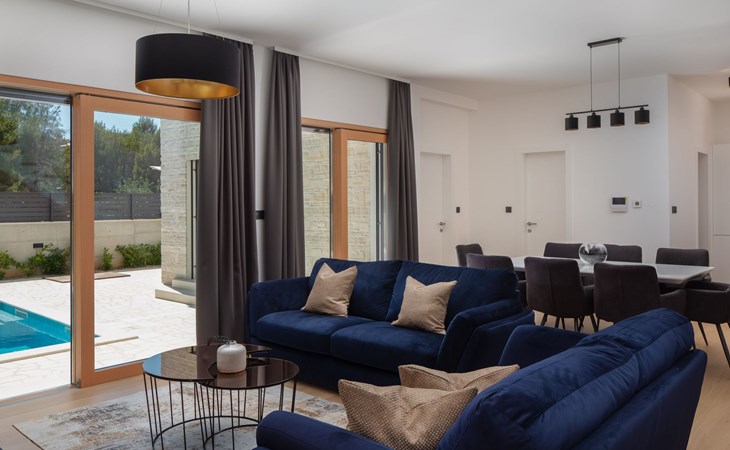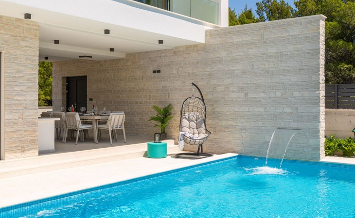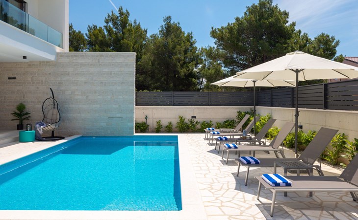 Treten Sie nach draußen und entdecken Sie Ihr privates Paradies mit einem 40 m2 großen, beheizten Swimmingpool, der mit stimmungsvollen Lichtern am Boden für ein bezauberndes Bad in der Nacht ausgestattet ist. Der wunderschön gepflegte Garten bietet eine friedliche Umgebung zum Entspannen im Freien, während die mit Sonnenliegen und einem Grill ausgestattete Terrasse zum Essen im Freien oder einfach zum Sonnenbaden in der dalmatinischen Sonne einlädt. Für die ultimative Entspannung können Sie sich im einladenden Whirlpool entspannen oder Ihre Sinne in der Sauna beruhigen.