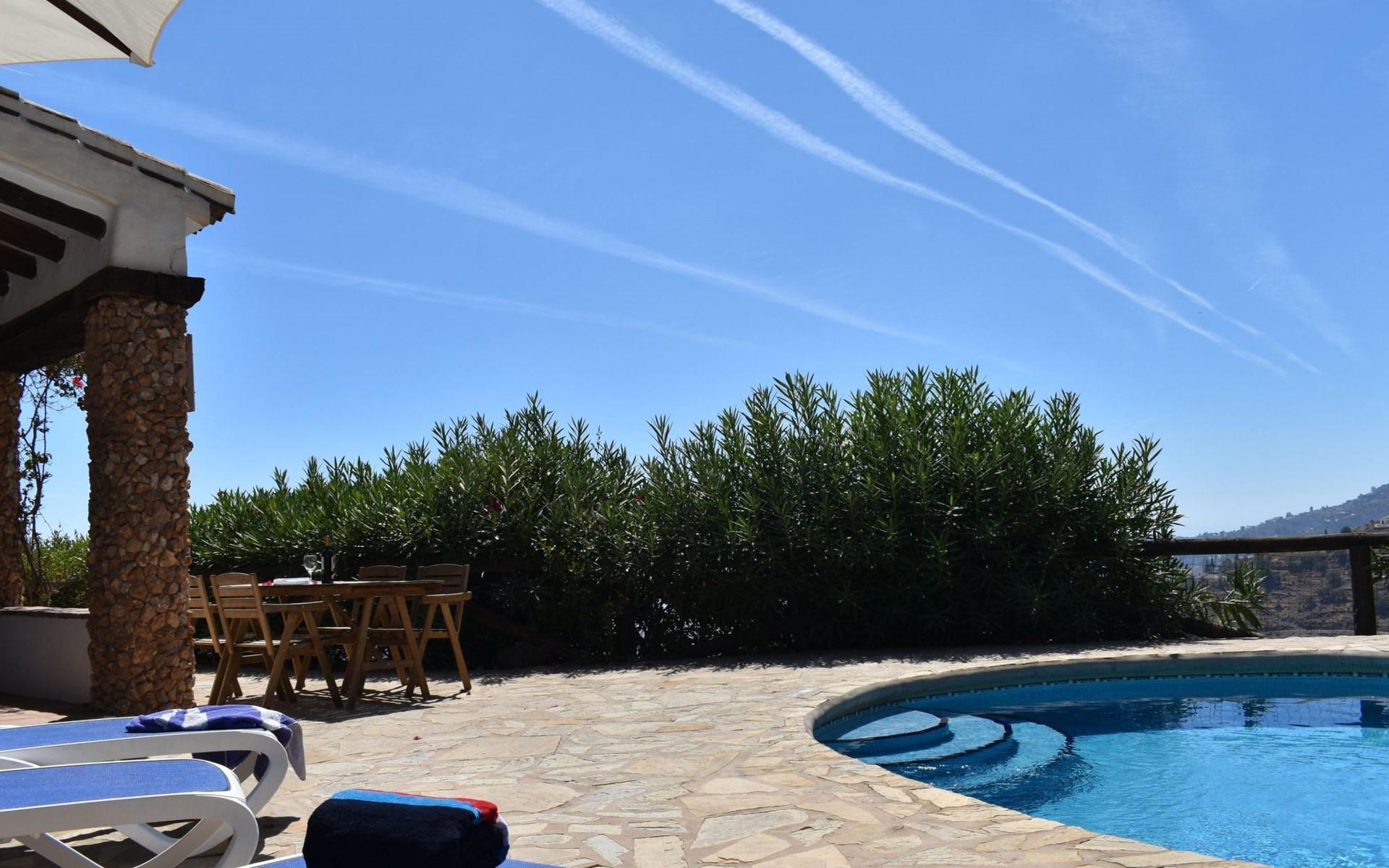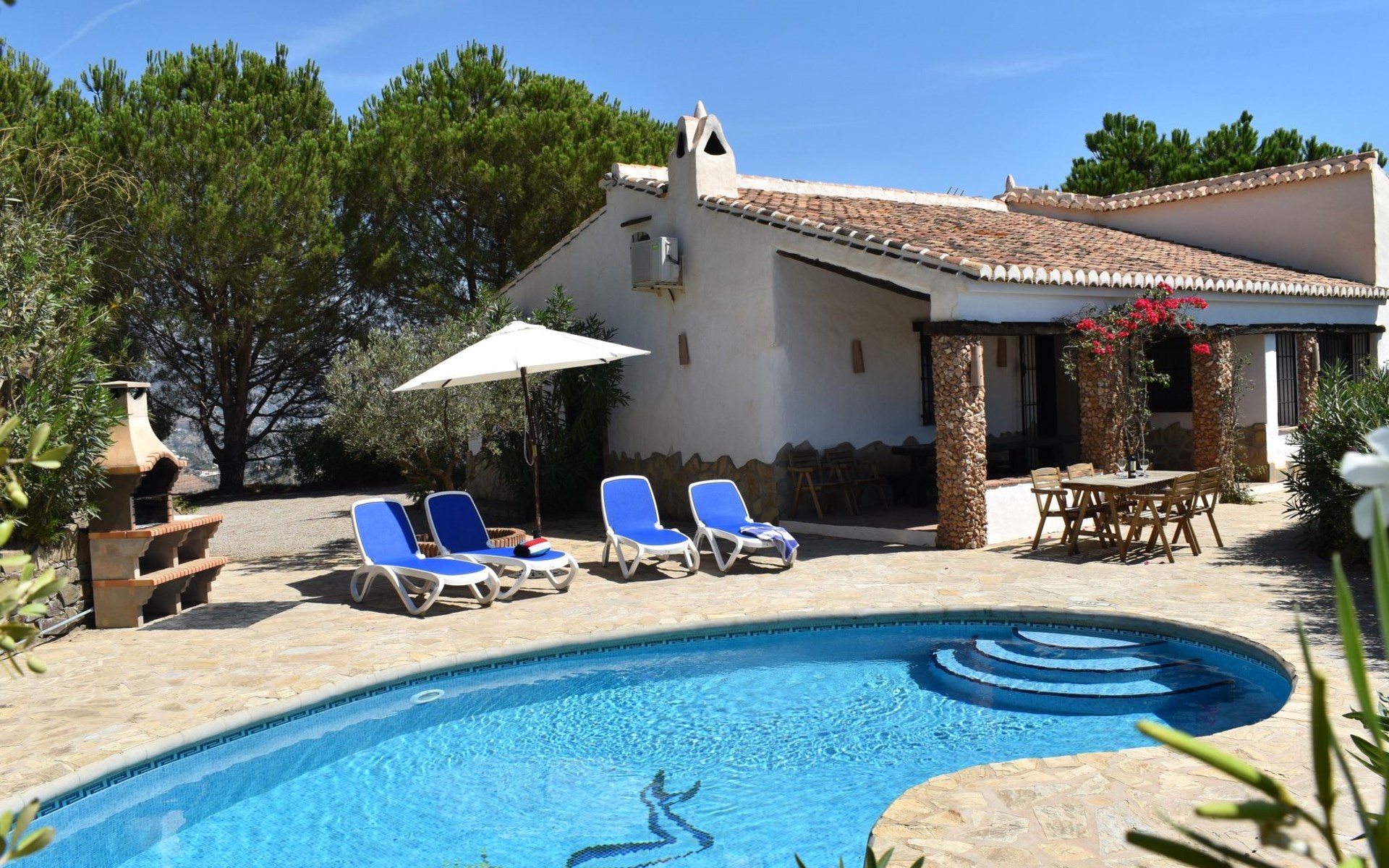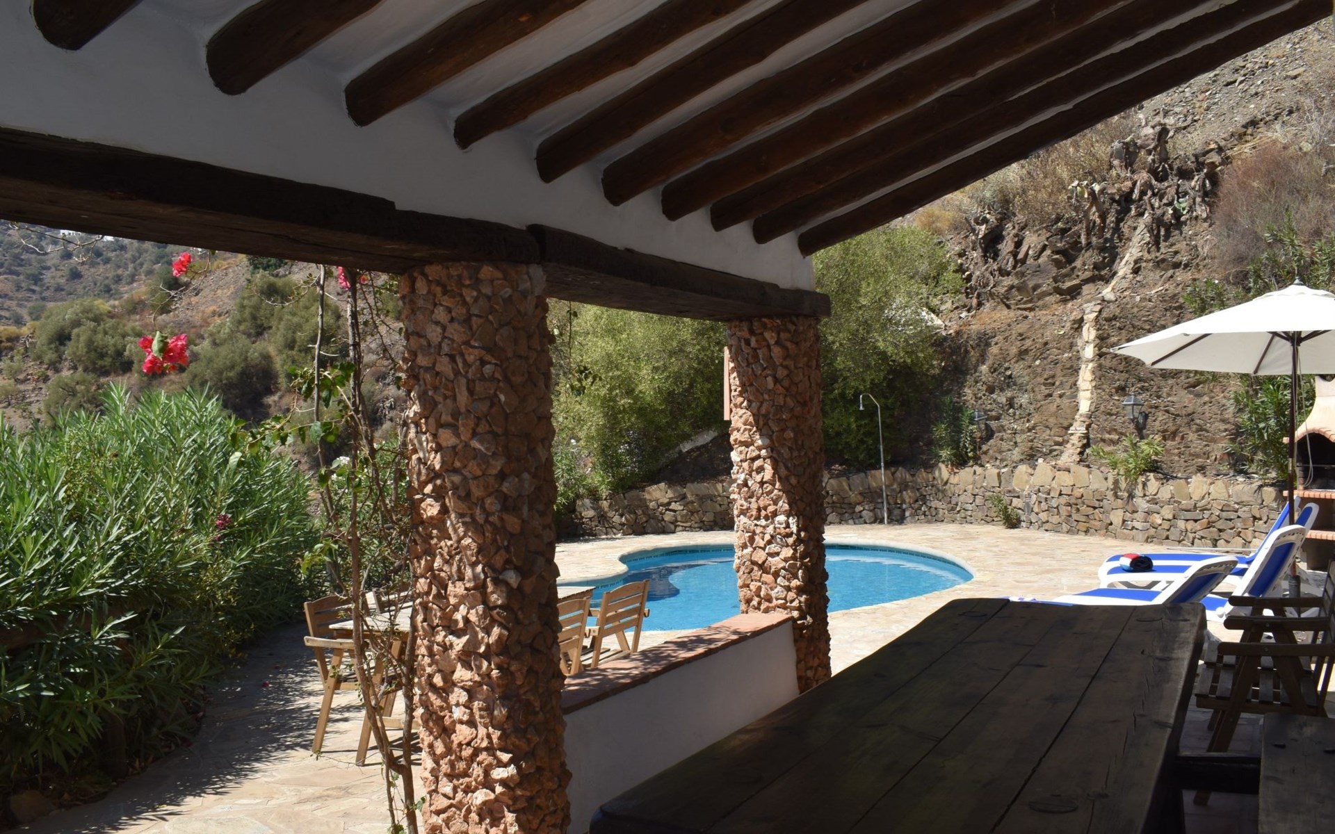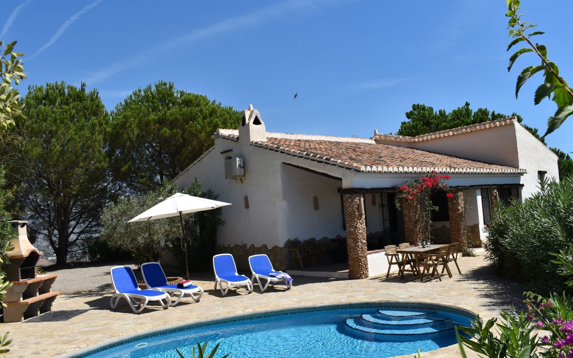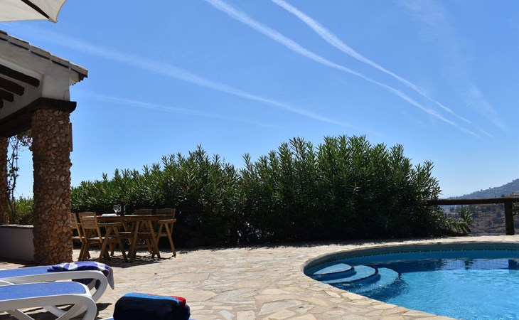 Im Aussenbereich der grosse private Pool mit Sonnenterasse und Aussengrill. Villa ideal zum Entspannen und Ausruhen und um die Sonne und Stille am Pool oder auf der Terrasse zu geniessen.
