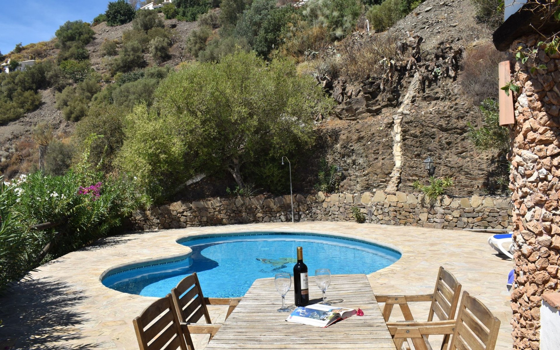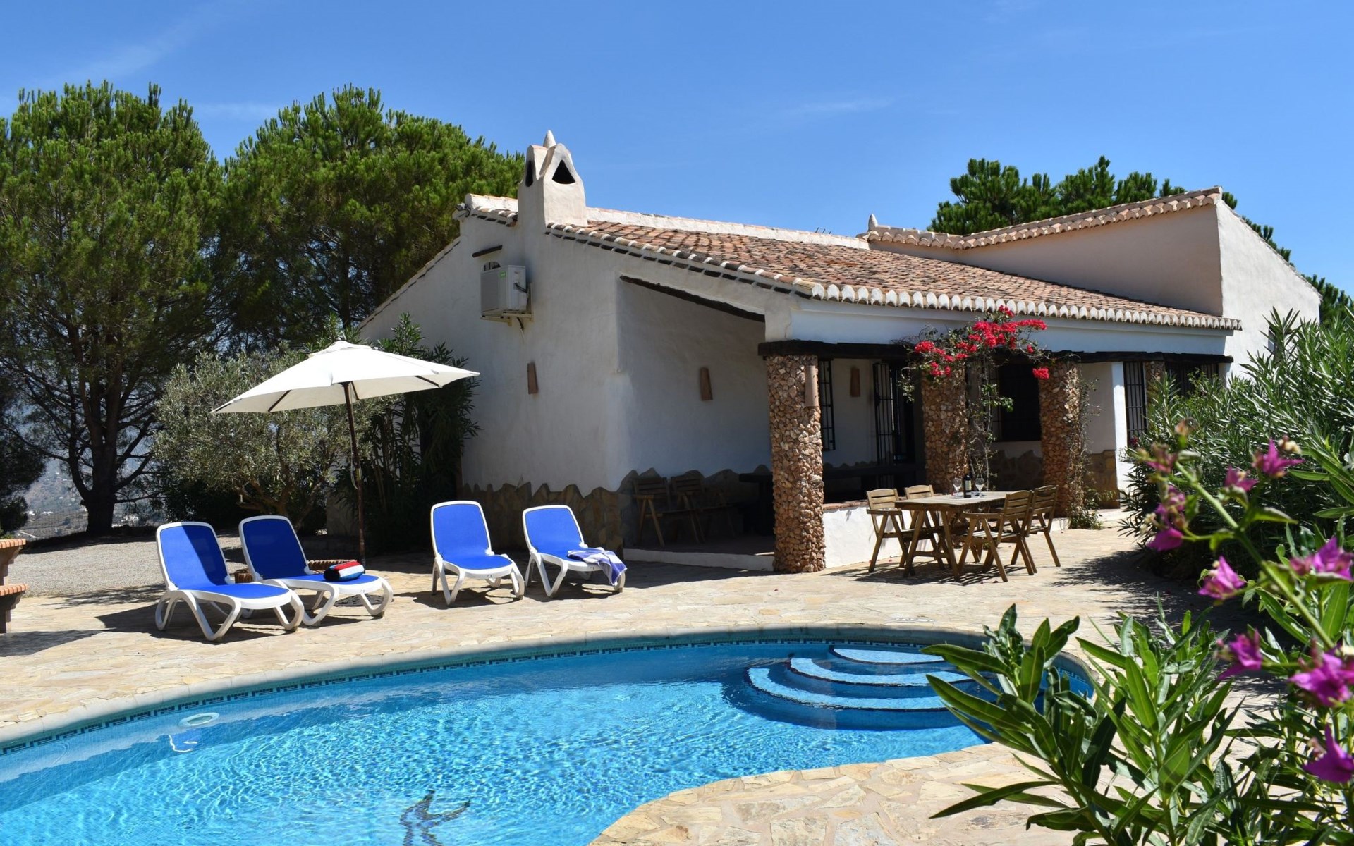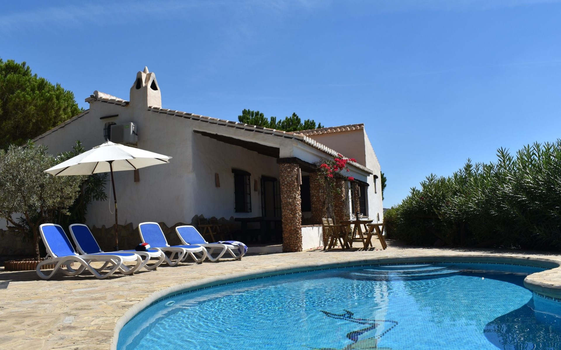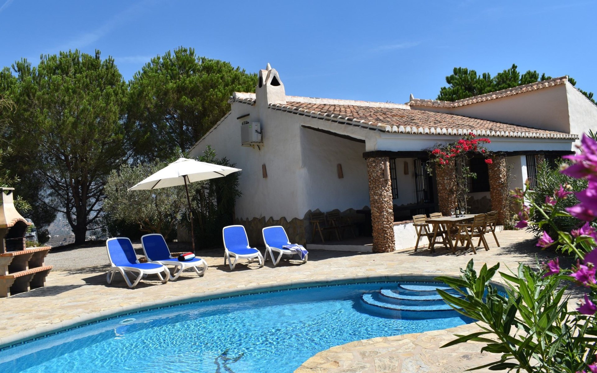 Im Aussenbereich der grosse private Pool mit Sonnenterasse und Aussengrill. Villa ideal zum Entspannen und Ausruhen und um die Sonne und Stille am Pool oder auf der Terrasse zu geniessen.