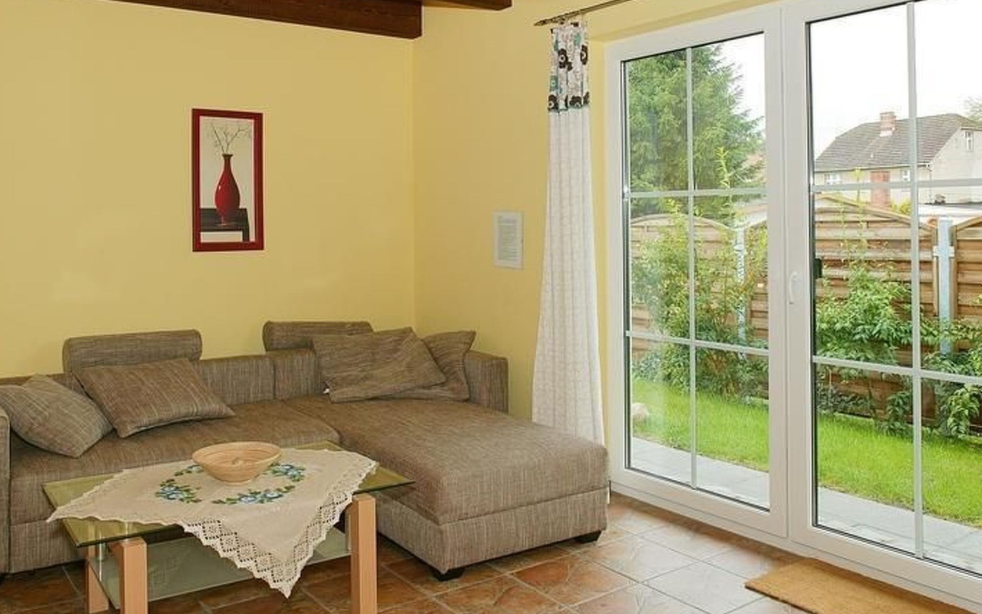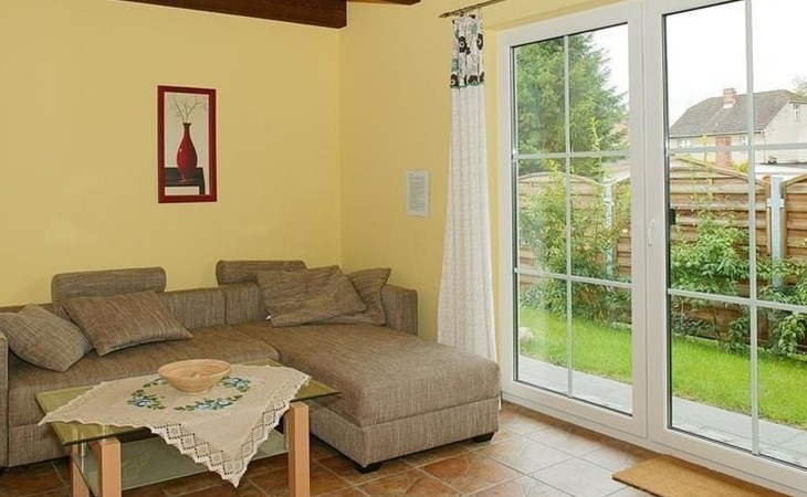 Das Erdgeschoss bietet Ihnen ein 35m² großes Wohnzimmer mit integrierter Küche und einem Kaminofen, ein Bad mit Dusche sowie einen Abstellraum. In der Küche stehen Ihnen, abgesehen von der Grundausstattung, ein Tiefkühlfach, ein Geschirrspüler, eine Mikrowelle, ein Toaster und ein Backofen zur Verfügung. Das Obergeschoss setzt sich aus zwei Schlafzimmern und einem Gäste WC zusammen. Eines der Schlafzimmer ist mit einem Ehebett (zwei Matratzen 90cm x 200cm) ausgestattet, der andere Schlafraum mit zwei Einzelbetten (90cm x 200cm). An allen Fenstern des Hauses sind Außenrolladen angebracht. Zum Wäsche waschen können Sie eine Waschmaschine und einen Trockner benutzen, diese befinden sich auf der anderen Strassenseite (gegen Gebühr).