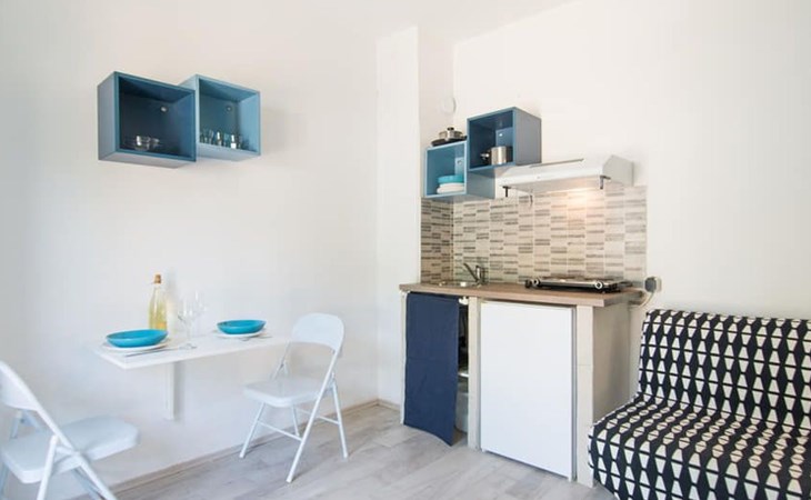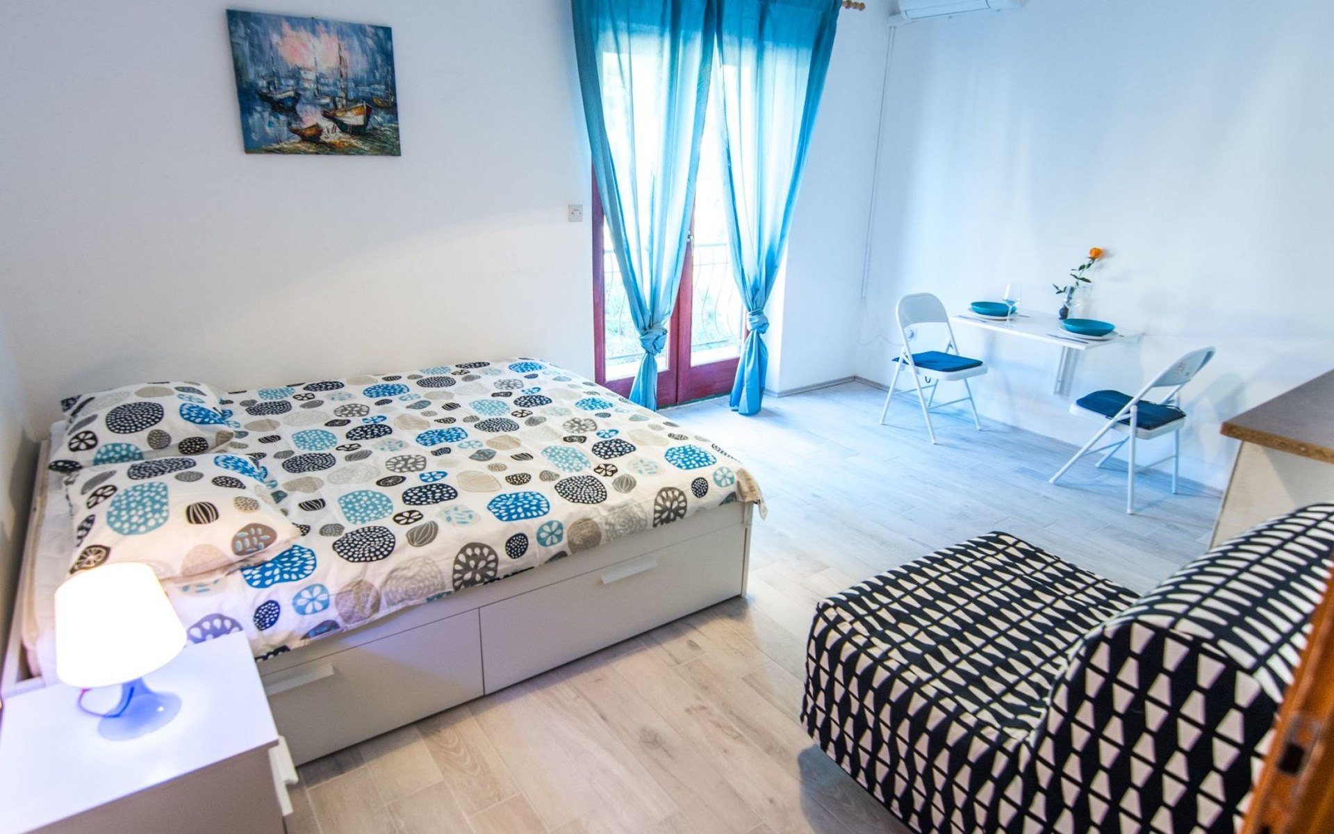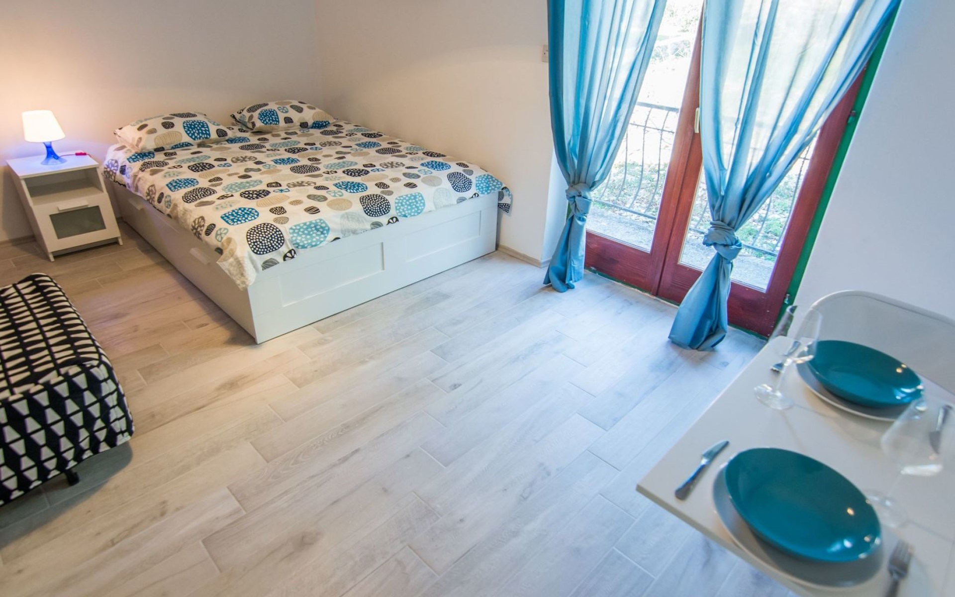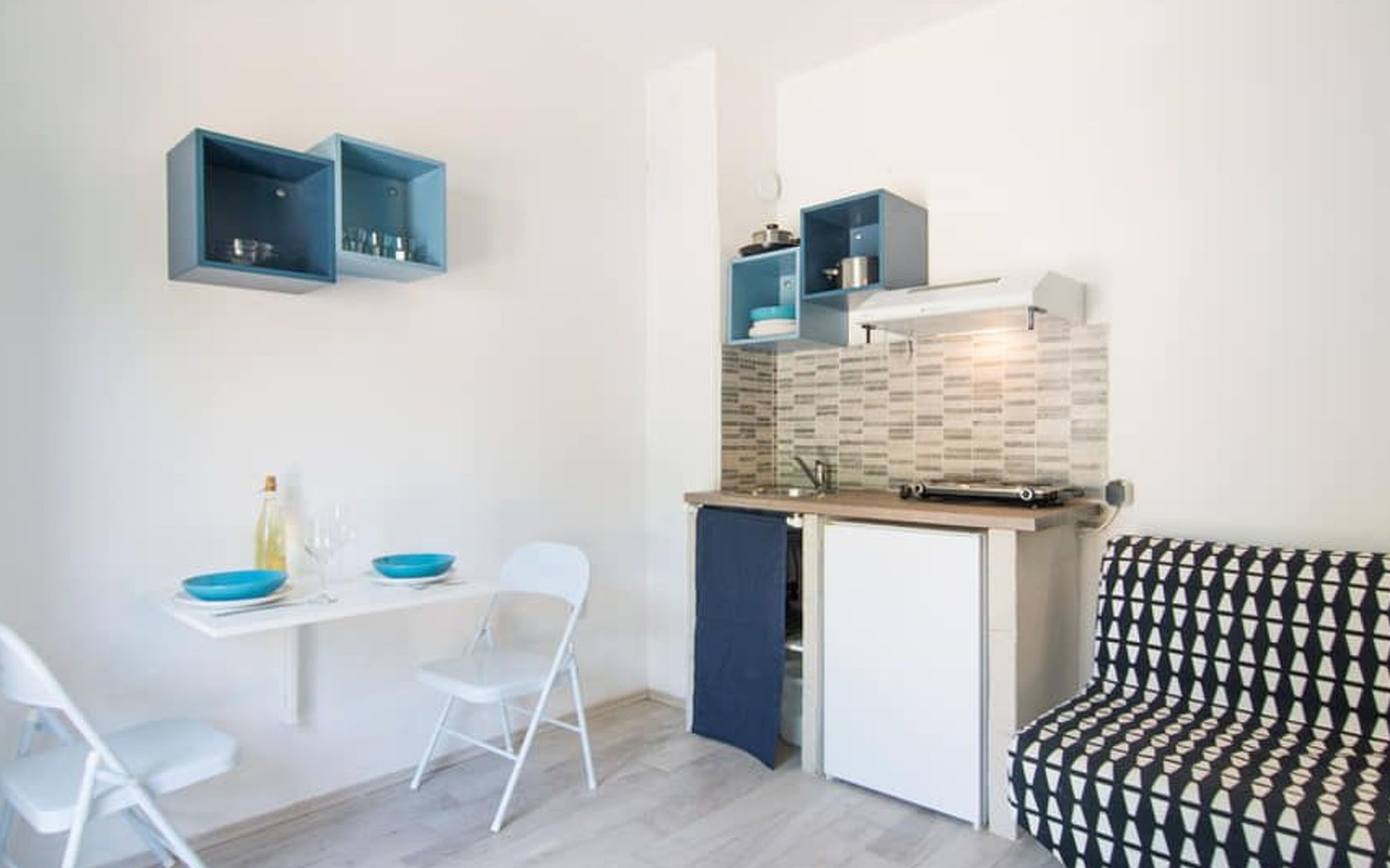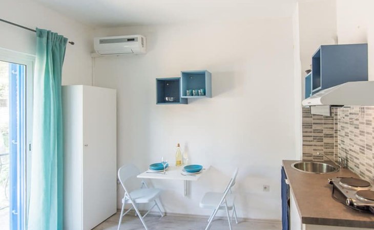 Im Inneren ist das klimatisierte Studio so ausgestattet, dass bis zu drei Gäste bequem Platz finden. Es verfügt über einen gemütlichen Schlafbereich mit einem Doppel- und einem Einzelbett, die durch Nachttische ergänzt werden. Für Ihre Habseligkeiten gibt es einen Kleiderschrank, und die Sitzecke ist mit einem Tisch und zwei Stühlen ausgestattet, um sich zu entspannen oder die Aktivitäten des Tages zu planen. Außerdem verfügt das Studio über eine funktionale Kochnische und einen Esstisch, und das Badezimmer ist mit einer Dusche, einem Waschbecken und einer Toilette gut ausgestattet. Ein Wi-Fi-Zugang sorgt dafür, dass die Gäste in Verbindung bleiben.