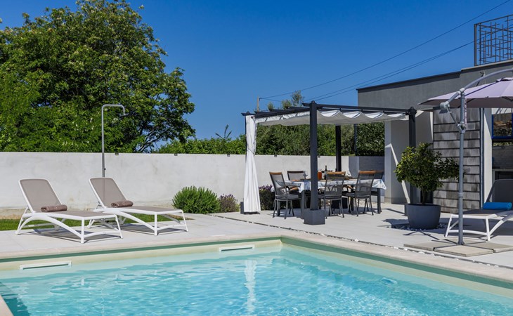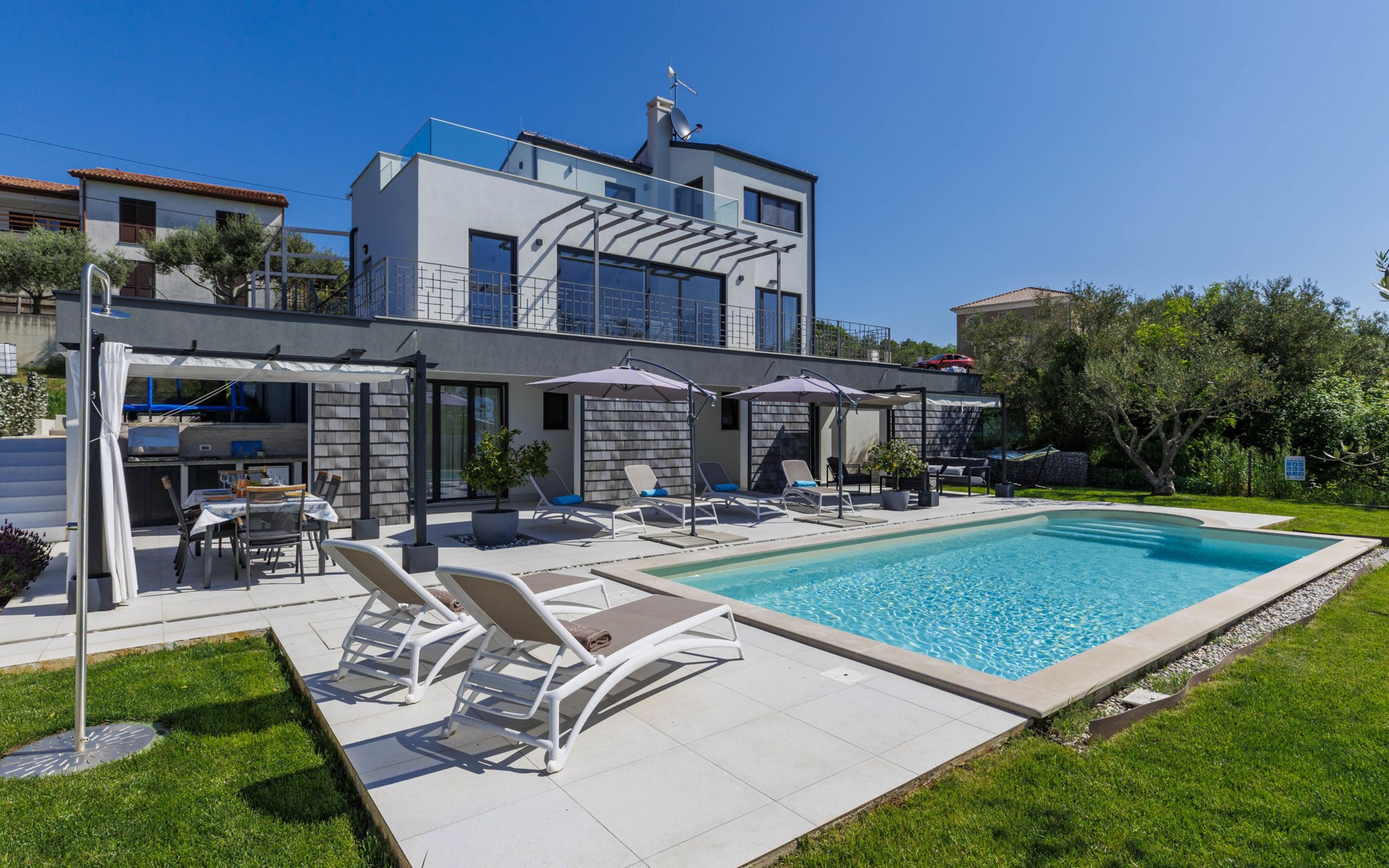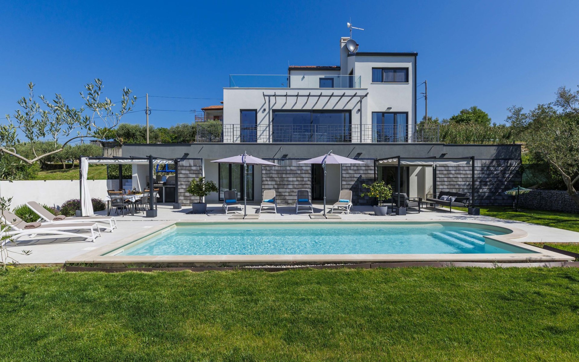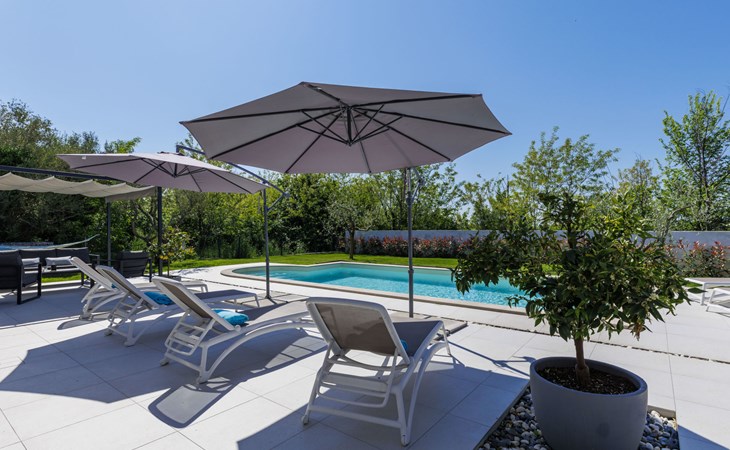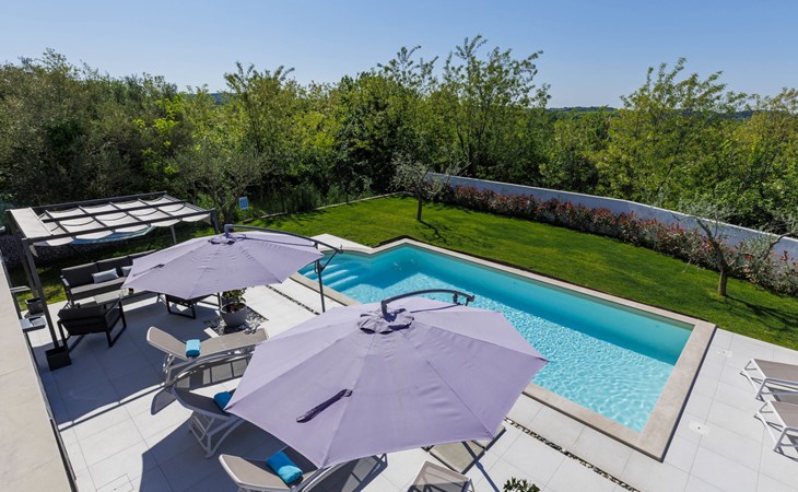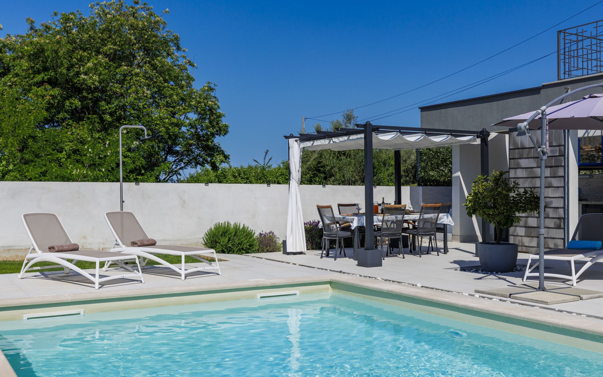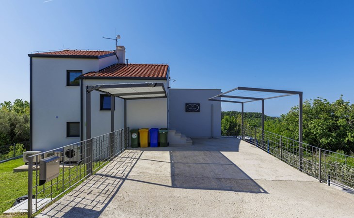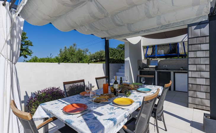 Schönes Einfamilienhaus "Villa Sonja". Ausserhalb des Ortes, 1 km vom Zentrum von Buje, sonnige Lage, 12 km vom Meer. Zur Alleinbenutzung: Grundstück 500 m2, Garten mit Rasen, Schwimmbad eckig (8 x 4 m, 150 cm tief, saisonale Verfügbarkeit: 01.Mai. - 31.Okt.) mit Innentreppe und Salzelektrolyse-Reinigungssystem. Aussendusche, Tischtennis, Grill, Kinderspielplatz (Rutschbahn, Schaukel), Poolpflege durch den Besitzer/Gärtner. Im Hause: Internetzugang, Trampolin, Waschmaschine, Wäschetrockner. Parkplatz (für 2 Autos) beim Haus auf dem Grundstück. Einkaufsgeschäft 1 km, Supermarkt 1 km, Restaurant 2 km, Bushaltestelle 800 m, Kieselstrand 12 km, Felsstrand 12 km. Golfplatz (18 Loch) 18 km, Wanderwege ab Haus 200 m, Radweg 250 m. Der Besitzer akzeptiert keine Jugendgruppen. Das veranstalten von Feiern ist nicht gestattet.