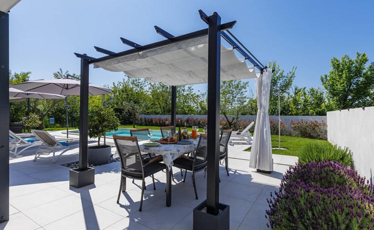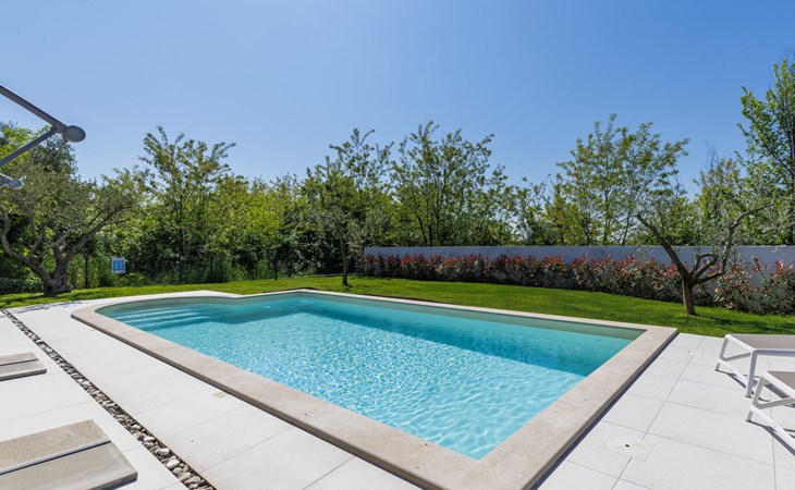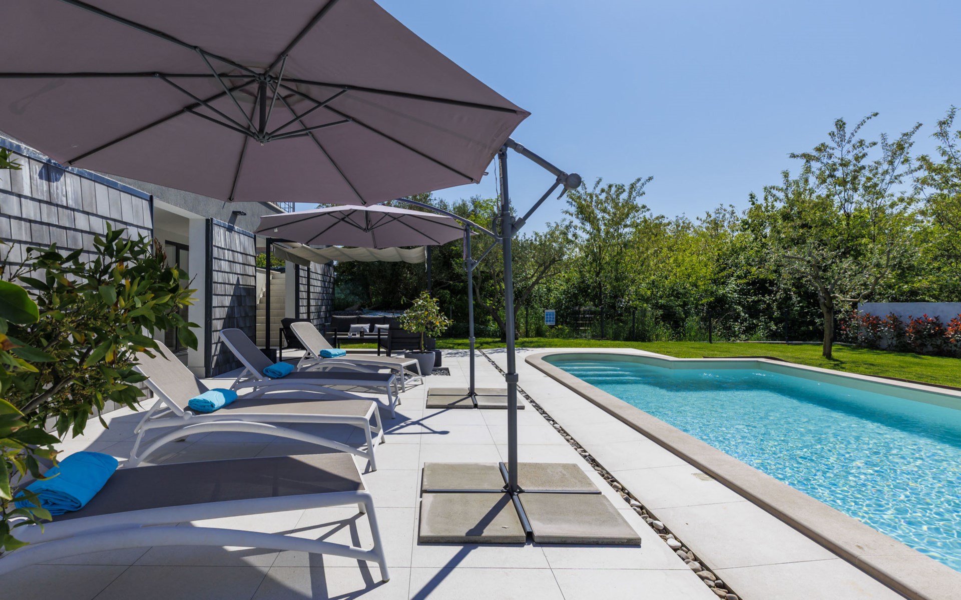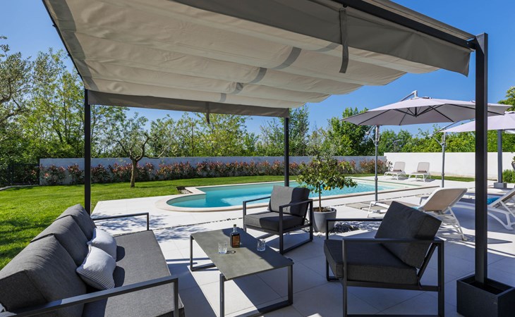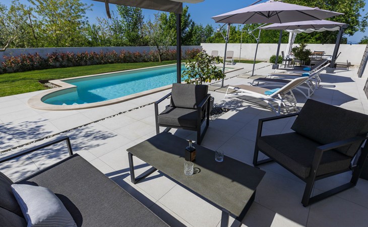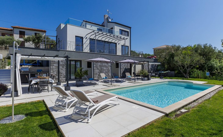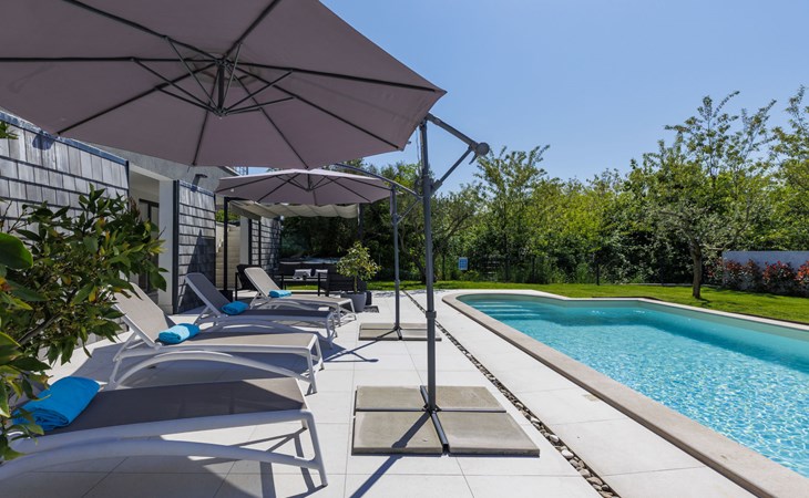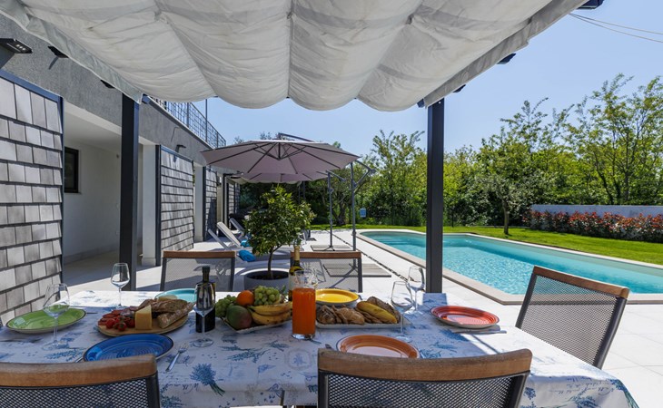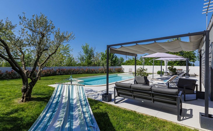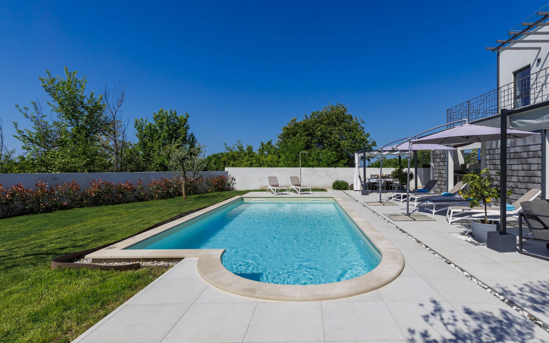 Schönes Einfamilienhaus "Villa Sonja". Ausserhalb des Ortes, 1 km vom Zentrum von Buje, sonnige Lage, 12 km vom Meer. Zur Alleinbenutzung: Grundstück 500 m2, Garten mit Rasen, Schwimmbad eckig (8 x 4 m, 150 cm tief, saisonale Verfügbarkeit: 01.Mai. - 31.Okt.) mit Innentreppe und Salzelektrolyse-Reinigungssystem. Aussendusche, Tischtennis, Grill, Kinderspielplatz (Rutschbahn, Schaukel), Poolpflege durch den Besitzer/Gärtner. Im Hause: Internetzugang, Trampolin, Waschmaschine, Wäschetrockner. Parkplatz (für 2 Autos) beim Haus auf dem Grundstück. Einkaufsgeschäft 1 km, Supermarkt 1 km, Restaurant 2 km, Bushaltestelle 800 m, Kieselstrand 12 km, Felsstrand 12 km. Golfplatz (18 Loch) 18 km, Wanderwege ab Haus 200 m, Radweg 250 m. Der Besitzer akzeptiert keine Jugendgruppen. Das veranstalten von Feiern ist nicht gestattet.