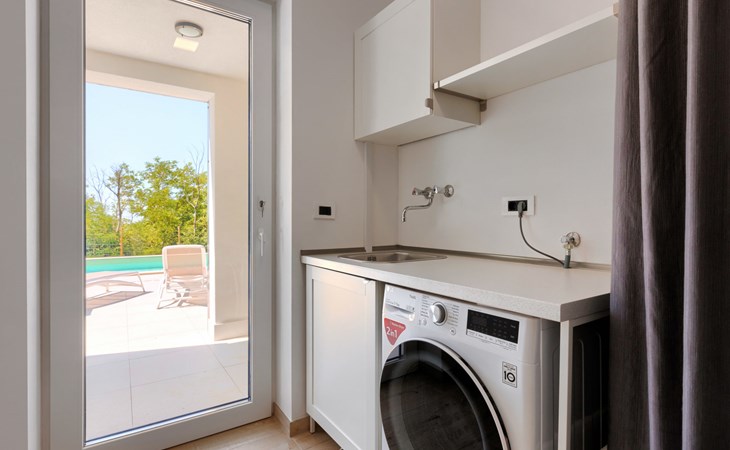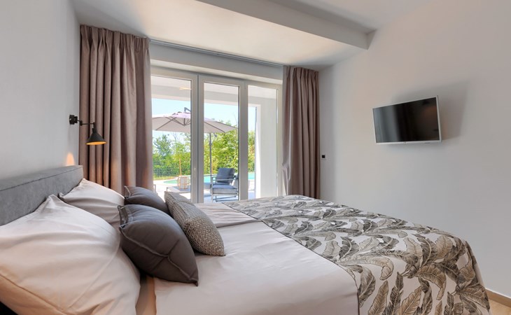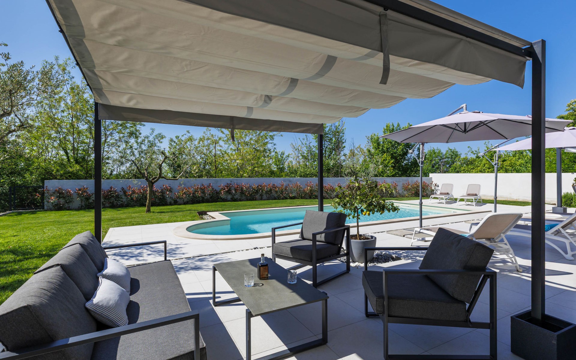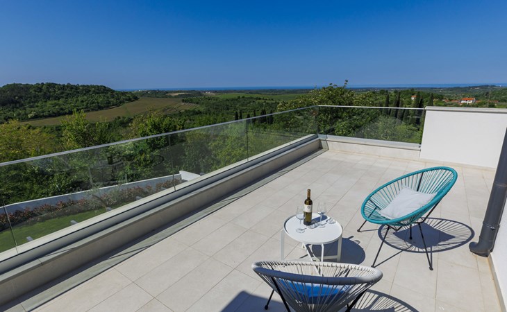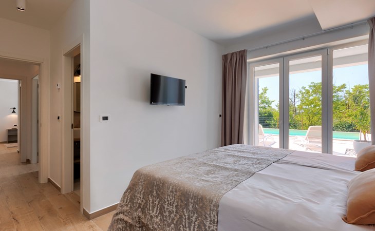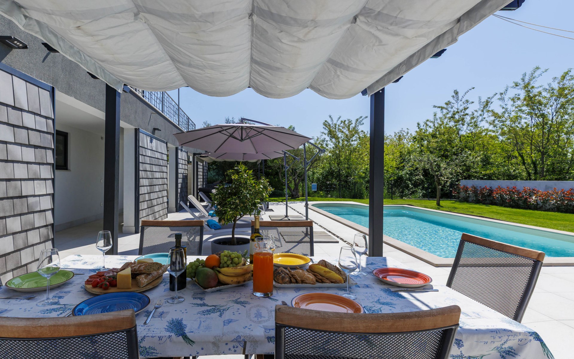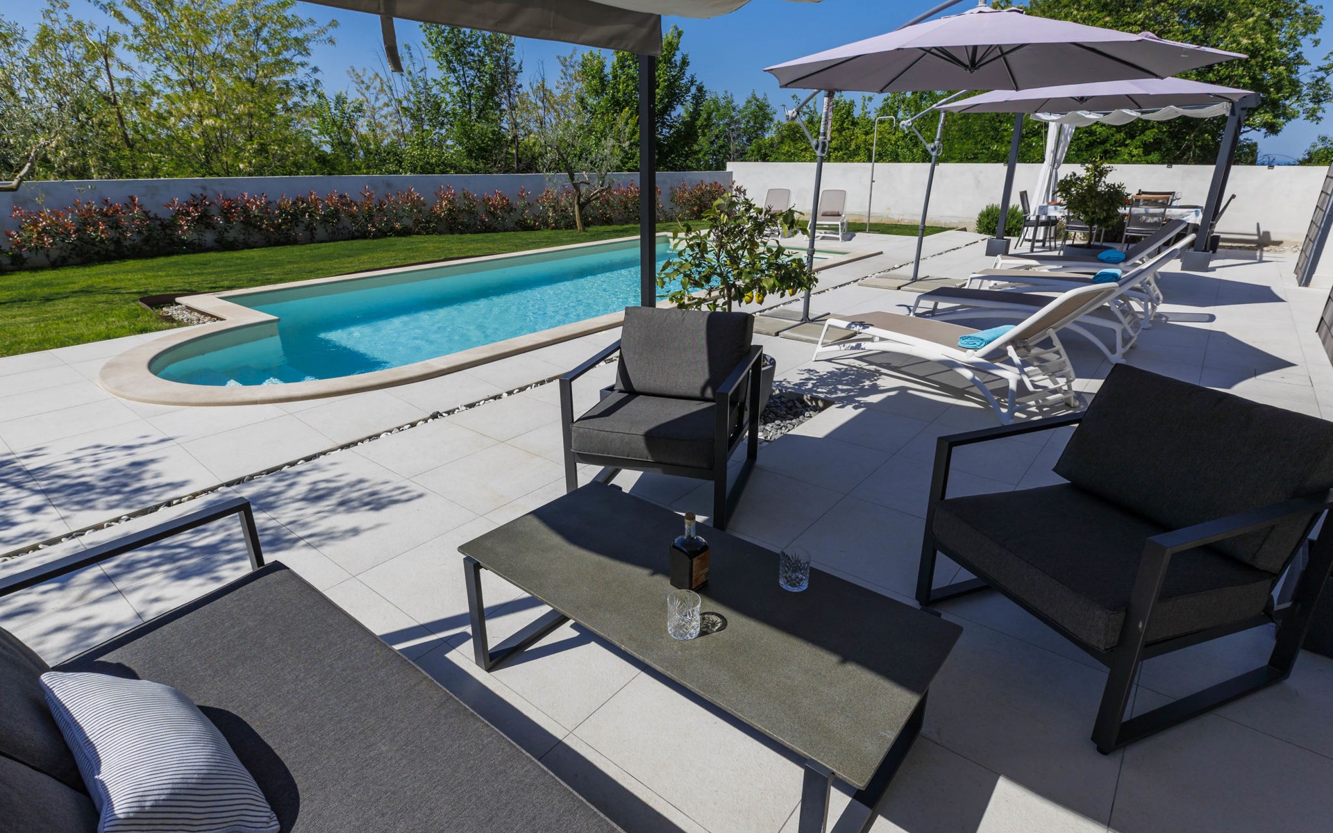 Schönes Einfamilienhaus "Villa Sonja". Ausserhalb des Ortes, 1 km vom Zentrum von Buje, sonnige Lage, 12 km vom Meer. Zur Alleinbenutzung: Grundstück 500 m2, Garten mit Rasen, Schwimmbad eckig (8 x 4 m, 150 cm tief, saisonale Verfügbarkeit: 01.Mai. - 31.Okt.) mit Innentreppe und Salzelektrolyse-Reinigungssystem. Aussendusche, Tischtennis, Grill, Kinderspielplatz (Rutschbahn, Schaukel), Poolpflege durch den Besitzer/Gärtner. Im Hause: Internetzugang, Trampolin, Waschmaschine, Wäschetrockner. Parkplatz (für 2 Autos) beim Haus auf dem Grundstück. Einkaufsgeschäft 1 km, Supermarkt 1 km, Restaurant 2 km, Bushaltestelle 800 m, Kieselstrand 12 km, Felsstrand 12 km. Golfplatz (18 Loch) 18 km, Wanderwege ab Haus 200 m, Radweg 250 m. Der Besitzer akzeptiert keine Jugendgruppen. Das veranstalten von Feiern ist nicht gestattet.