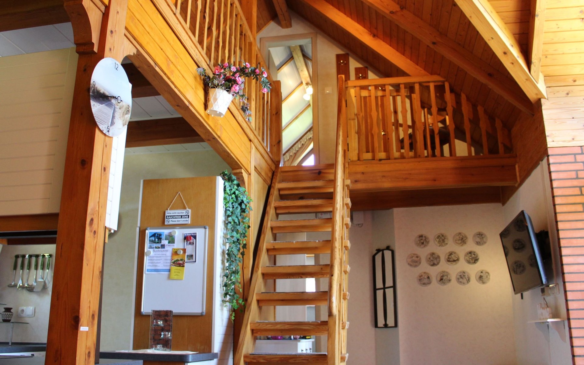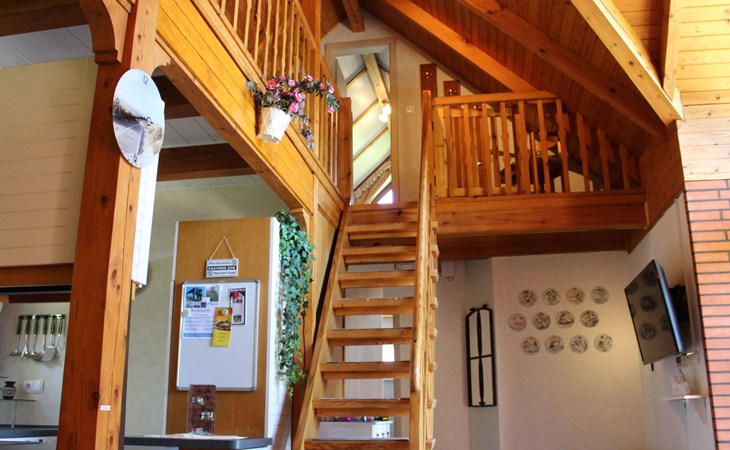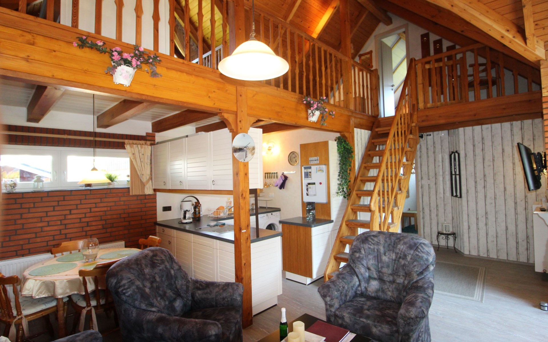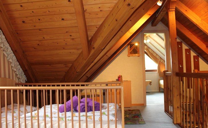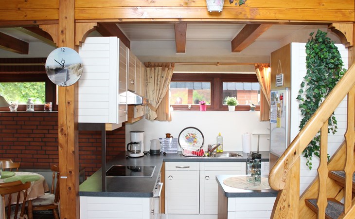 Das Ferienhaus besticht durch seine offene Bauweise mit Galerie im Wohnbereich. Im Erdgeschoß befindet sich der Wohnbereich mit Essecke offener Küche (4er Ceranfeld, Backofen, Mikrowelle, Kühlschrank mit Eisfach) und Kamin. Vom Wohnbereich erfolgt der Zugang zur Terrasse. Ebenfalls im Erdgeschoß befindet sich ein Schlafzimmer , sowie das Badezimmer. Der zweite Schlafraum befindet sich im Obergeschoß. Die Schlafräume sind mit einem Doppelbett, der andere mit zwei Einzelbetten ausgestattet . Bei Bedarf wird ein Kinderbett und ein Hochstuhl gestellt. Eine Waschmaschine ist ebenfalls vorhanden. (Gebühr!)