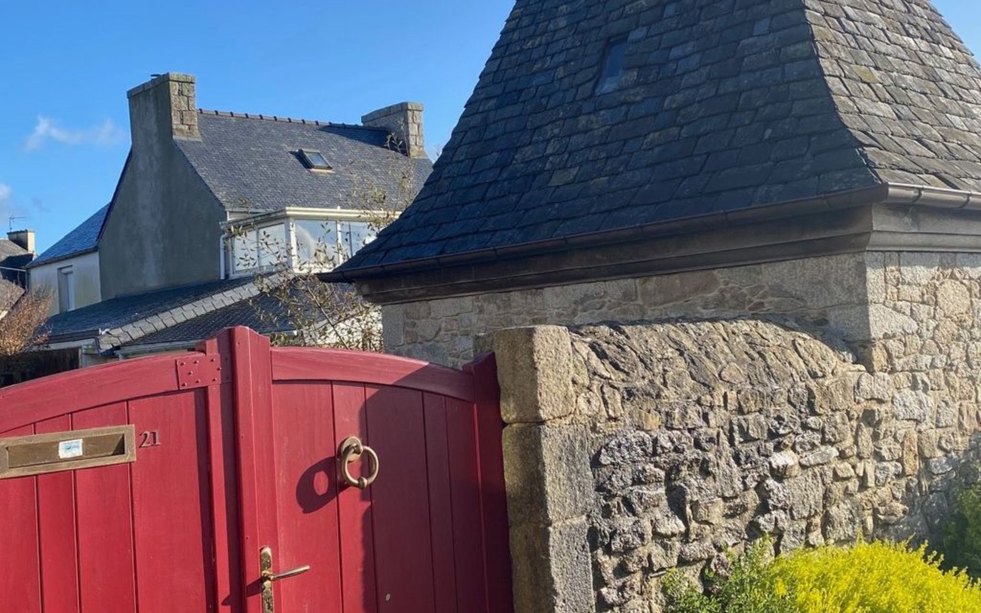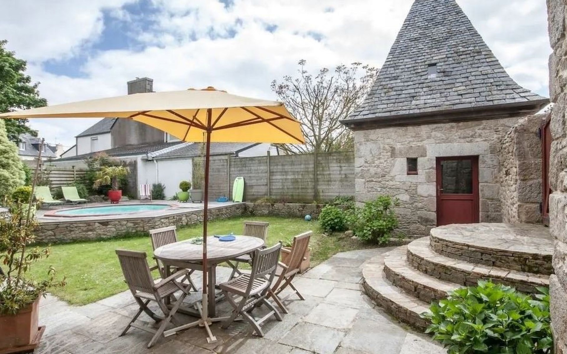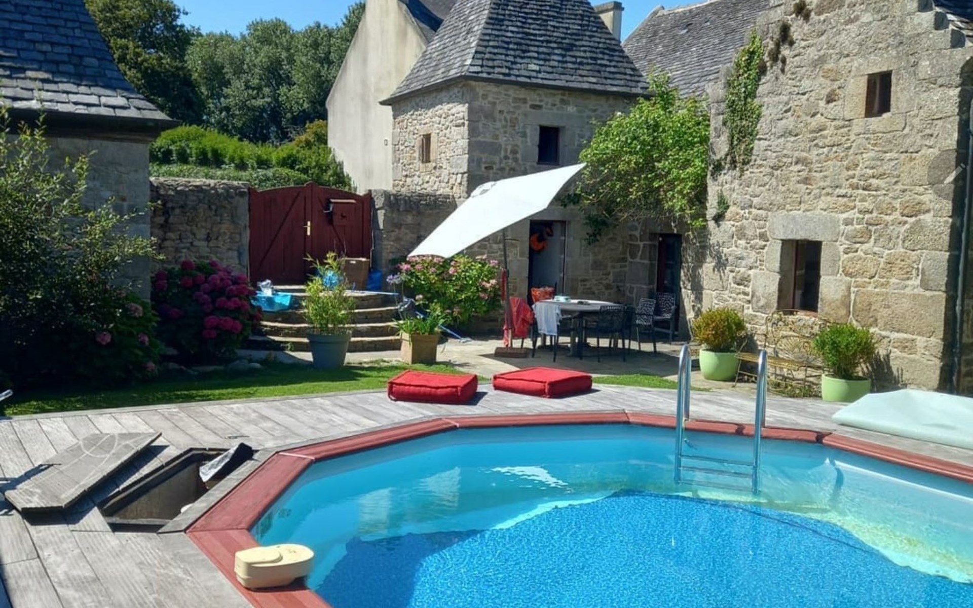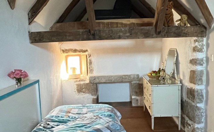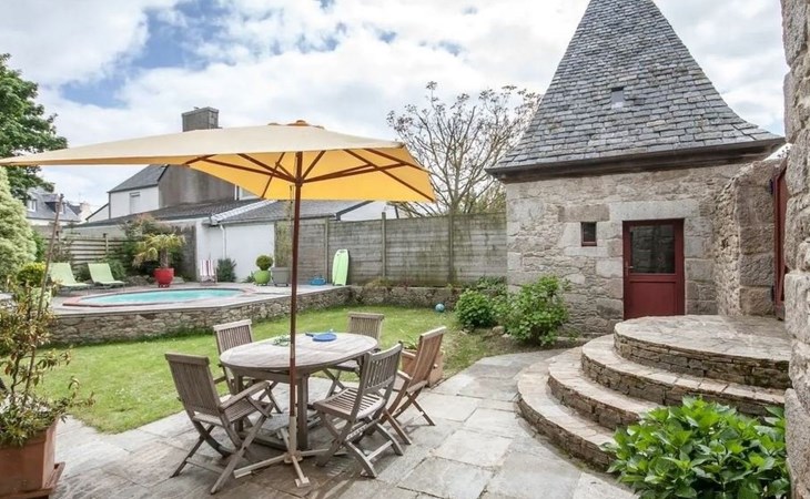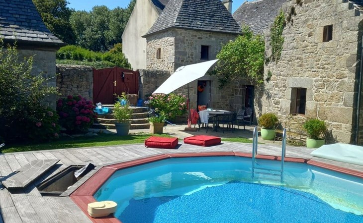 Absolut rares bretonisches Ferienobjekt: Wir bieten hier eine wirkliche seltene kleine Perle aus dem 16. Jahrhundert zur Ferienmiete an; herzig renoviert; ohne den rustikalen Charme des mittelalterlichen Leinweberhauses zu übergehen. Außen zeigt das keine Manoir die typischen Türmchen, deren Dächer so typisch mit dicken Schieferplatten gedeckt (ardoises de montagne) wurden. Eine runde Treppe führt vom Eingang (davor befindet sich Ihr privater Parkplatz) in den kleinen Innenhof (total eingezäunt) des mittelalterlichen kleinen Anwesens - in dem sich eine etwas erhöhte Holz -Terrasse befindet und in die ein kleiner runden Pool eingelassen wurde - dieser ist immer auf 28°C geheizt von 1. Mai bis 15.Oktober und 5 m breit und 1,30m tief. Wenn Sie in das Kleinod eintreten sehen Sie dicke Granit-Mauern, kleine Fensterchen und den riesigen mittelalterlichen offenen mannshohen Kamin, dicke Stützbalken aus Eiche; und sogar den alten Granit-Futtertrog der noch erhalten ist. Die Stufen der betagten Granittreppe zum OG sind über die Jahrhunderte rund abgeschliffen worden. Das kleine rustikale Manoir ist wirklich sehr gemütlich - und den schönen Kamin kann man nicht nur mit den Augen bestaunen, sondern hüllt das ganze kleine Manoir in den typischen rauchigen Duft eines über 500 Jahre alten Hauses – wie früher eben! Die Küche ist natürlich modern; sowie die Dusche im EG, das Gäste WC ; und das geschmackvolle Bad (mit Eck-Wanne). Im OG befinden sich 2 schöne Schafzimmer mit Doppelbetten für max. 4 Erwachsene - im Kinderzimmer finden zusätzlich noch maximal 2 Kinder unter 12 Jahren Platz.