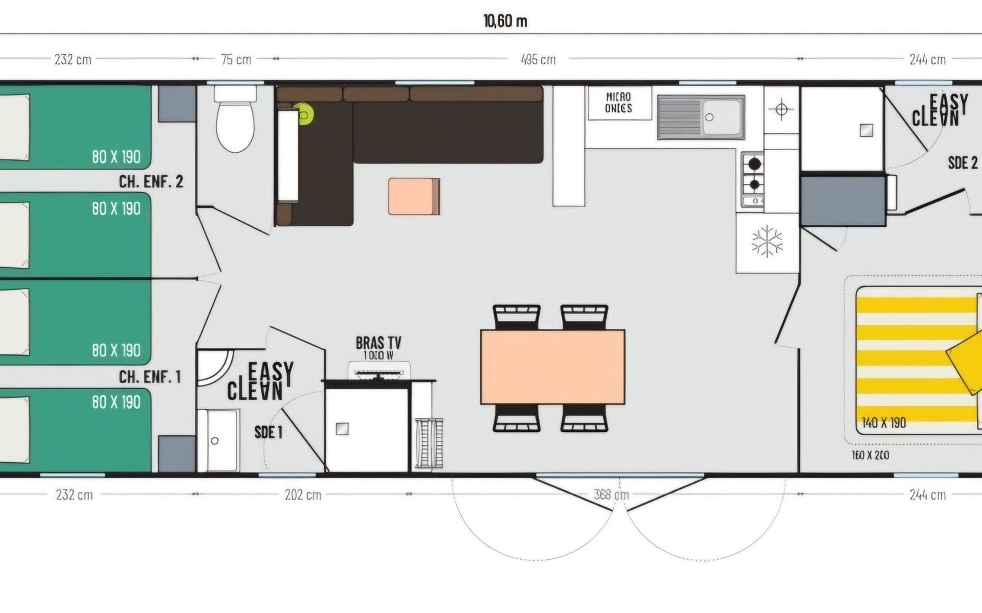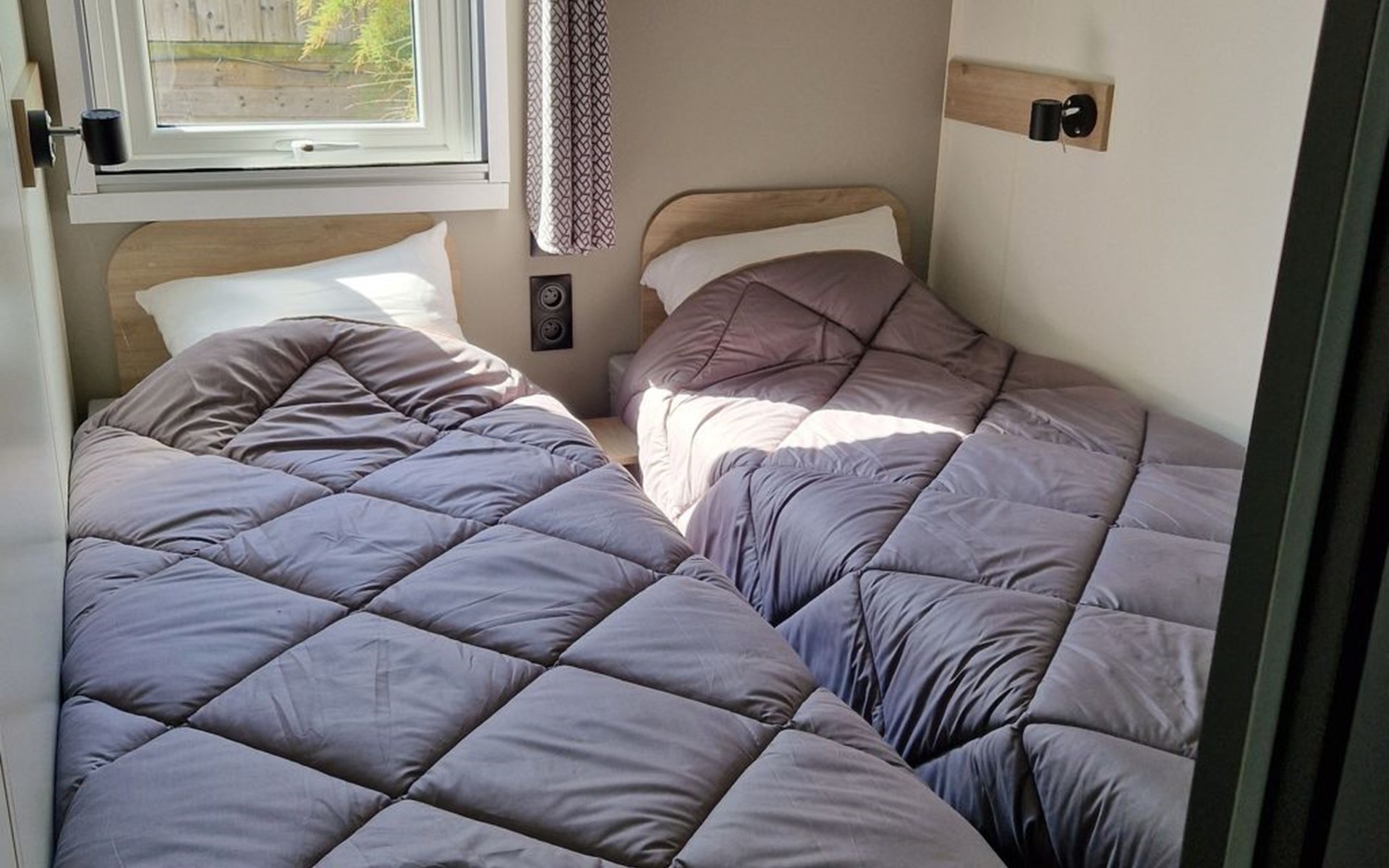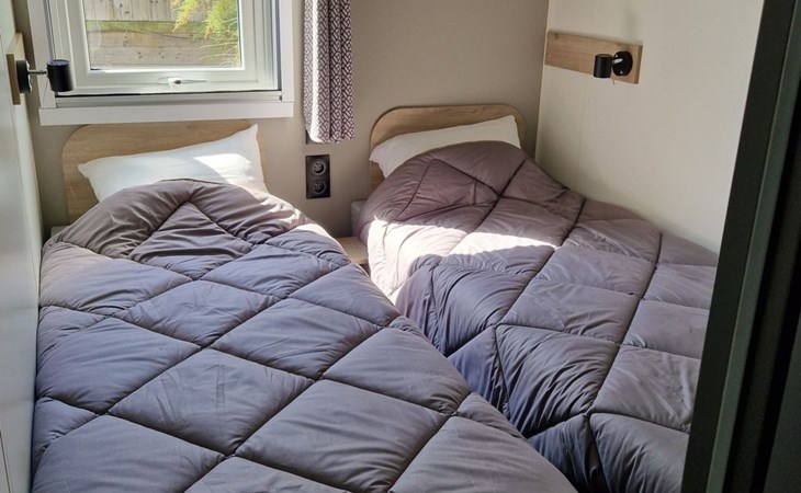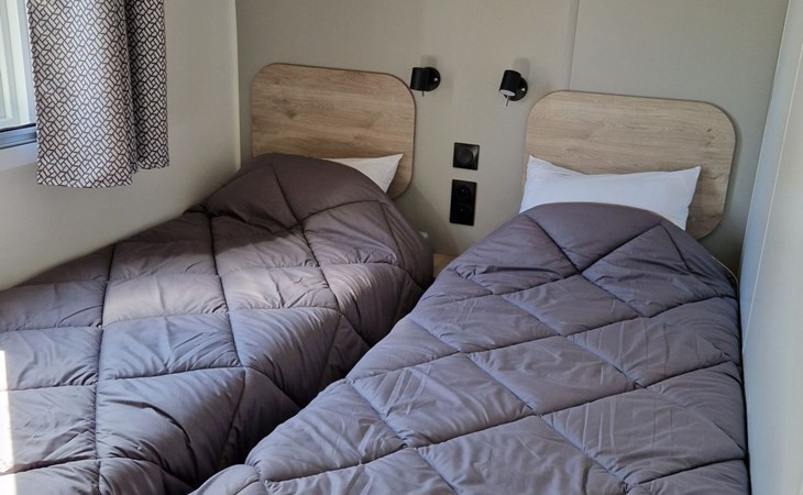 Die Schlafzimmer sind mit Moskitonetzen, Verdunkelungsvorhängen, Bettdecken und Kopfkissen ausgestattet (1 Schlafzimmer mit einem 160 cm breiten Bett und 2 Schlafzimmer mit 4 80 cm breiten Betten).
